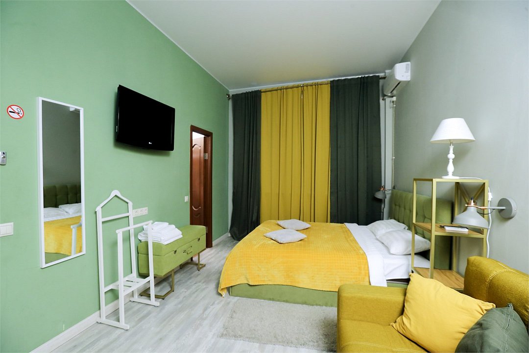 Wi-Fi, кондиционер, электронные замки, микроволновая печь, душевая кабина, санузел, тапочки, кровать «King size», кресла, тумбы, чайник, унитаз, вид на город, кулер на этаже, вид во двор, телевизор с плоским экраном, мини-холодильник, гостиничная парфюмерия, без питомцевВ номере