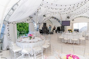 Читать полностьюУютный зал площадью около восемьдесят квадратных метров, оформленный в сдержанных благородных тонах и с продуманным зонированием: выделены общая и танцевальная зоны. Лаконичный интерьер создает атмосферу легкости и изящества.
