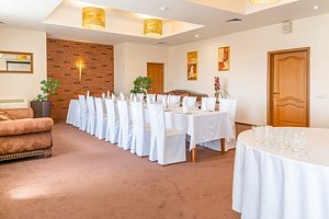 Зал комфортно вмещает до тридцати гостей при банкетной рассадке и до пятидесяти при фуршетном формате, прекрасно подходя для камерных мероприятий и торжеств.