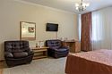 Уютный и функциональный трехкомнатный номер, выполненный в тёплых бежевых и бордовых тонах. Здесь есть все необходимое для комфортного отдыха и работы.