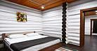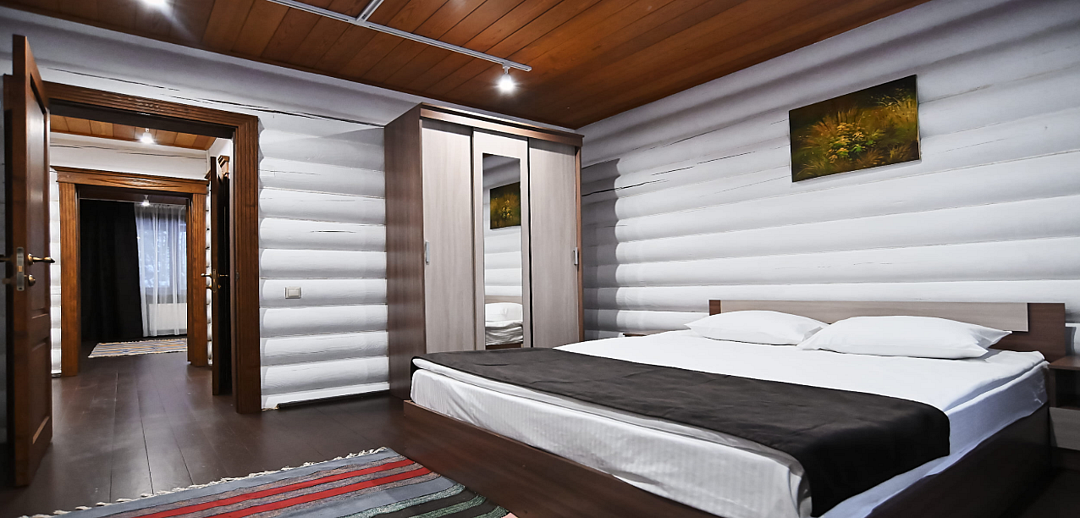 Номер оснащен гостиной с мягкой мебелью и рабочим столом, двумя спальными комнатами с одной большой кроватью с удобным матрацем, двумя ванными комнатами. Из больших панорамных окон открывается вид на хвойный лес или на живописную территорию клуба.