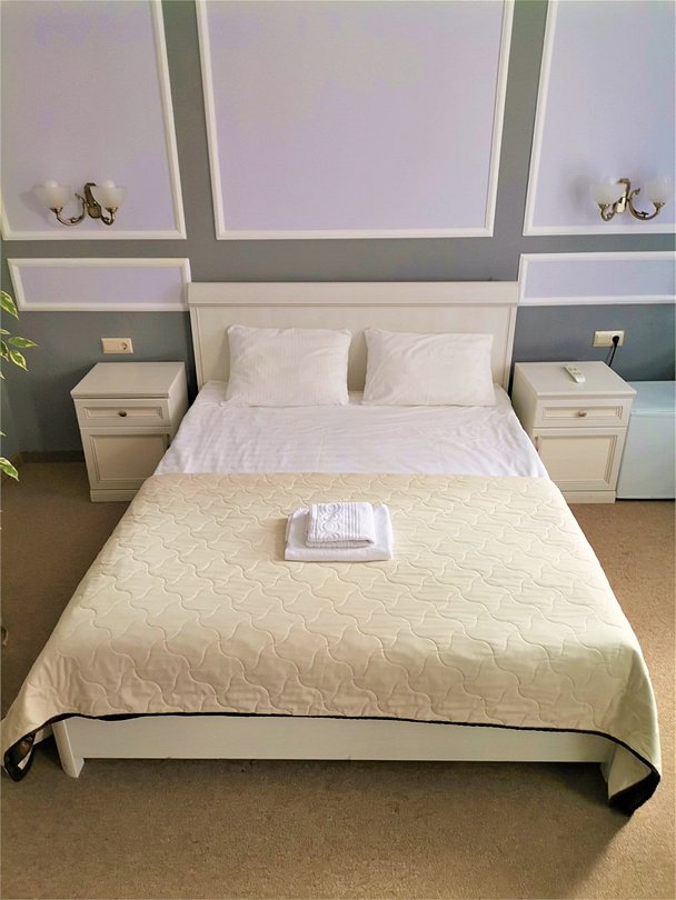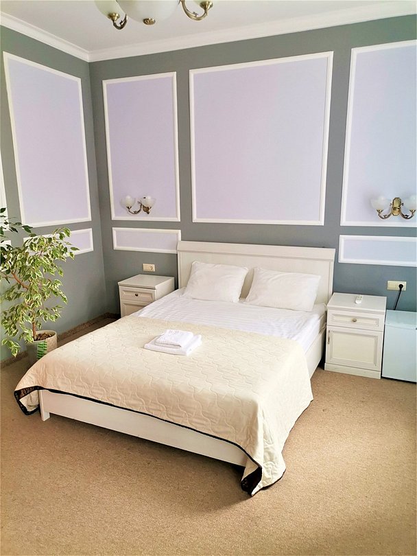 Просторный номер повышенной комфортности, оснащенный одной двуспальной кроватью или двумя односпальными кроватями (по запросу). В номере есть все для комфортного отдыха. Телевизор, мини-холодильник, чайник, фен, комплект полотенец, тапочки, косметический разовый набор (гель, шампунь). Бесплатная сеть WI-FI. В общественной зоне кулер и микроволновая печь.Услуги и удобства