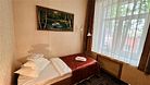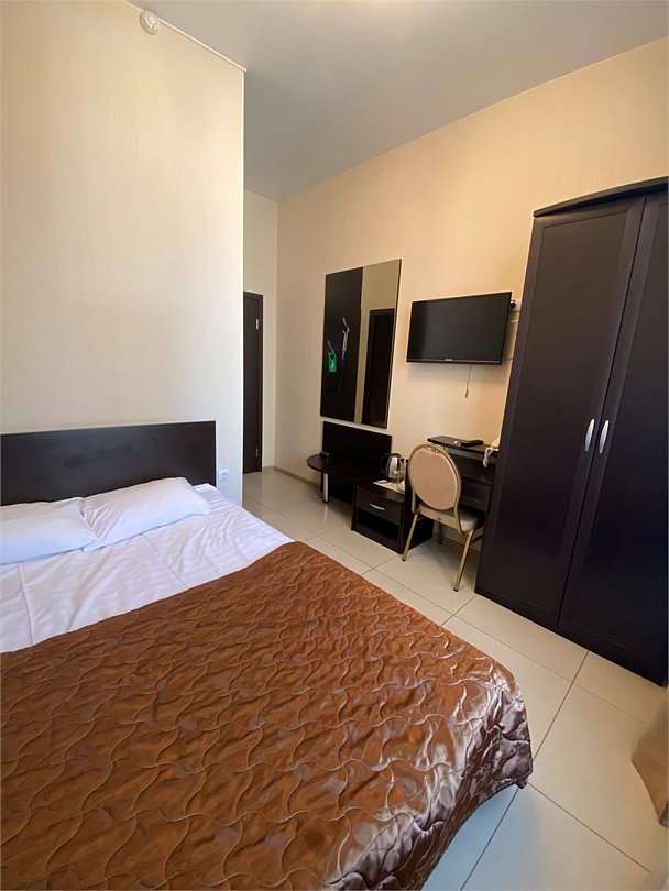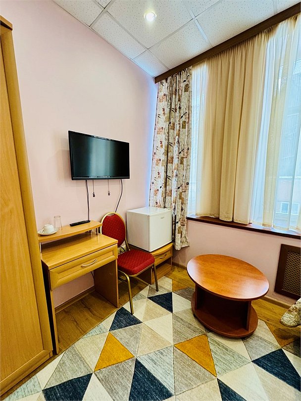 Уютный однокомнатный номер, состоящий из небольшой прихожей и спальной комнаты. В номере удобная современная мебель, широкая кровать (по запросу) или две односпальные кровати, а так же организованное рабочее пространство с письменным столом. В номере мини-холодильник, телевизор. Бесплатная сеть WI-FI. Подходит для размещения 1-2 человек.На этаже есть кулер с горячей и холодной водой и микроволновая печь.Услуги и удобства