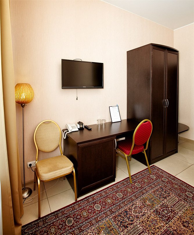 телевизор, Wi-Fi, настольные лампы, фен, электронные замки, ванна или душевая кабина, санузел, банные полотенца, тапочки, гигиенические средства, две односпальные или большая двуспальная кровать, шкаф для одежды, вешалки, зеркало, мебельный гарнитур, чайный набор, чайник, питьевая вода, ковровое покрытие, отопление, кулер на этаже, вид во двор, ламинат, стул, гостиничная парфюмерия, номер для некурящих, без питомцевВ гостиничном номере