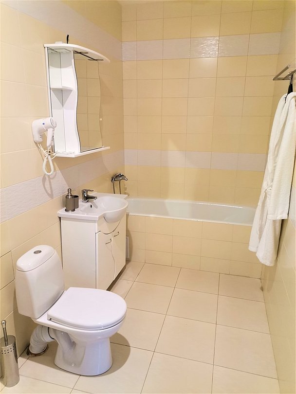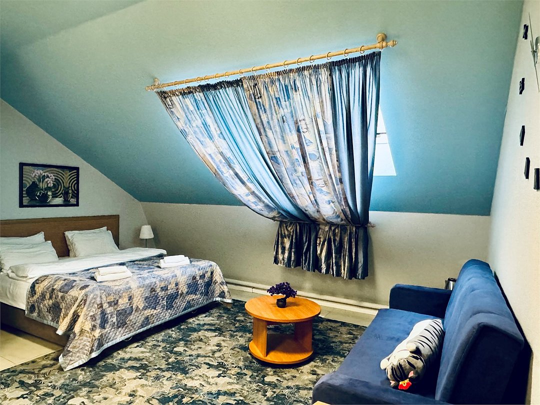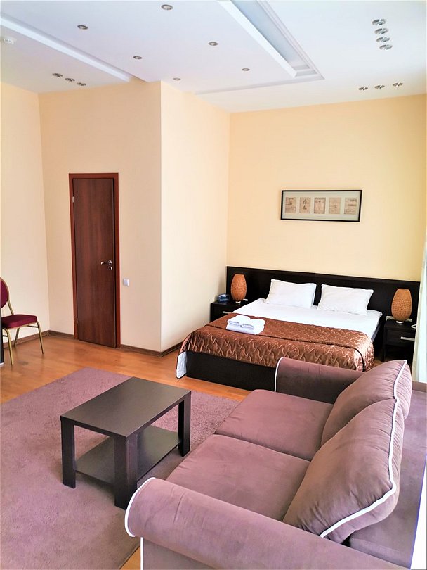 Просторный номер-студия состоит из двух зон - гостиной и спальни.В номере есть все необходимое для комфортного отдыха и работы (вентилятор телевизор ЖК, чайник,сейф в ванной комнате фен).Бесплатная сеть WI-FI. Прекрасное решение для пары или семьи из трех человек.Услуги и удобства