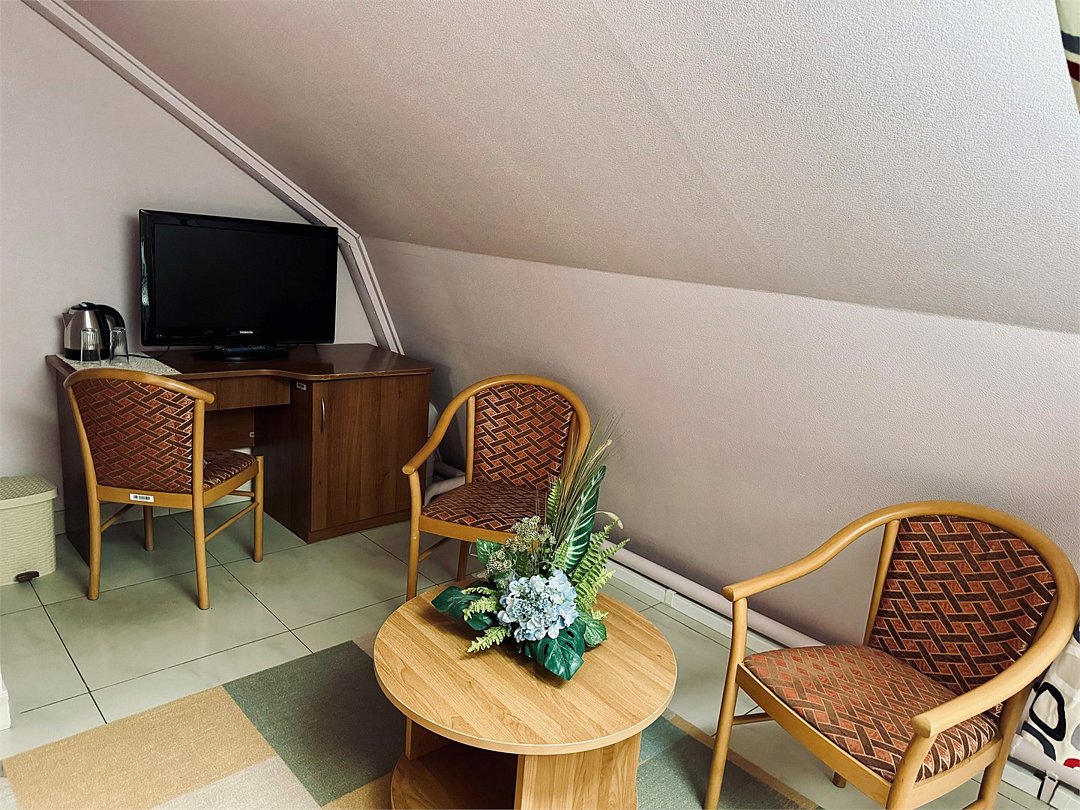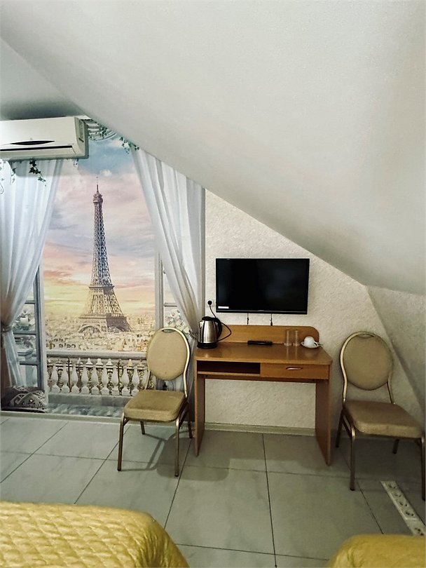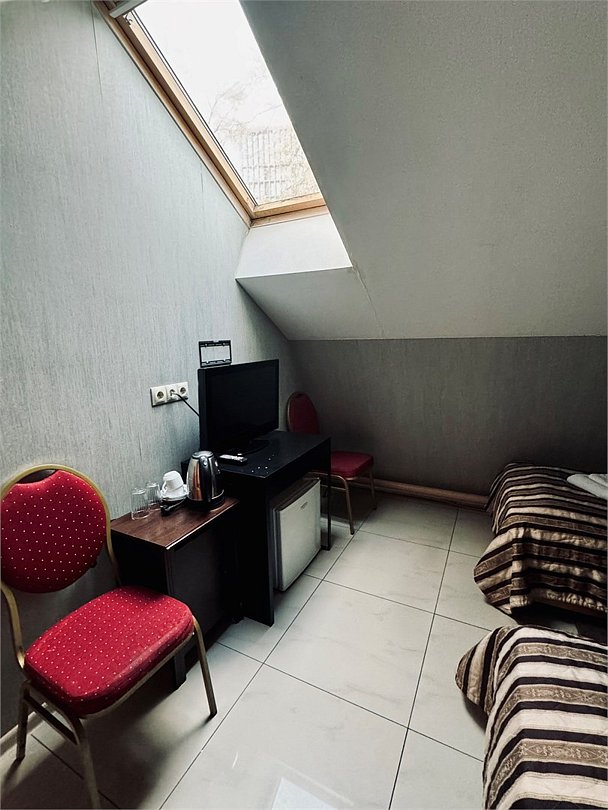 телевизор, Wi-Fi, настольные лампы, фен, душевая кабина, ванна или душевая кабина, банные полотенца, тапочки, двуспальная кровать, односпальная кровать, кресла, тумбы, журнальный столик, письменный стол, багажная тумба, ковер, чайный набор, чайник, унитаз, раковина, плиточное покрытие, стаканы, стул, туалетные средства, туалет, мини-холодильник, шкаф-купе, гостиничная парфюмерия, мансардные окна, вешалки-плечики, можно с питомцамиВ гостиничном номере