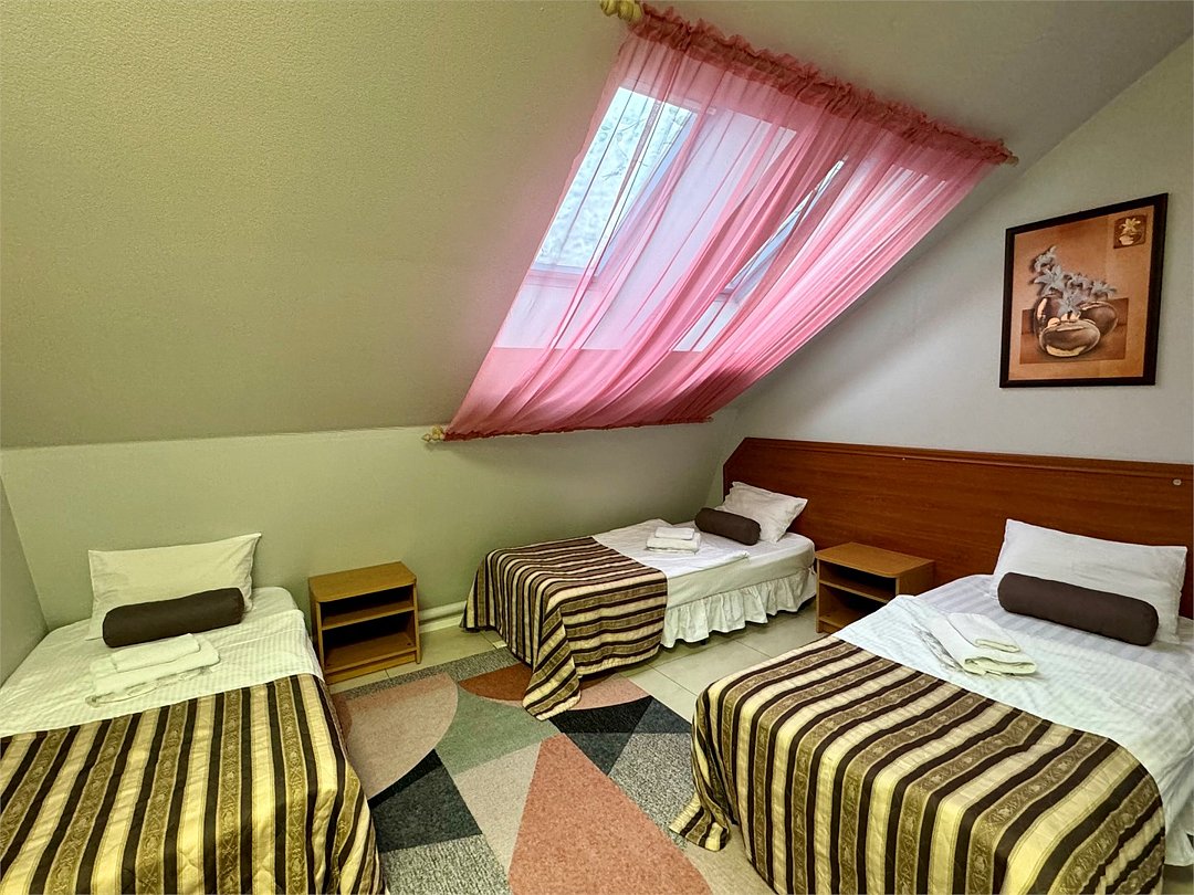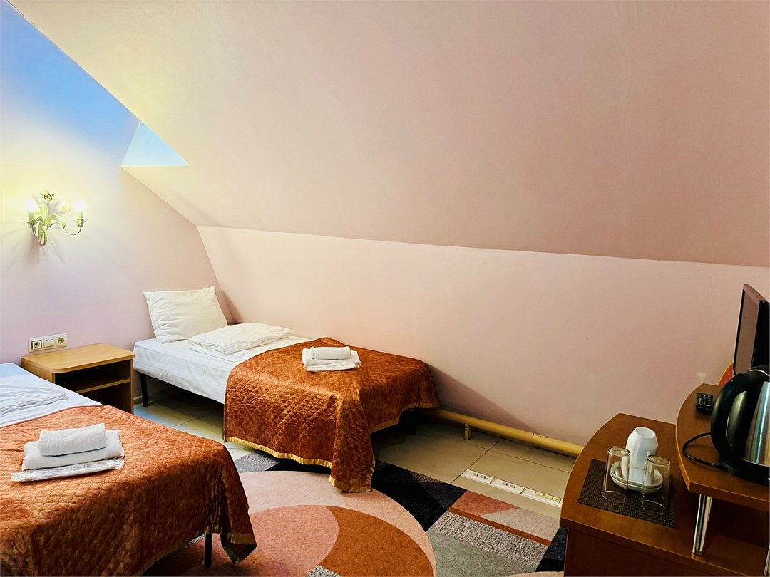 телевизор, Wi-Fi, фен, душевая кабина, тапочки, тумбы, стулья, шкаф для одежды, вешалки, багажная тумба, зеркало, ковер, унитаз, раковина, отопление, кулер на этаже, три односпальные кровати, вид во двор, стаканы, туалетный столик, мини-холодильник, гостиничная парфюмерия, мансардные окна, номер для некурящих, уборка номера, вешалки-плечики, прачечная (за дополнительную плату), можно с питомцамиВ гостиничном номере