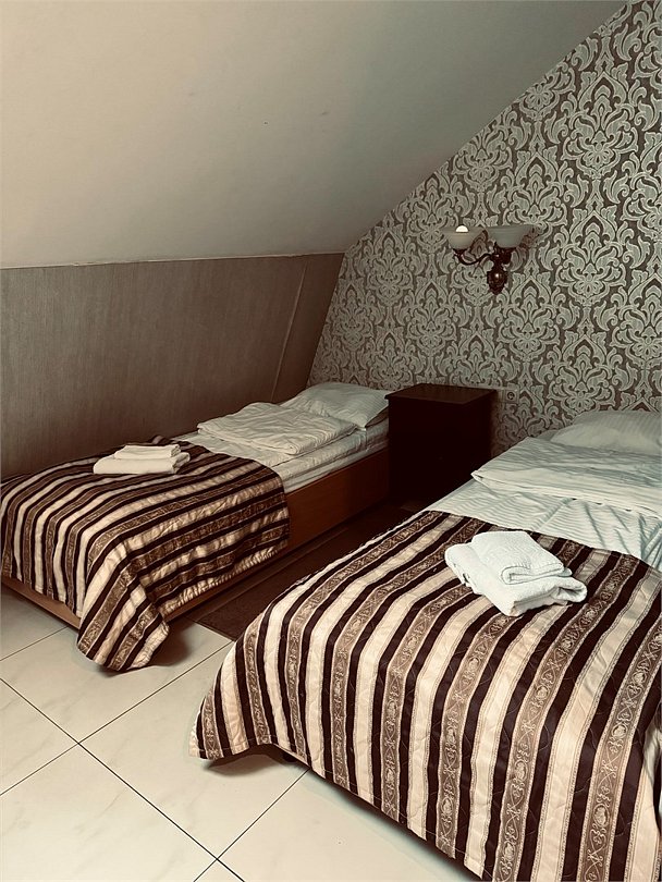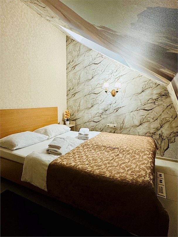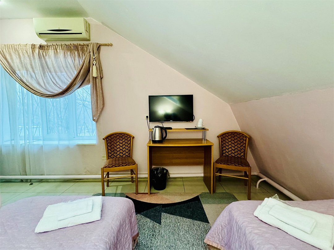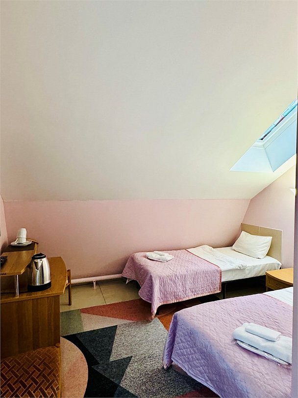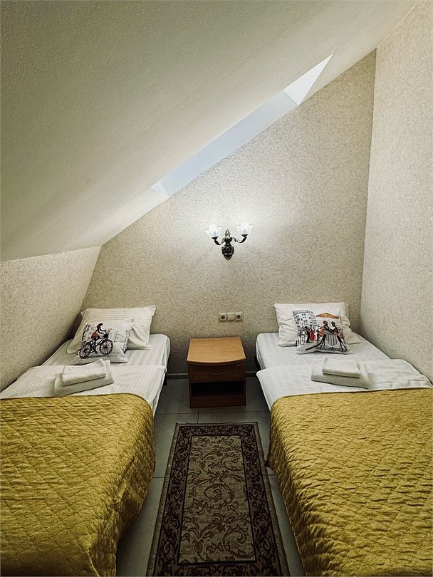 Двухместный номер. Подойдет для гостей у которых в приоритете не размер номера а атмосфера! Каждый номер выполнен в индивидуальном стиле. Номере мансардное окно, две односпальные кровати, тумбочка, встроенный шкаф с зеркалом, стол, телевизор, чайник, кондиционер. В ванной комнате душевая кабина, фен, комплект полотенец, косметический набор разовый (шампунь, гель для душа) тапочки. Все номера данной категории расположены на 4 этаже. Лифт отсутствует.Услуги и удобства