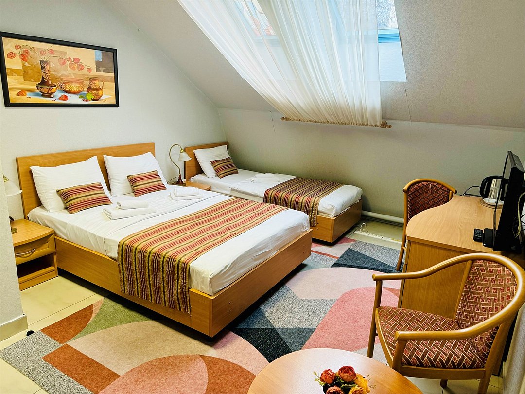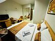 Уютный комфортный Семейный номер идеально подойдет для путешествий с семьей. Номер оборудован всем необходимым для отдыха. В вашем распоряжении будут одна двуспальная кровать и одна односпальная кровать, просторный шкаф-купе, два кресла и журнальный столик. Чайник с чайной парой, мини-холодильник и телевизор ЖК, WI-FI.Услуги и удобства