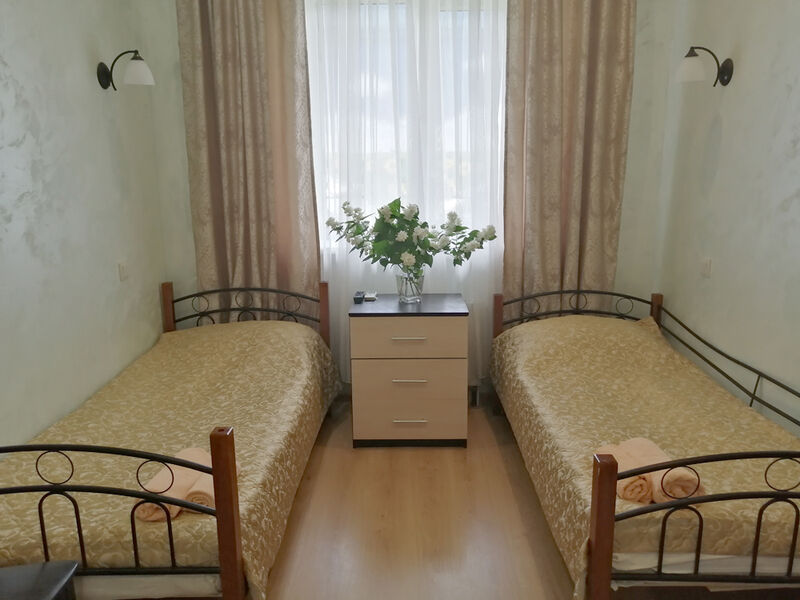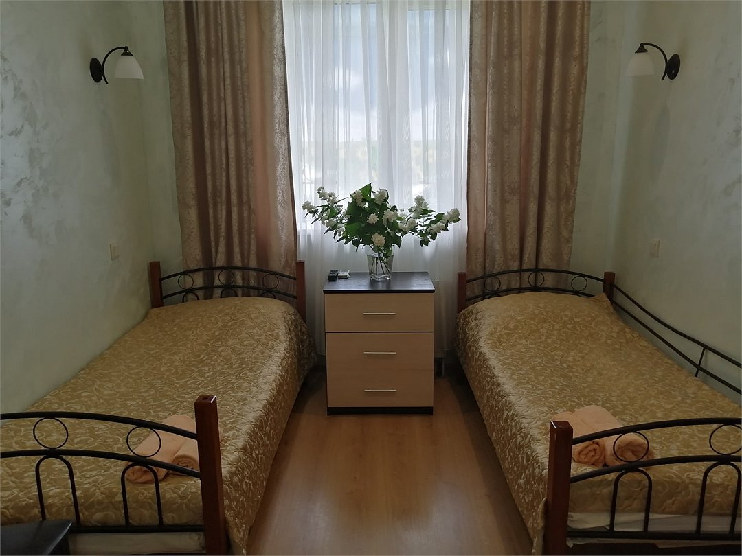 кабельное телевидение, Wi-Fi, холодильник, кондиционер, светильник, фен, система безопасности, ванная комната, душевая кабина, санузел, банные полотенца, тапочки, две односпальные кровати, стулья, шкаф для одежды, вешалки, зеркало, комод, обслуживание номеров, чайник, раковина, питьевая вода, отопление, вид во двор, ламинат, высокие потолки, столовые приборы, стол, туалетные средства, телевизор с плоским экраном, можно с питомцамиВ номере