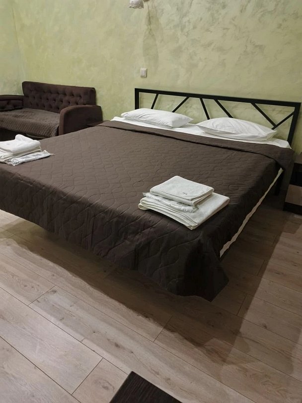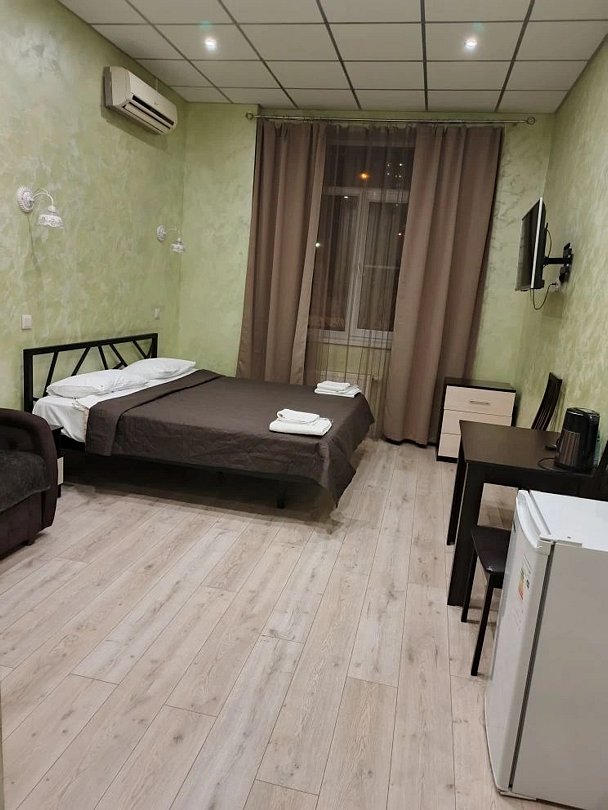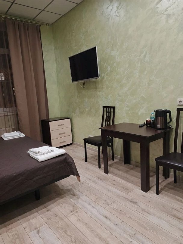 Путешествие с семьейНормальный отельВ отеле проживали одну ночь. Номер большой, чистый, тёплый. На стене плазма. Имеется холодильник, чайник, 2 бутылки 0,5 воды, на общей кухне в отеле можно заварить чай ( макетированный и даже в чайничке листовой,), кофе , сахар, есть микроволновка, вода а больших бутылках. Есть одноразовые тапки, достаточно чистых полотенец, наборы для мытья ( шампунь, гель для душа). Кровать удобная, диван большой, раскладывался , можно на двух человек. Рекомендую.