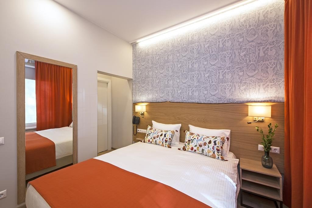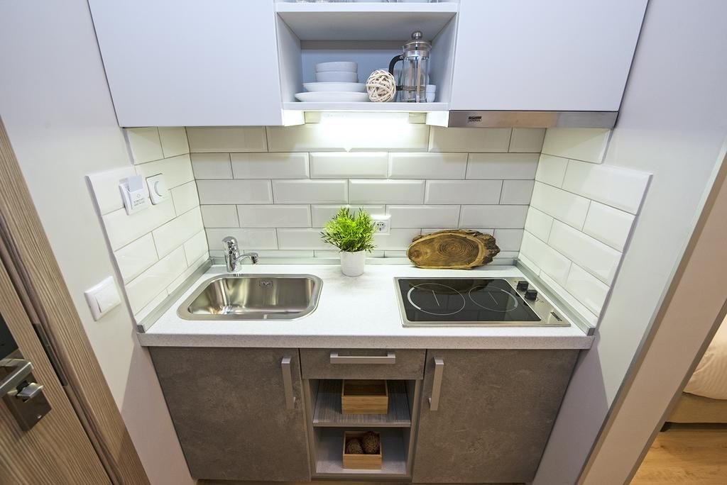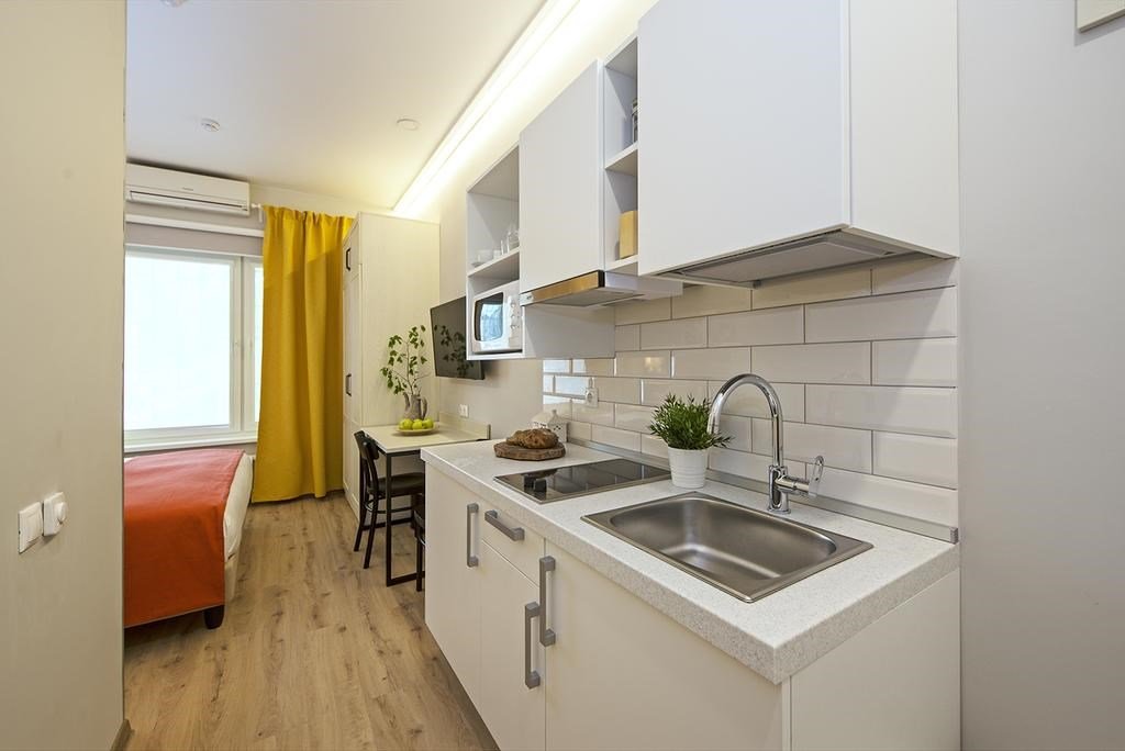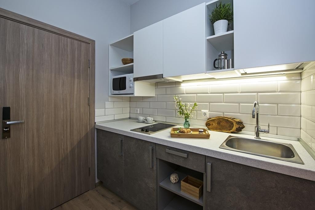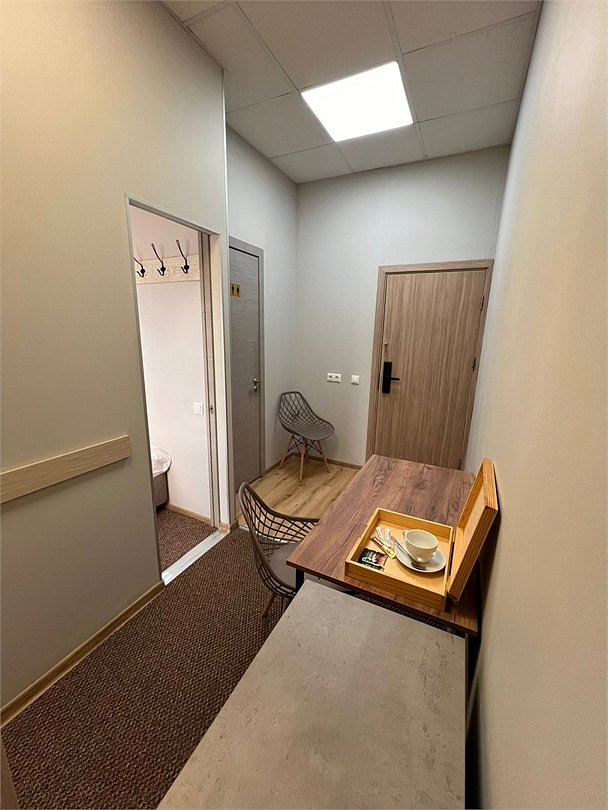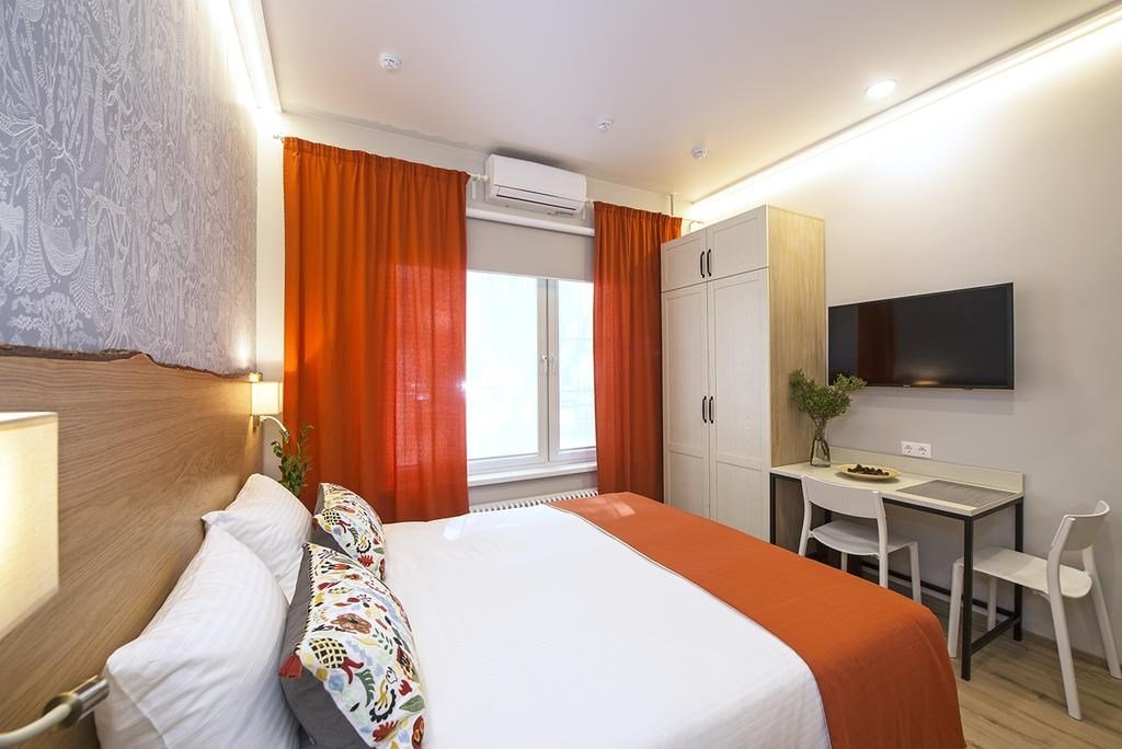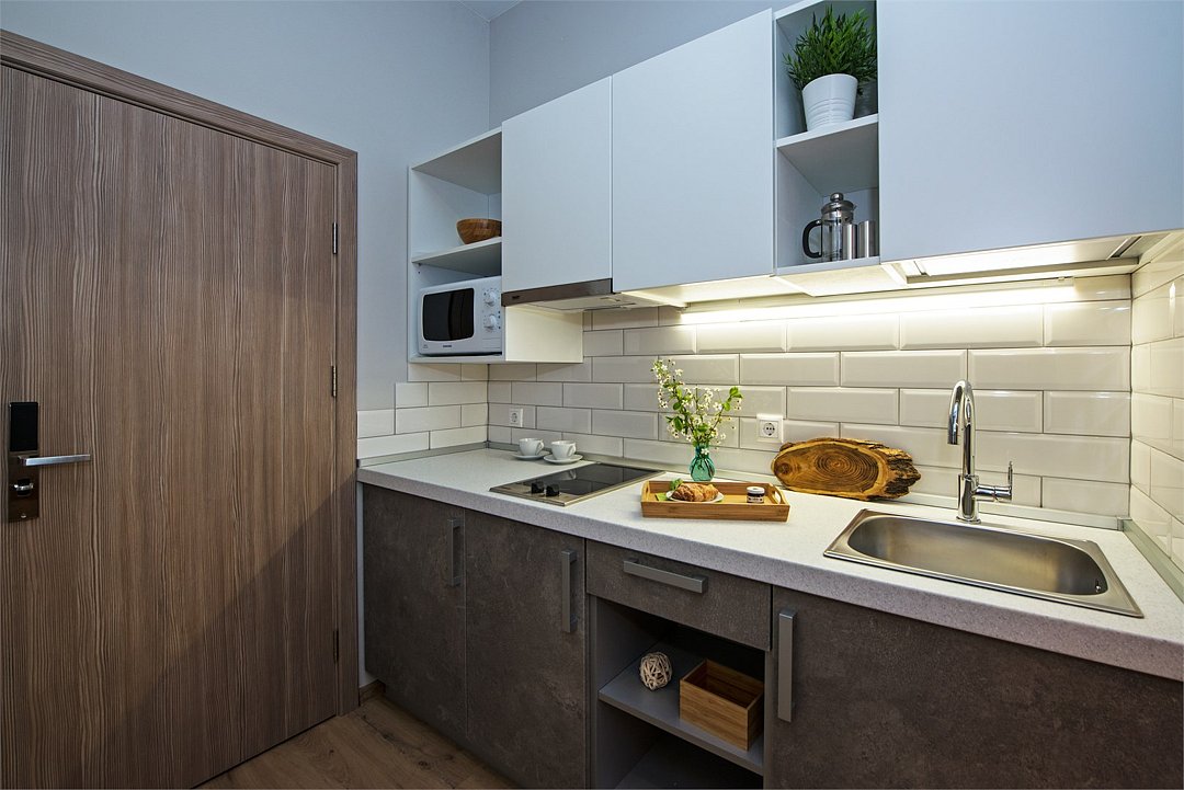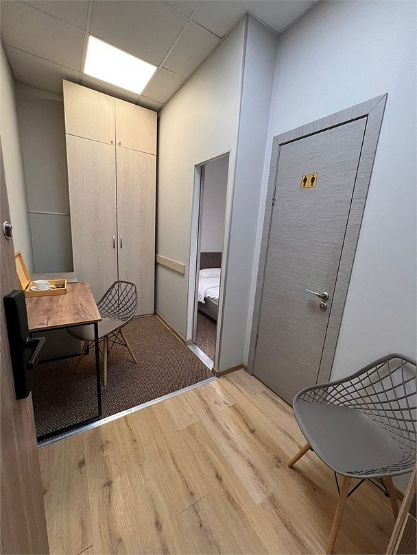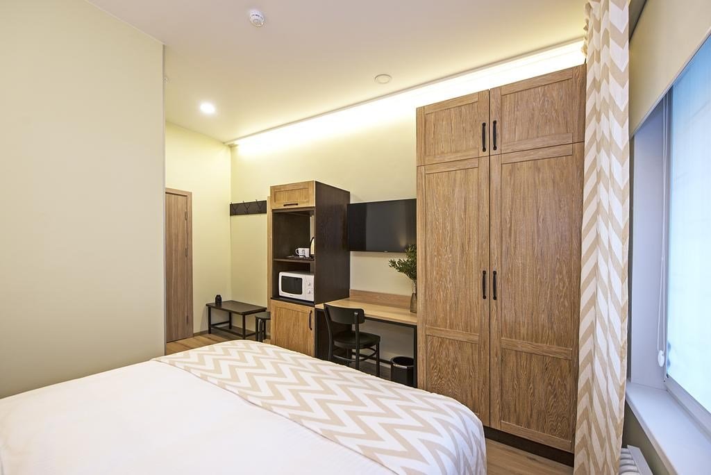 Уютный современный номер в спокойной цветовой гамме. Мебель из натурального шпона беленного дуба. В номере есть все для комфортного отдыха. Установлены две профессиональные гостиничные кровати с ортопедическим матрасом, которые по желанию гостей могут объединяться в одно спальное место размером 160х200, при этом кровати скрепляются особым образом и сверху кладется высокий наматрасник. В каждом номере у нас есть чайный набор и бутилированная вода. Этот номер идеально подойдет для долгого пребывания. В номерах данной категории, кроме СВЧ-печи и холодильника, есть небольшая кухня с плитой и необходимой посудой. В номере также имеется большой телевизор с плоским экраном 19 дюймов и большим количеством спутниковых каналов. Во всех номерах и общественных зонах предоставляется бесплатный беспроводной высокоскоростной доступ в интернет (Wi-Fi). Удобная просторная ванная комната со всем необходимым, включая одноразовые тапочки и халаты. Особой внимание мы уделили качественной шумоизоляции номеров. Ваш сон ничто не побеспокоит.Услуги и удобства