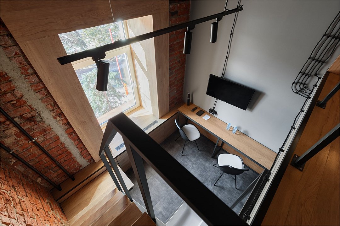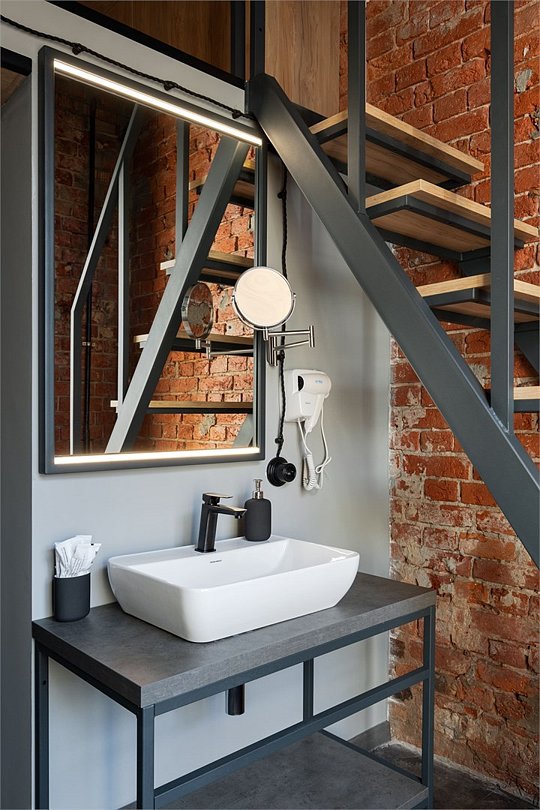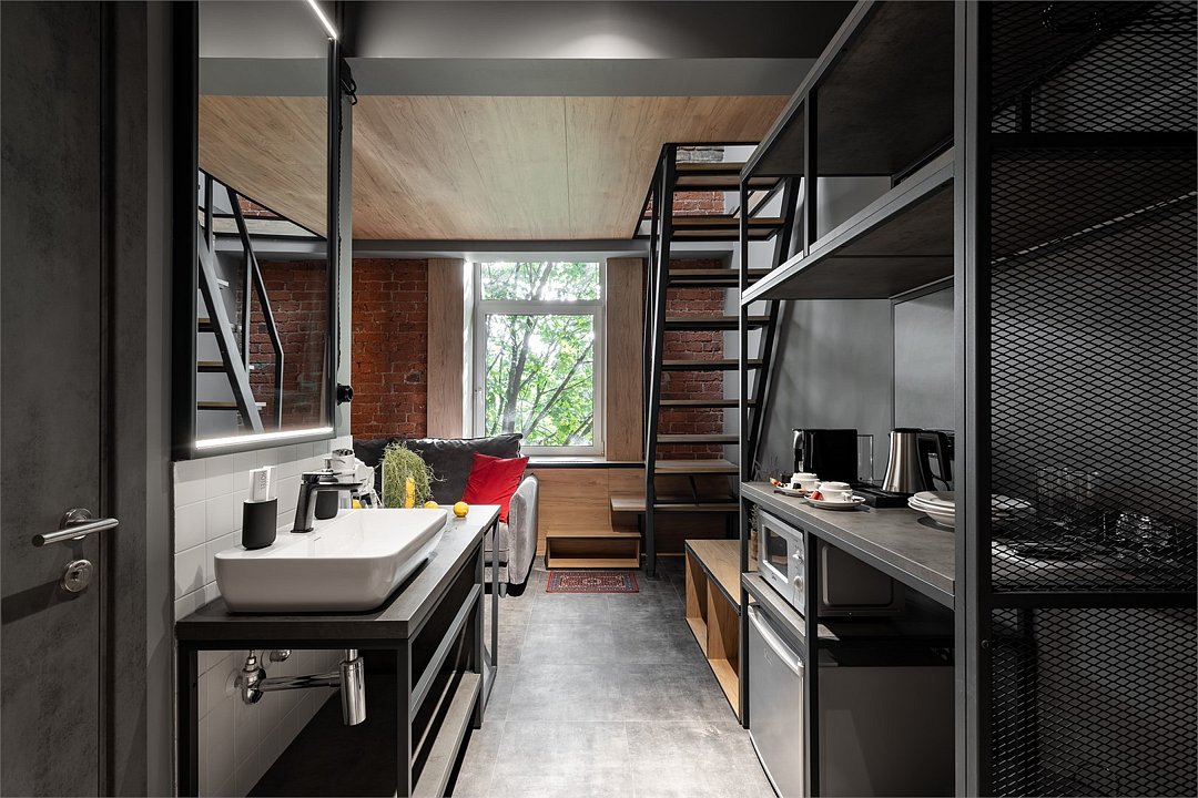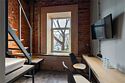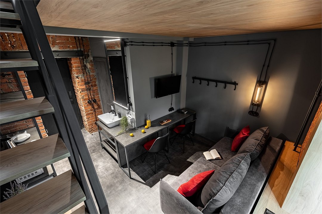 Номер-мечта для тех, кто давно хотел свой личный уголок в стиле лофт с мансардой и отдельным спальным местом на втором уровне, для тех, кто ценит стиль и приватность. Влюбиться с первого взгляда в древесно-кирпичные тона, арты с античными скульптурами, споты с точечным расслабляющим освещением, найти идеальное место для работы на широком подоконнике и релакса после на мансарде. В номере есть диван-кровать, кухонный уголок с микроволновой печью, чайником и набором посуды и спутниковое телевидение. Номер вызывает привыкание.Услуги и удобства