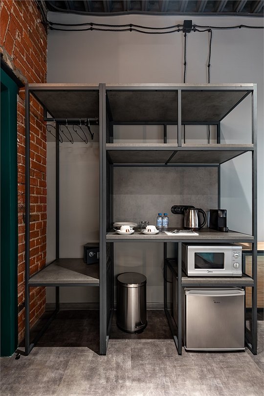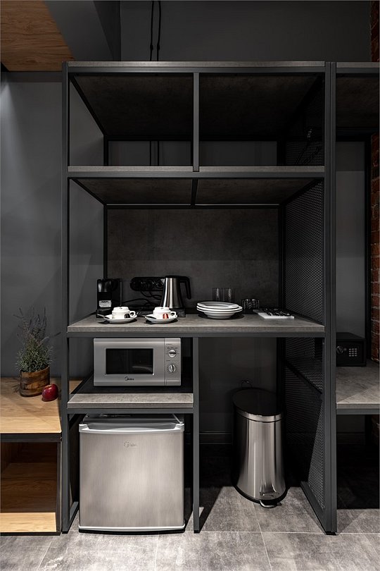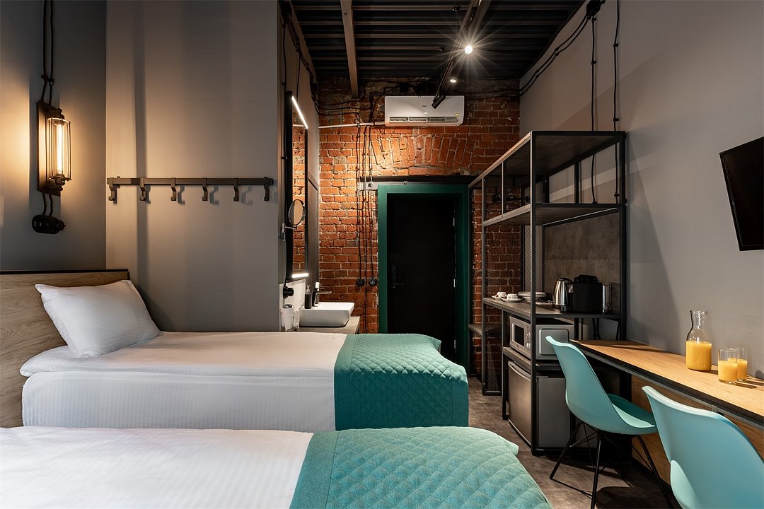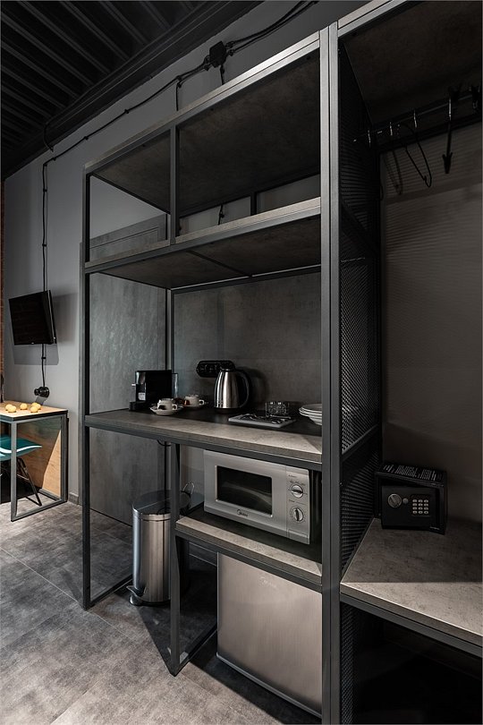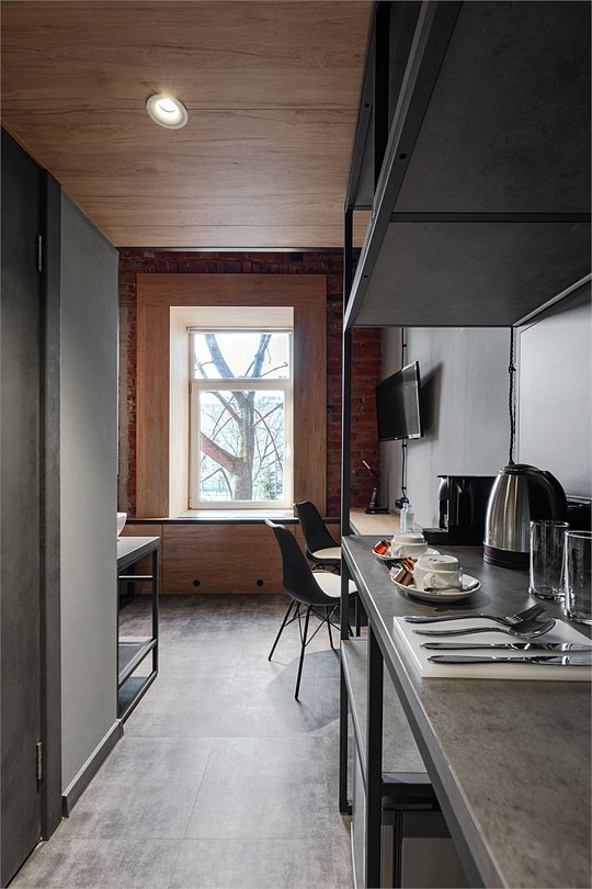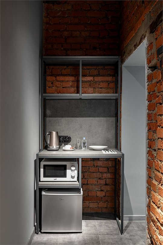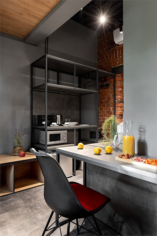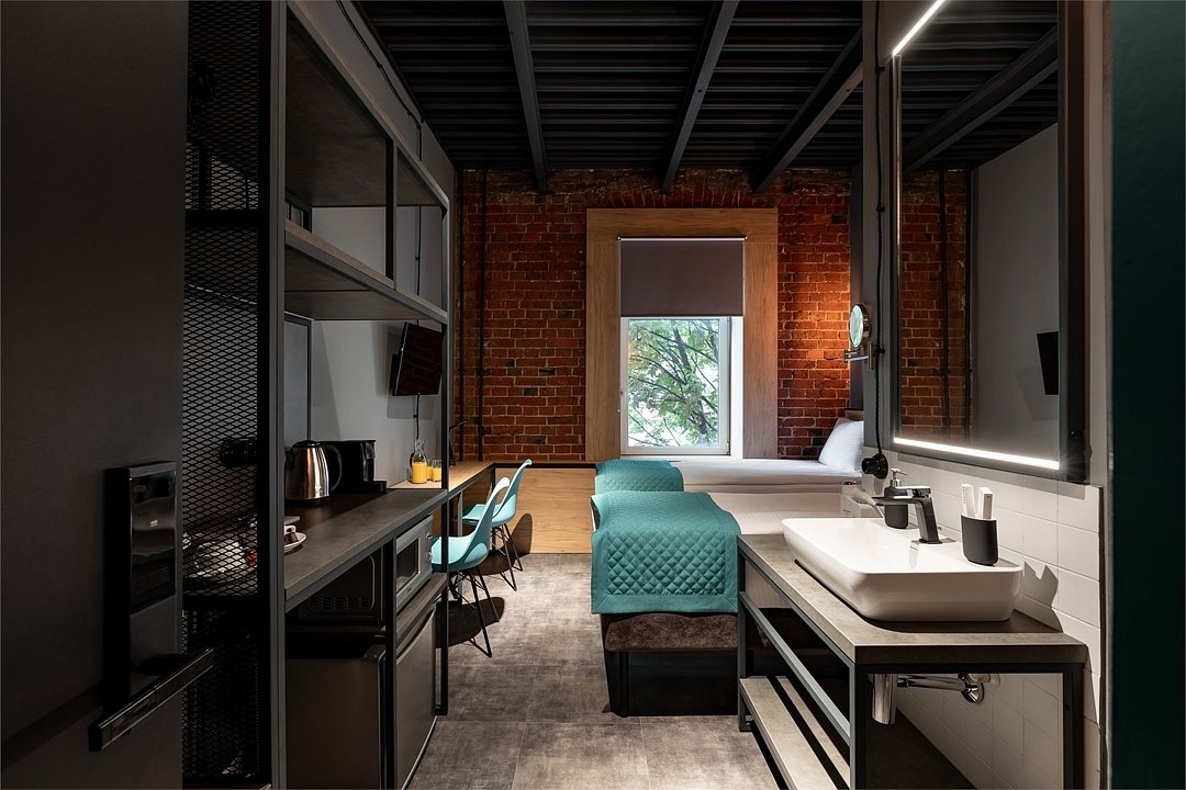 Эргономичный стильный номер в стиле лофт с объединенный спальной и кухонной зоной, где есть микроволновая печь, чайник и набор посуды. Дизайнерский интерьер с древесно-кирпичными акцентами гармонично дополняют арты героев античных времен. Номер располагает широким подоконником, на котором можно расслабиться за чашкой кофе или бокалом вина, по настроению. Также есть wi-fi и спутниковое телевидение.Услуги и удобства