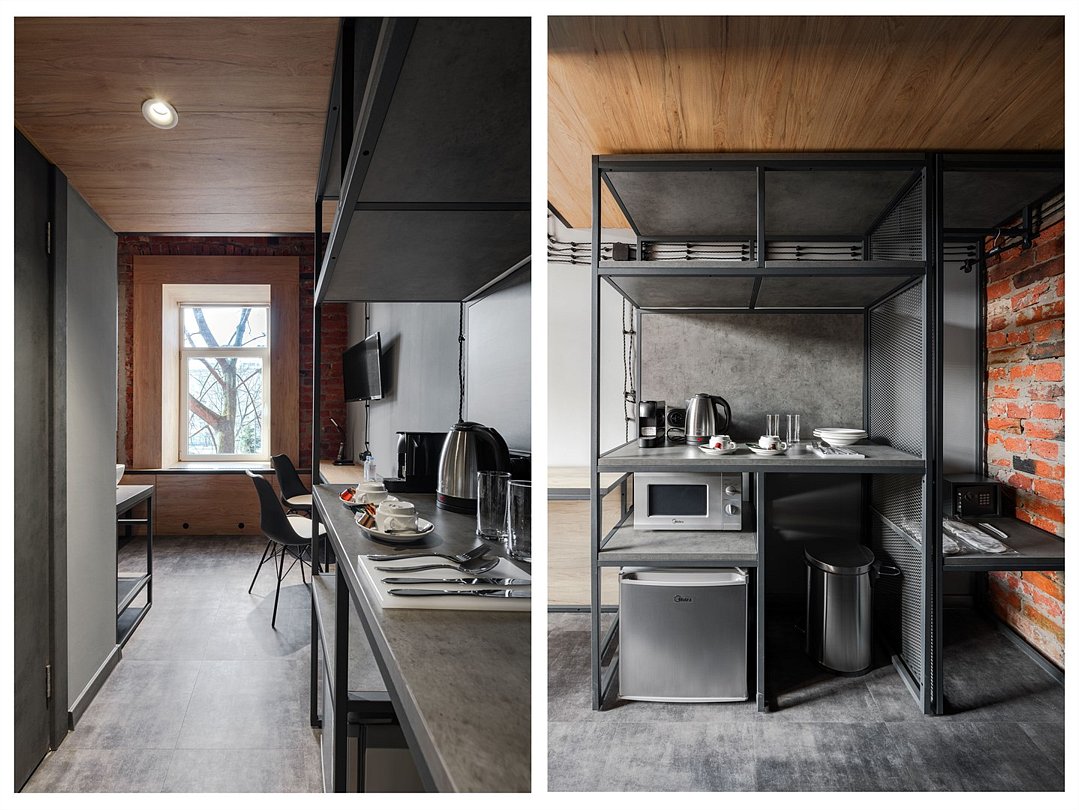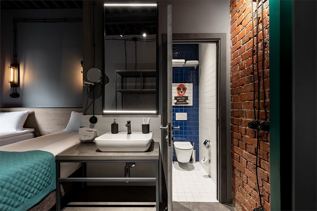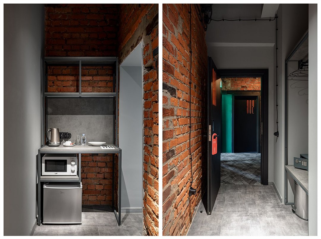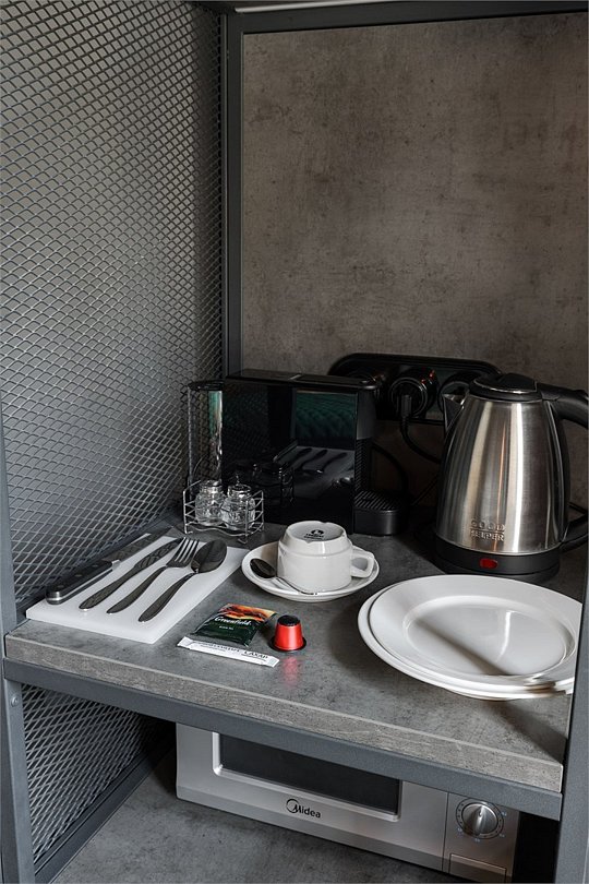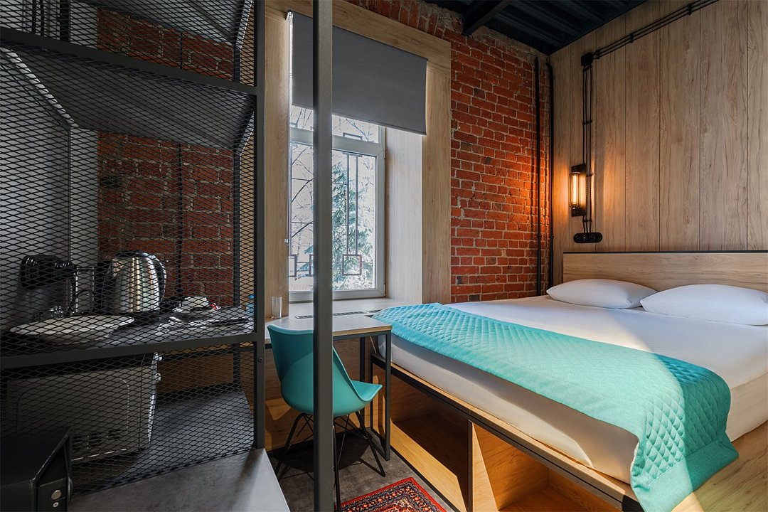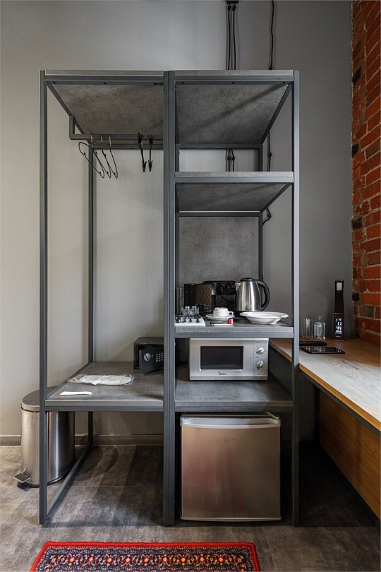 Эргономичный стильный номер в стиле лофт с объединенный спальной и кухонной зоной, где есть микроволновая печь, чайник и набор посуды. Дизайнерский интерьер с древесно-кирпичными акцентами гармонично дополняют арты героев античных времен. Номер располагает широким подоконником, на котором можно расслабиться за чашкой кофе или бокалом вина, по настроению. Также есть wi-fi и спутниковое телевидение.Услуги и удобства