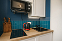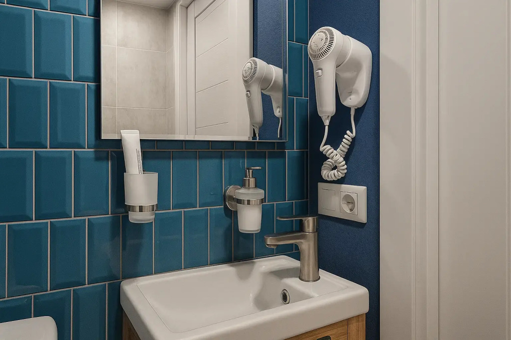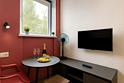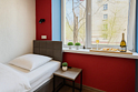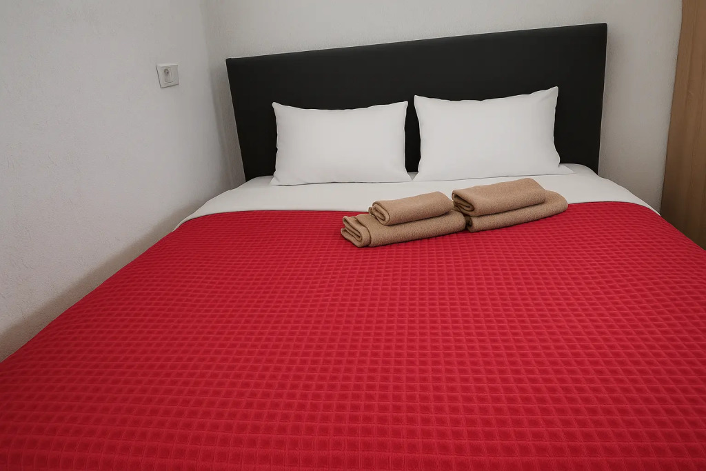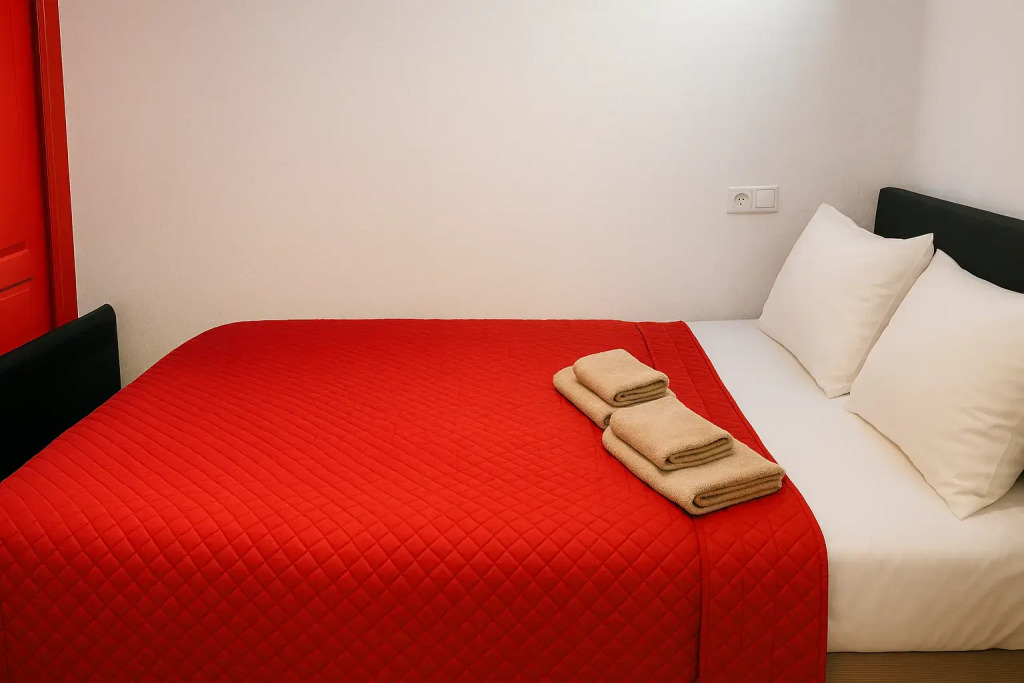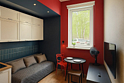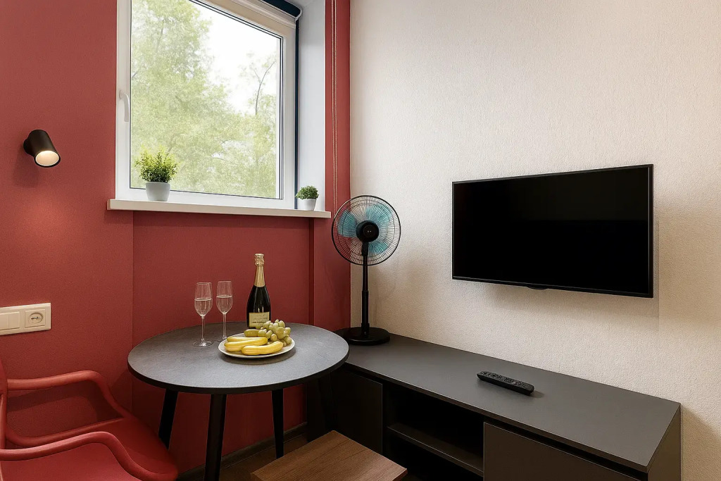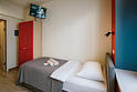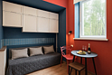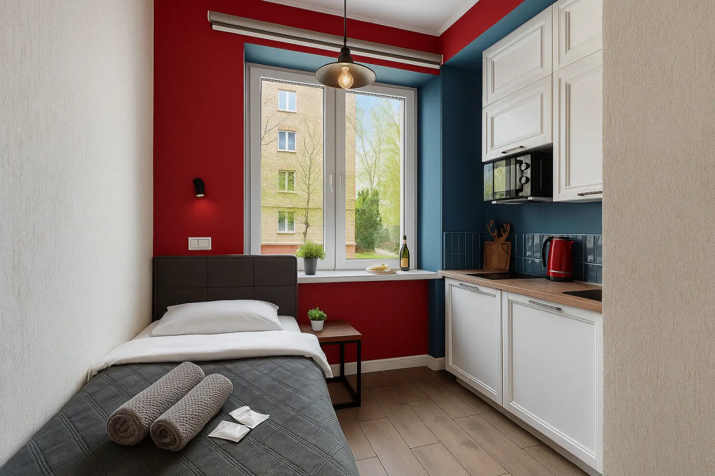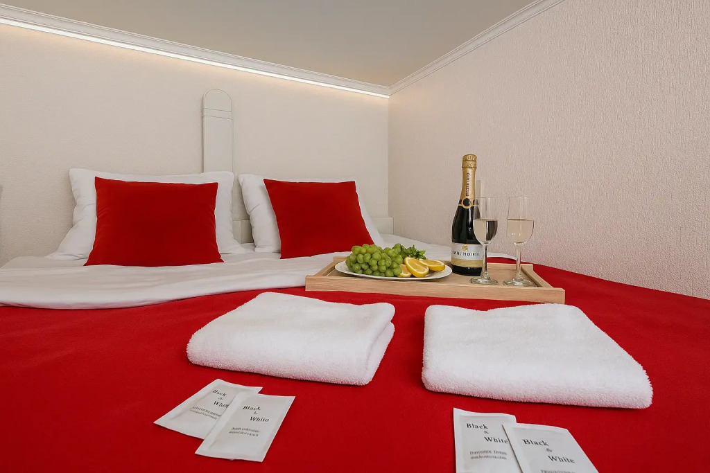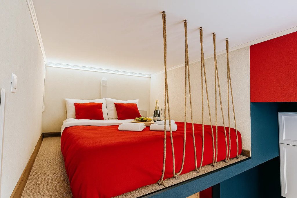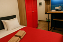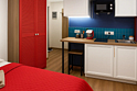 Разные форматы номеров — от «мини-кают» до «люксов». В каждом номере: кровать, мини-кухня с плитой, посудой и холодильником.