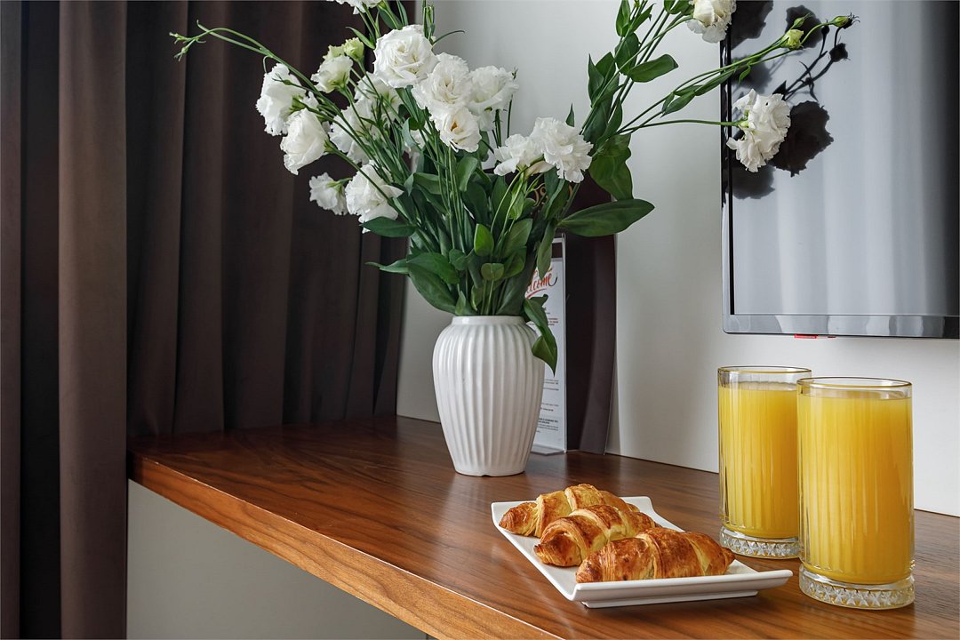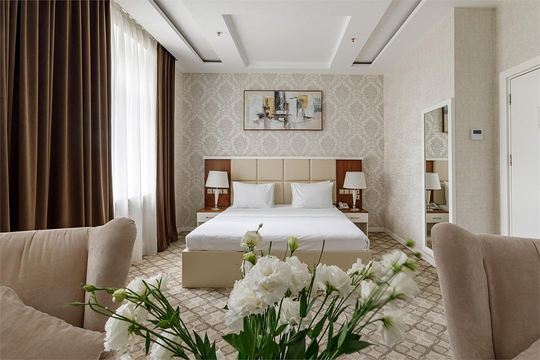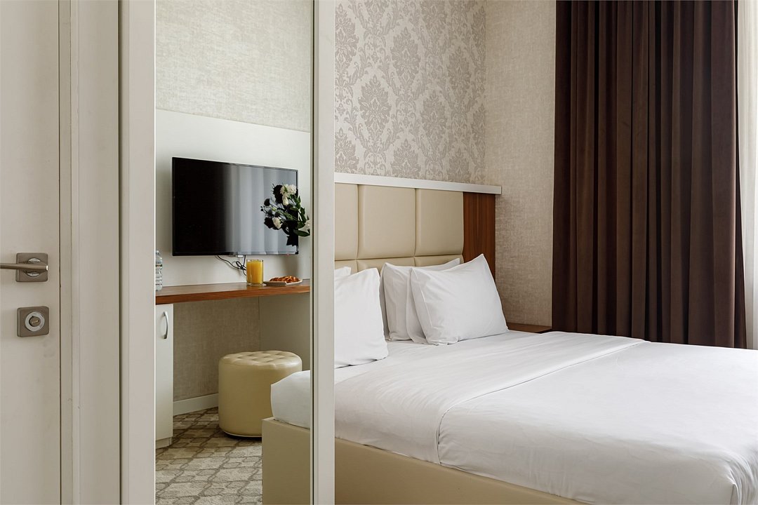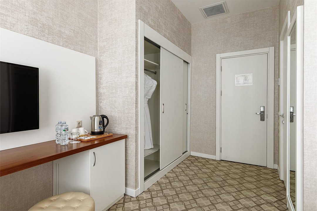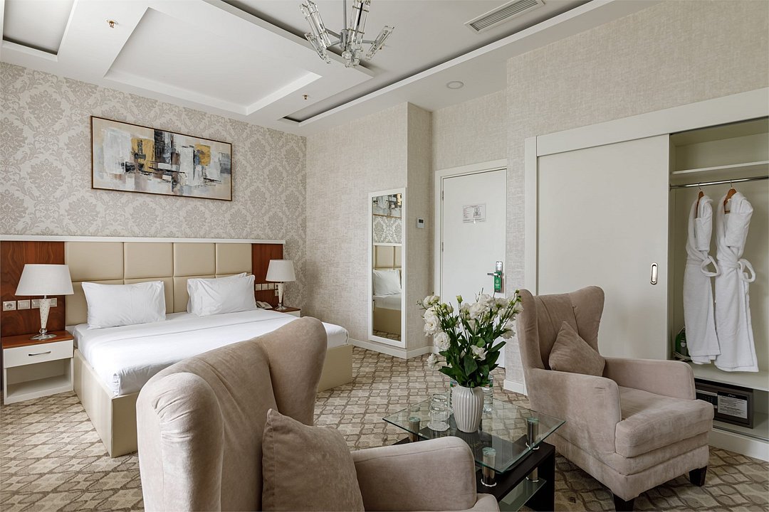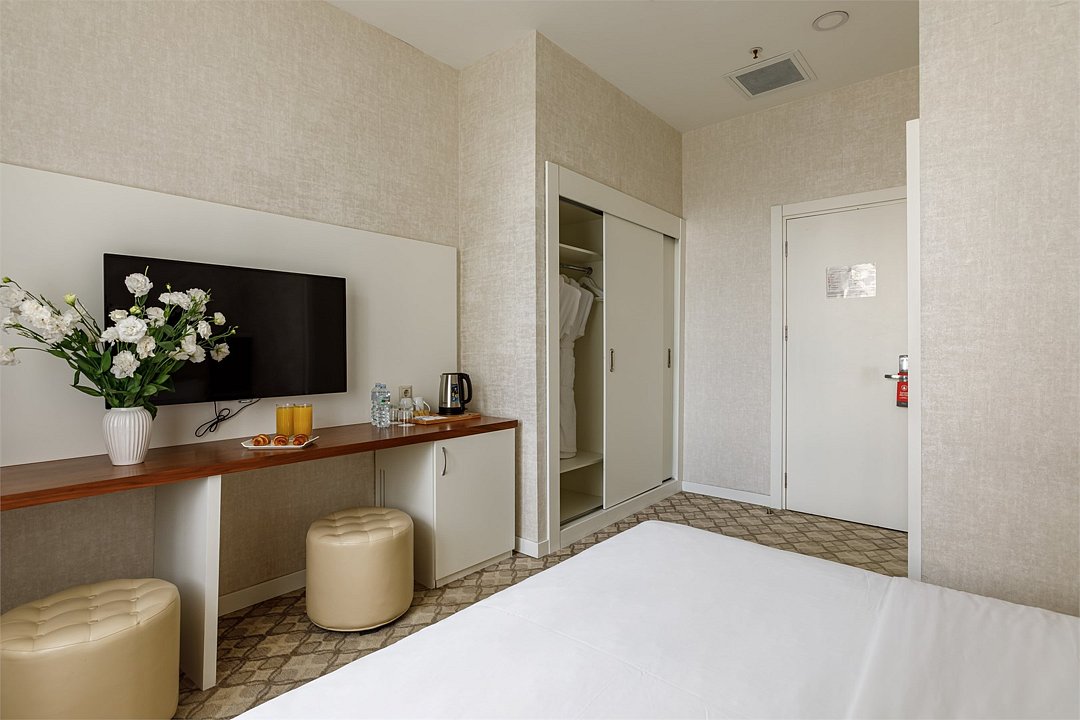 Почувствуйте себя как дома в современном номере, в котором есть все необходимое для эффективной работы и комфортного отдыха. Современный дизайн, выполненный в бежевых тонах, создает ощущение еще большего простора в номере.Услуги и удобства