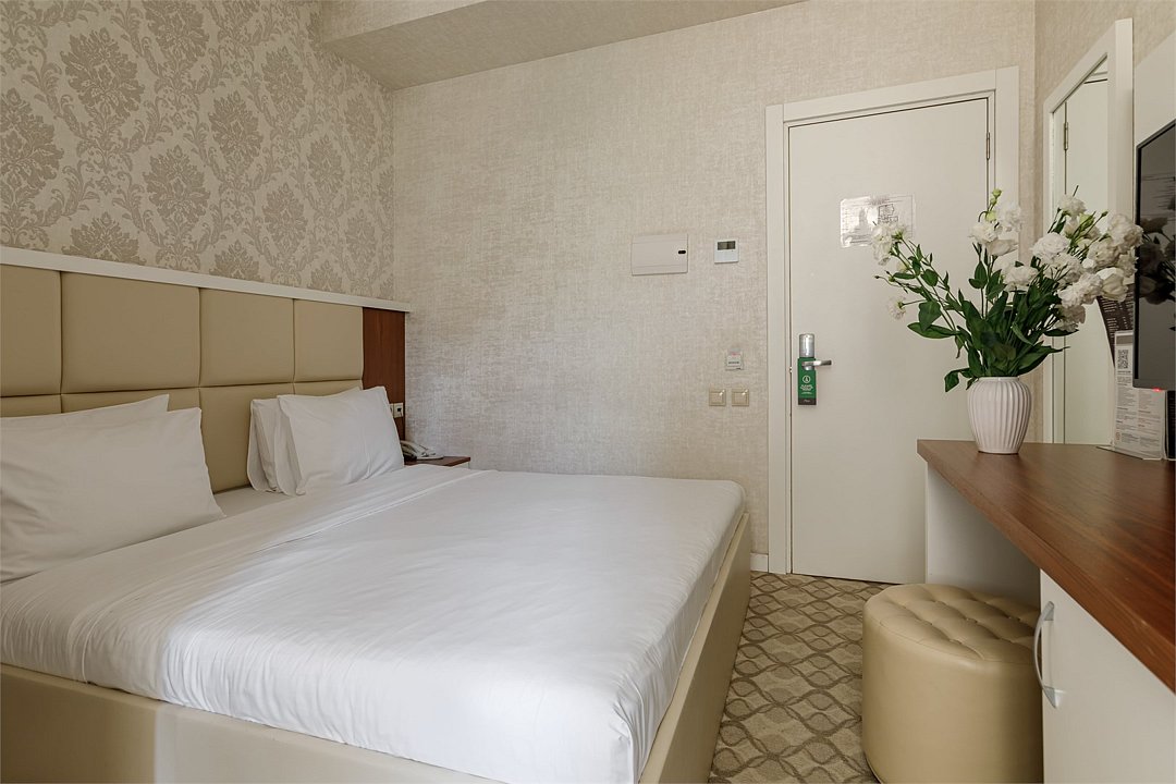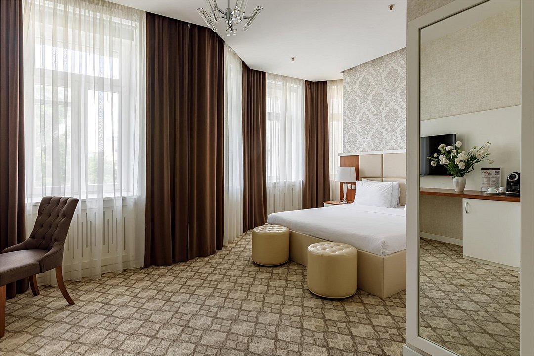 Номер "Бизнес Дабл" Наши номера категории "Бизнес" создают идеальные условия как для работы, так и для отдыха во время поездки. Вы можете спокойно поработать за удобным столом, используя бесплатный WiFi доступ в Интернет, а закончив с делами, отдохнуть в комфорте Вашего номера..Услуги и удобства