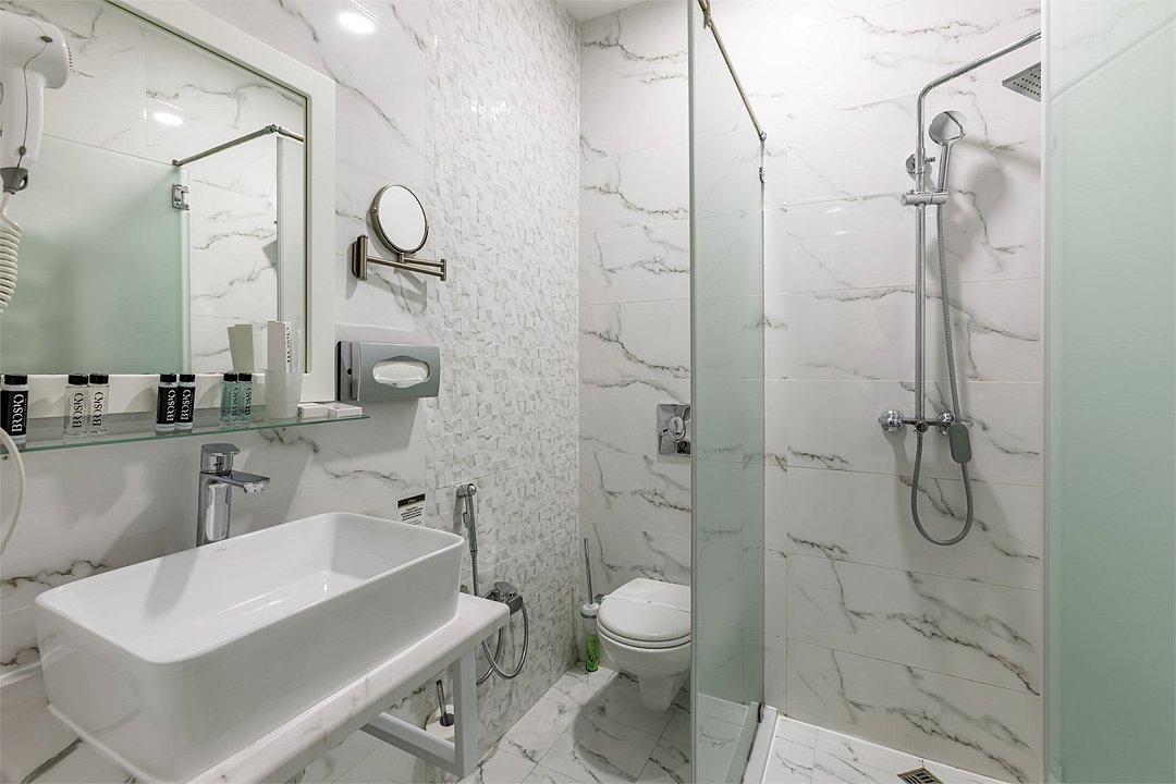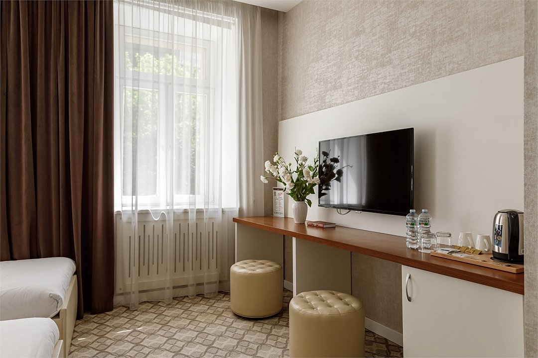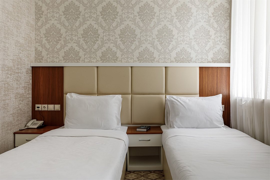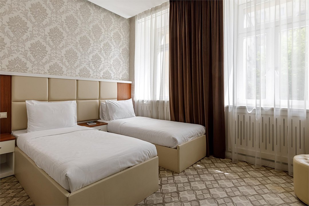 спутниковое телевидение, Wi-Fi, телефон, кондиционер, фен, ванная комната, душевая кабина, халаты, банные полотенца, тапочки, косметические средства, две односпальные кровати, шкаф для одежды, вешалки, багажная тумба, зеркало, пуфики, чайный набор, обслуживание номеров, сейф, чайник, косметическое зеркало, питьевая вода, ковровое покрытие, вид во двор, стаканы, стол, туалетные средства, телевизор с плоским экраном, мини-холодильник, без питомцевВ номере