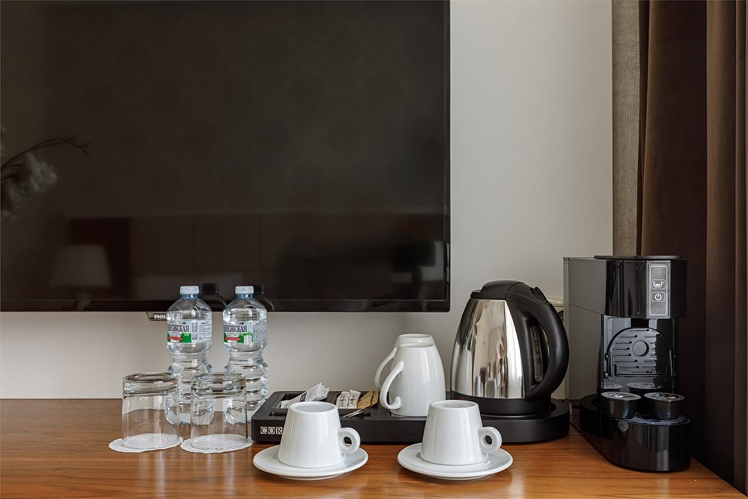 спутниковое телевидение, Wi-Fi, телефон, кондиционер, фен, кофемашина, ванная комната, душевая кабина, халаты, банные полотенца, тапочки, косметические средства, кровать «King size», тумбы, шкаф для одежды, вешалки, журнальный столик, багажная тумба, зеркало, пуфики, чайный набор, обслуживание номеров, сейф, чайник, косметическое зеркало, питьевая вода, ковровое покрытие, вид во двор, стаканы, стол, туалетные средства, телевизор с плоским экраном, мини-холодильник, без питомцевВ номере