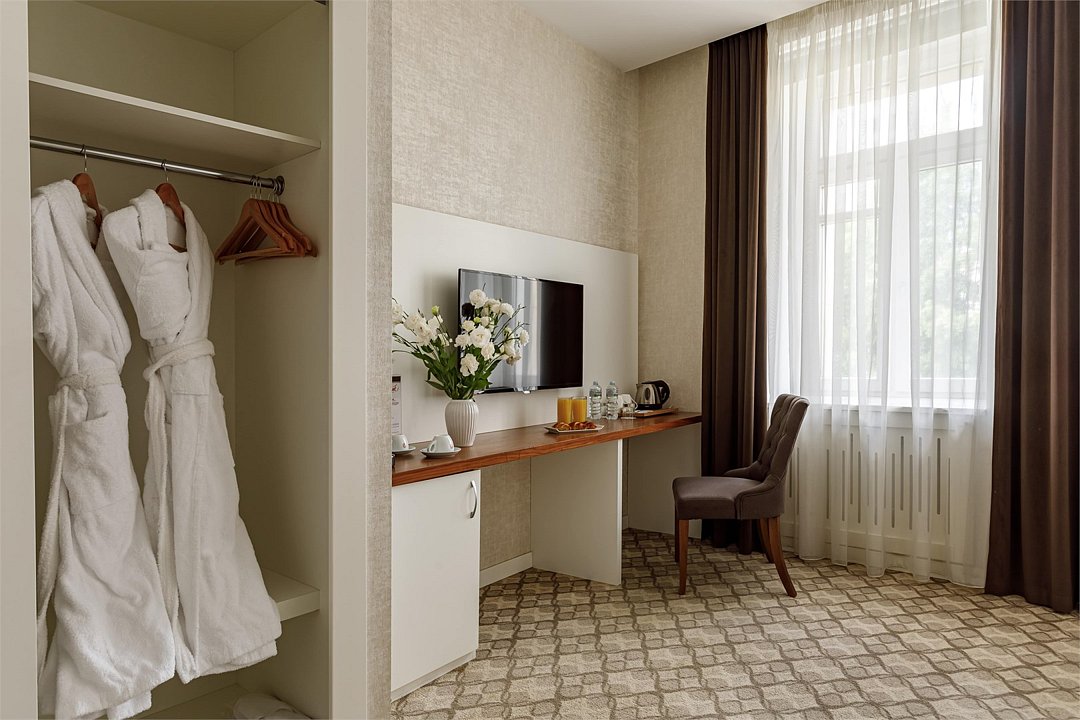 спутниковое телевидение, Wi-Fi, телефон, кондиционер, фен, ванная комната, душевая кабина, халаты, банные полотенца, тапочки, косметические средства, кровать «King size», шкаф для одежды, вешалки, багажная тумба, зеркало, пуфики, чайный набор, обслуживание номеров, сейф, чайник, косметическое зеркало, питьевая вода, ковровое покрытие, вид во двор, стаканы, стол, туалетные средства, телевизор с плоским экраном, мини-холодильник, без питомцевВ номере
