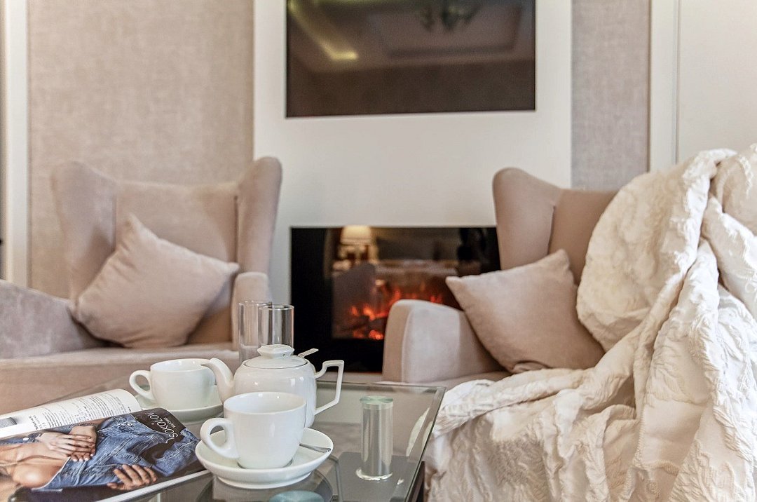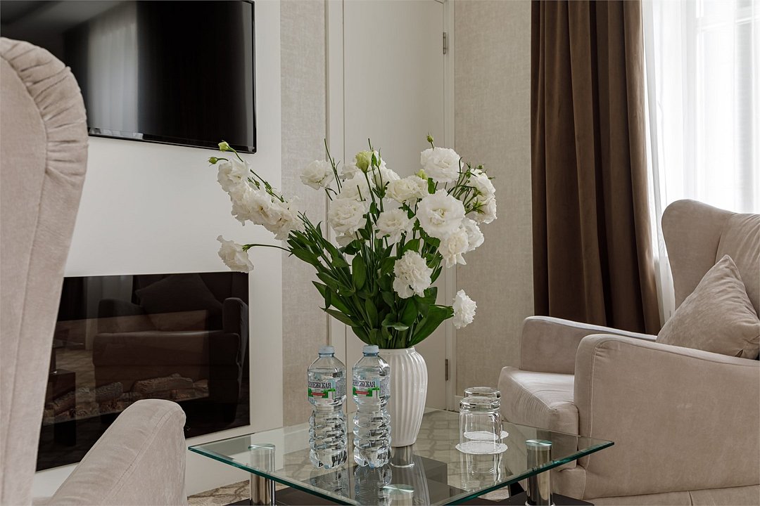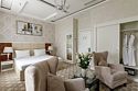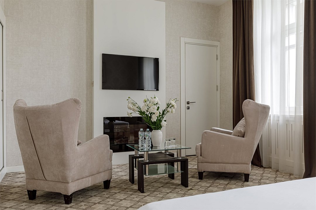 спутниковое телевидение, Wi-Fi, телефон, кондиционер, фен, кофемашина, ванная комната, душевая кабина, халаты, банные полотенца, тапочки, косметические средства, кровать «King size», кресла, тумбы, шкаф для одежды, вешалки, журнальный столик, багажная тумба, зеркало, пуфики, камин, чайный набор, обслуживание номеров, сейф, чайник, косметическое зеркало, питьевая вода, ковровое покрытие, вид во двор, стаканы, туалетные средства, телевизор с плоским экраном, мини-холодильник, без питомцевВ номере