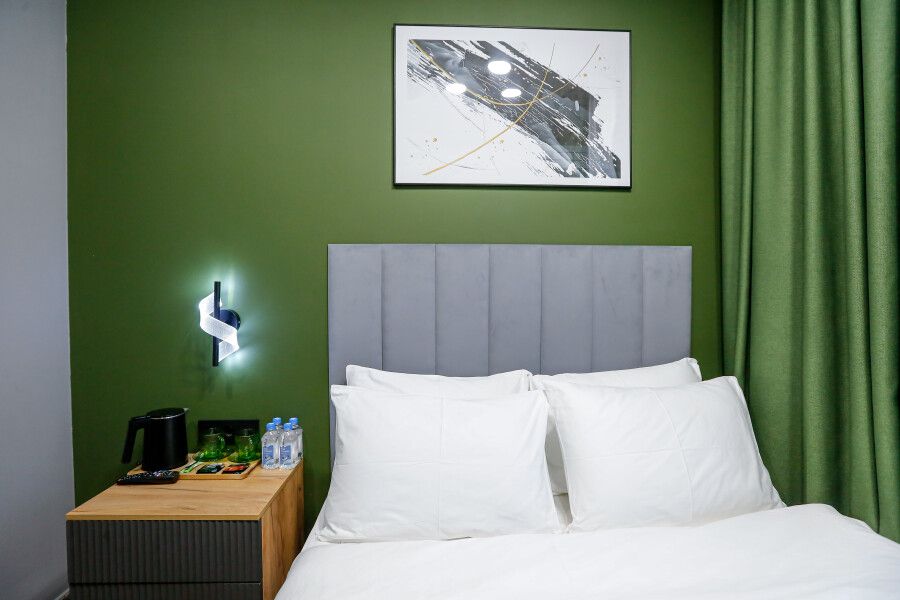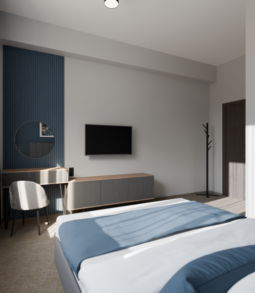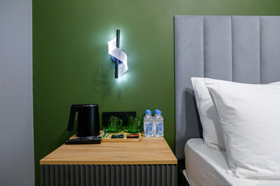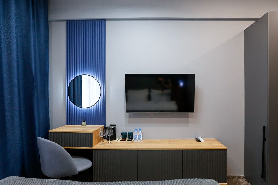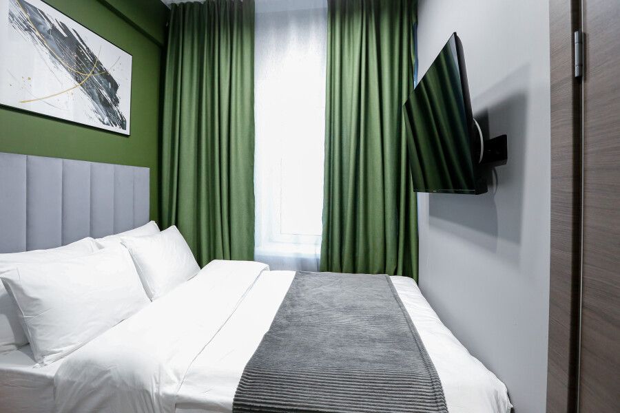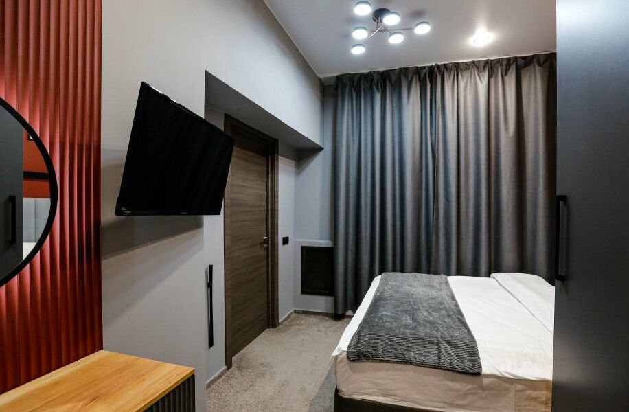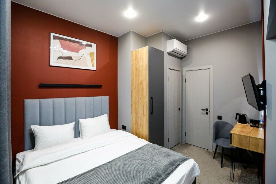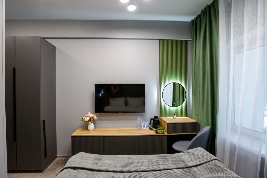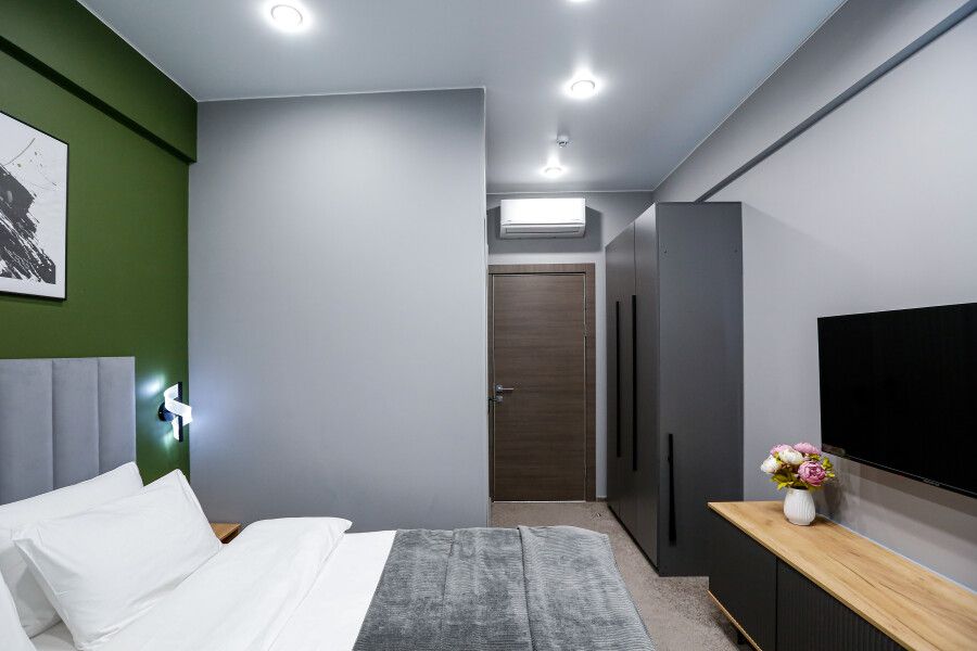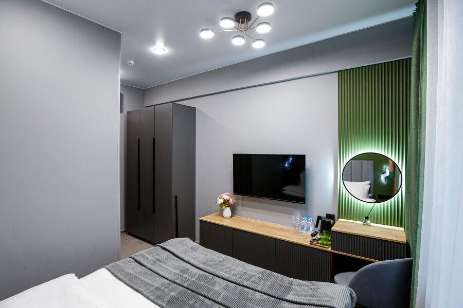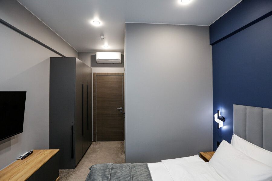 Минималистичный интерьер номера обеспечивает всё необходимое для качественного отдыха: большая удобная кровать, телевизор со Smart TV, шкаф и тумба для вещей.
