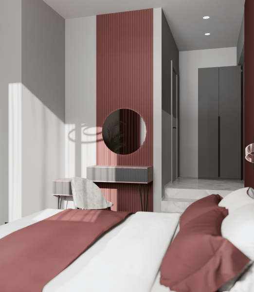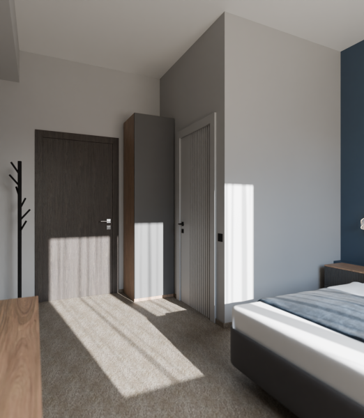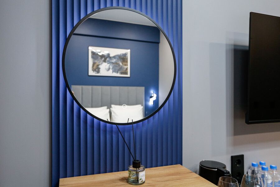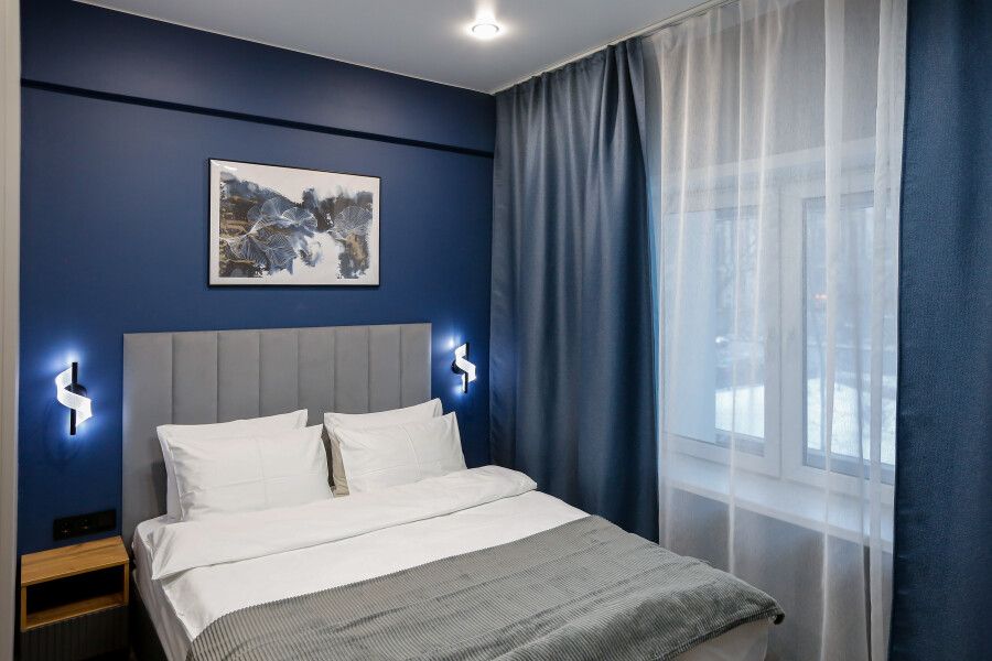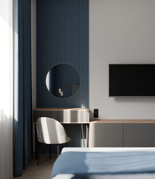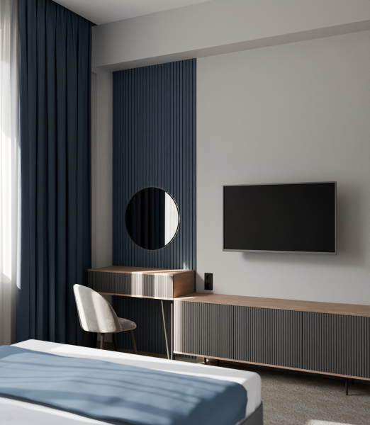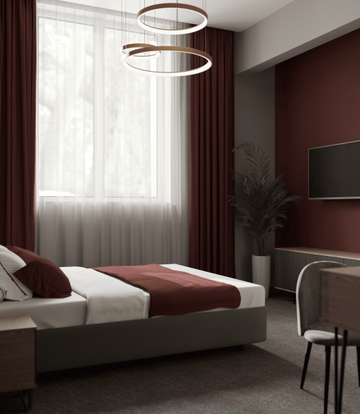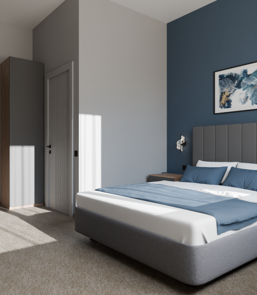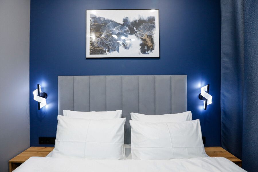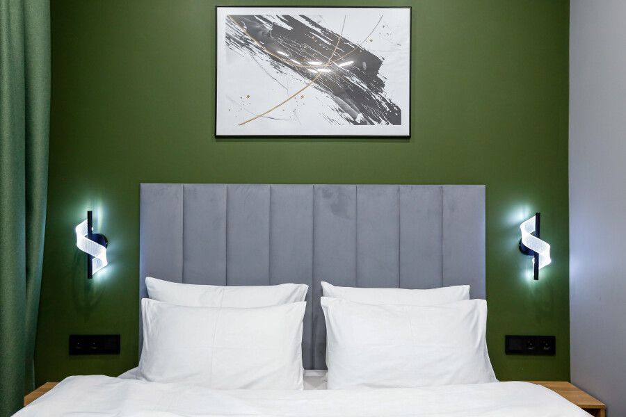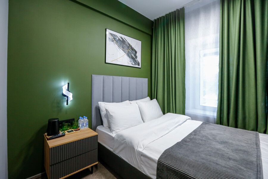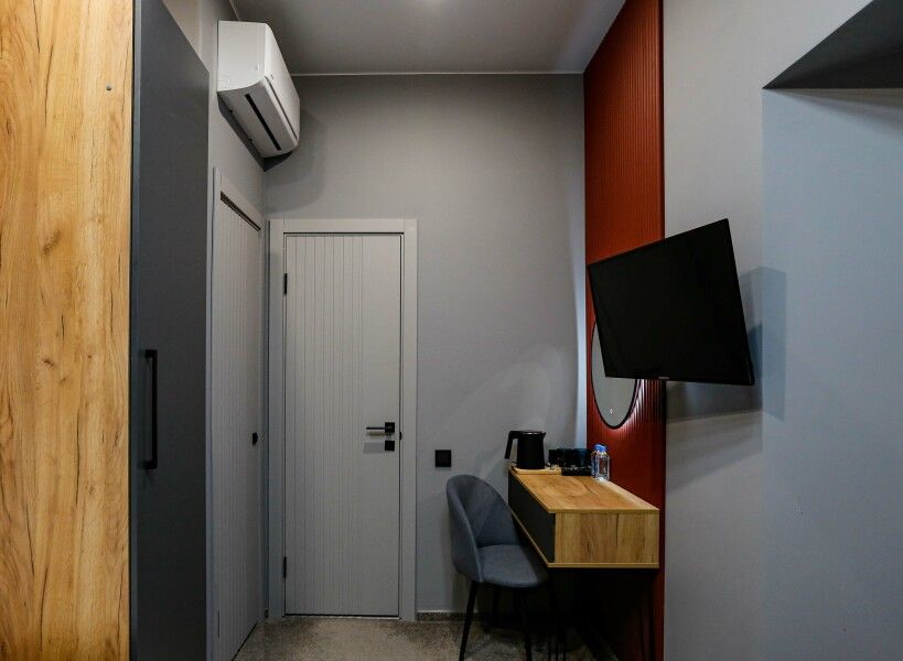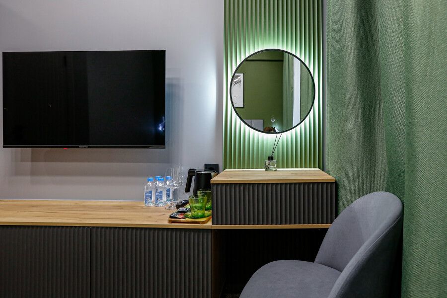 Минималистичный интерьер номера обеспечивает всё необходимое для качественного отдыха: большая удобная кровать, телевизор со Smart TV, шкаф и тумба для вещей.