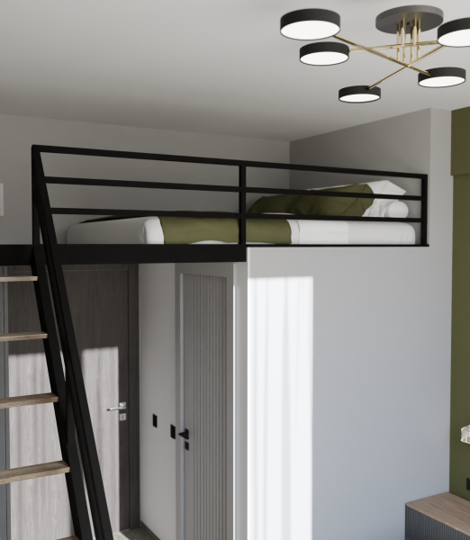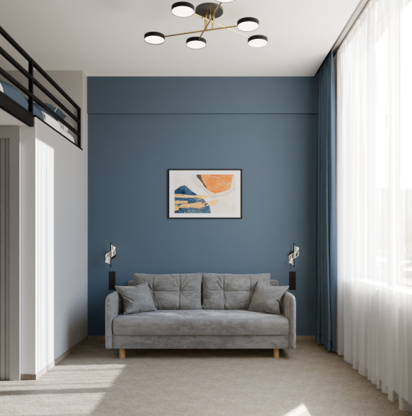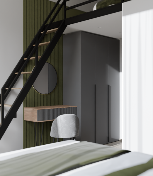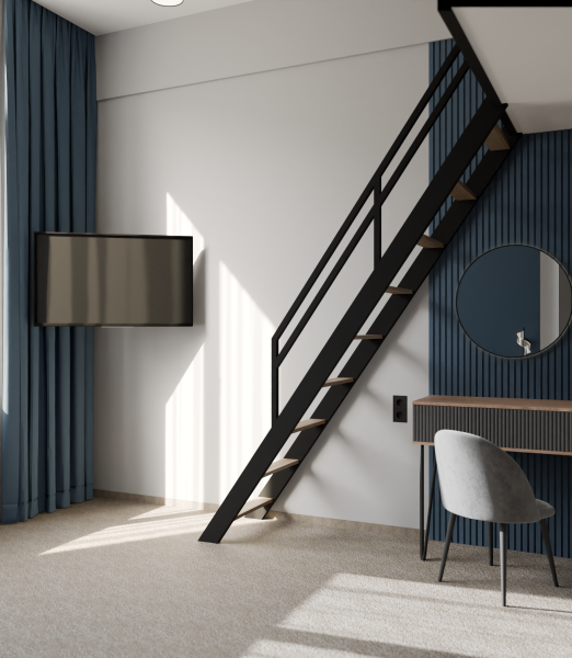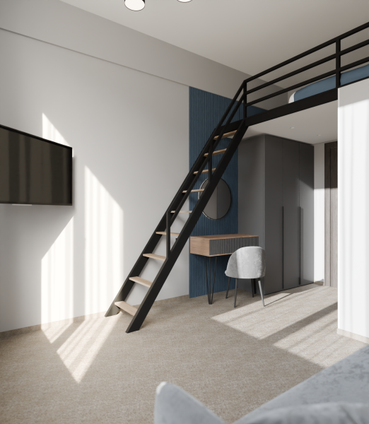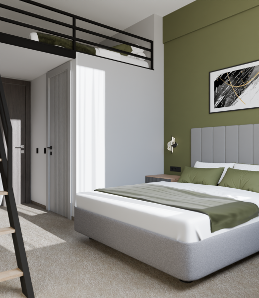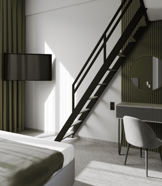 Среди преимуществ данного типа номеров — высокие потолки, панорамные окна, рабочая зона со столом, а также большой раскладной диван (двуспальная кровать), расположенные на нижнем ярусе. Второй ярус оборудован большой удобной кроватью и тумбой для хранения мелких вещей.