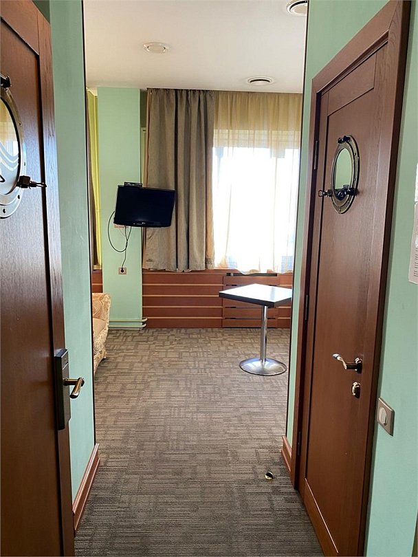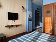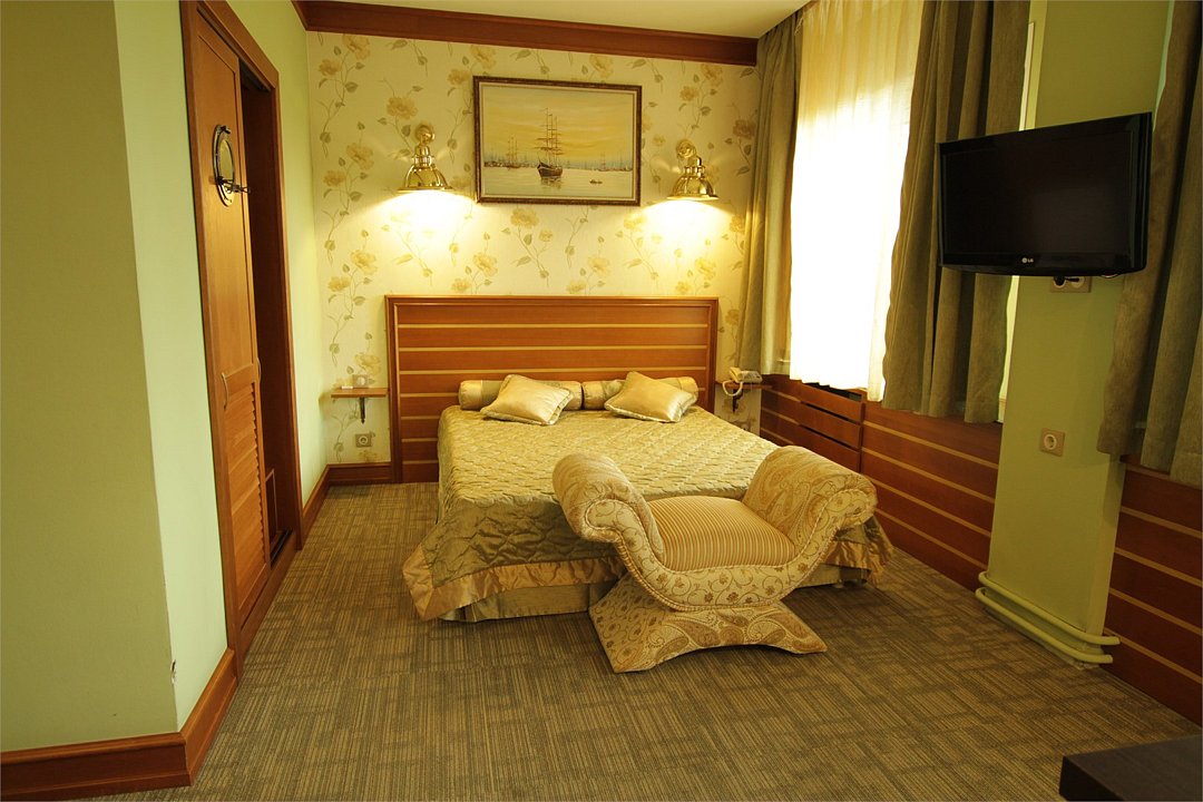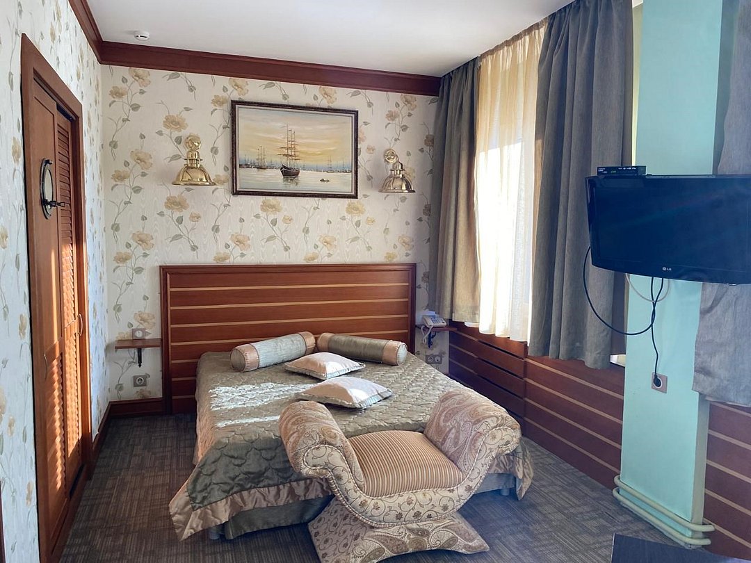 Номер Полулюкс (DELUXE) с большой кроватью. Размер номера 27 м². Полулюкс с кондиционером, телевизором и бесплатным беспроводным доступом в Интернет. Это номер увеличенной площади с диваном-кроватью. Стоимость номера рассчитывается от количества гостей, минимальная стоимость на 1-2 человек. Максимальная вместимость – 4 человека плюс 1 место (раскладушка) за доп плату.Услуги и удобства