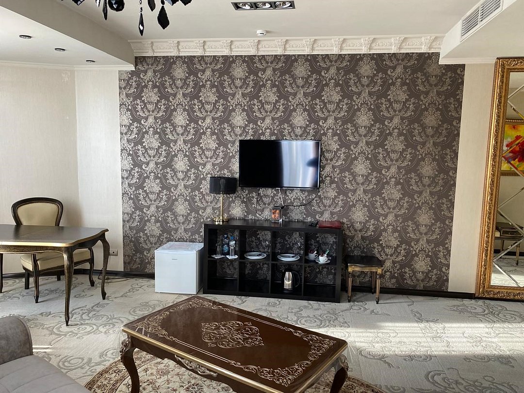 Номер Гранд-Люкс площадью 55 м2: просторный, комфортабельный, с гостиной и спальней. Номер оформлен в современном элегантном стиле. Стоимость номера рассчитывается от количества гостей, минимальная стоимость на 1-2 человек. Максимальная вместимость – 4 человека плюс 1 место (раскладушка) за доп плату.Услуги и удобства