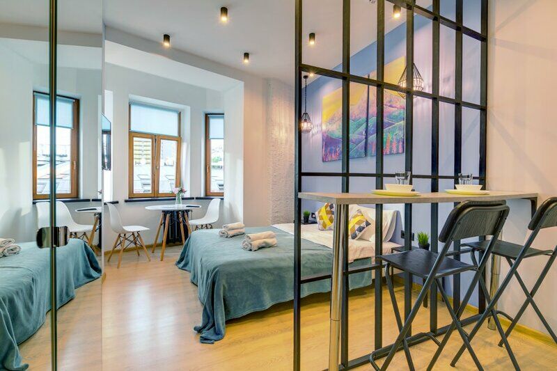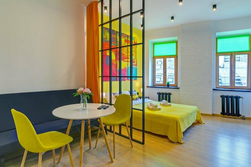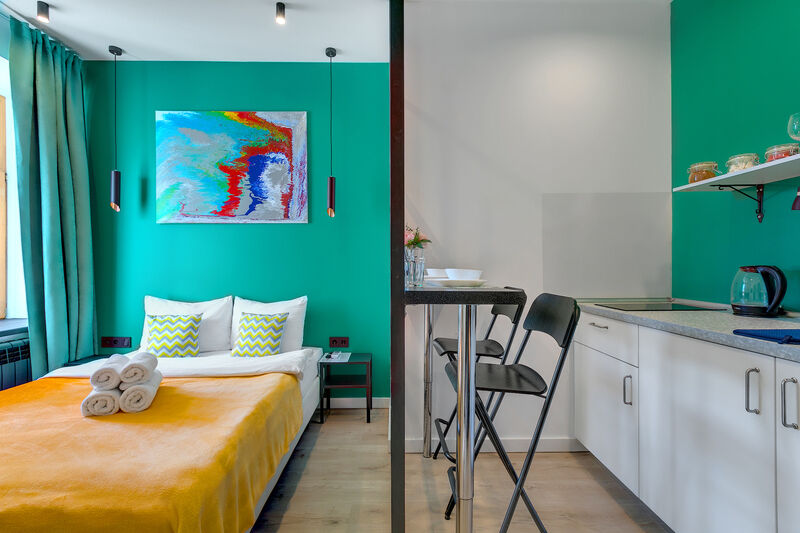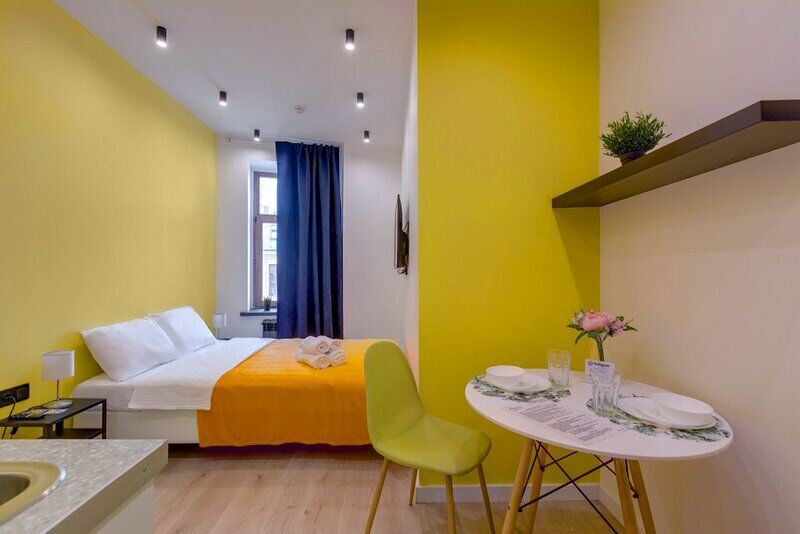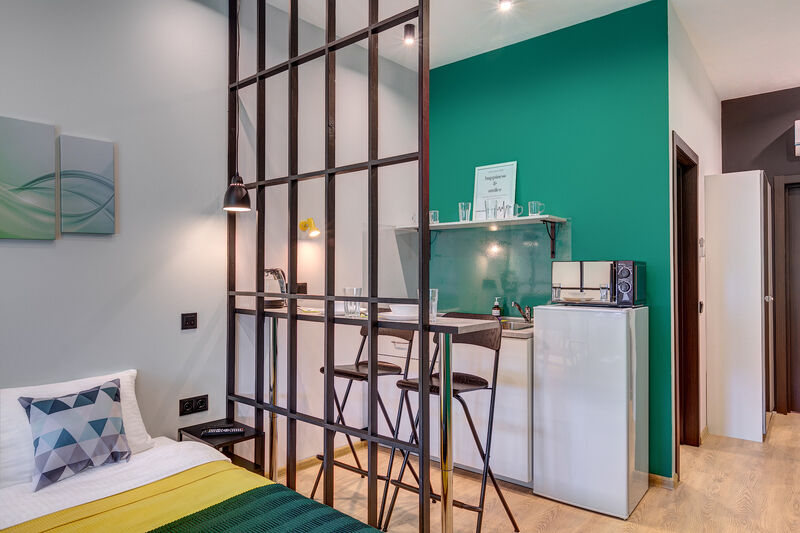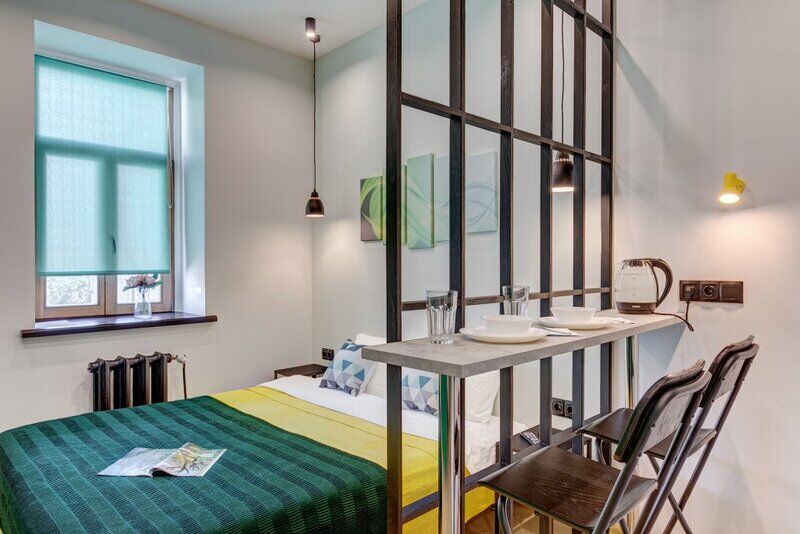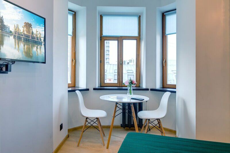 Стандартная студия с окнами на тихий двор. Расположены на 4 и 5 этажах исторического здания.