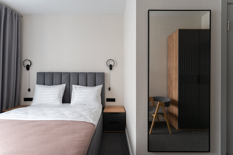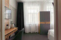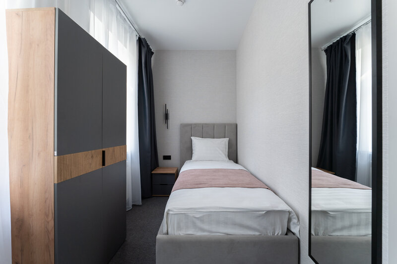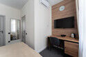 Оснащен: односпальная кровать 90/200, Яндекс станция Алиса с функцией инфоконсьерж, TV и аудио, wi-fi, кондиционер, холодильник, сейф, гардеробный шкаф, письменный стол, стул, душевая комната, приборы гигиенической косметики, фен, белье премиального качества.