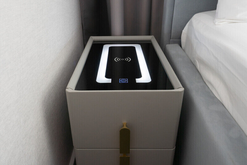 Двуспальная кровать 160/200, оснащен Яндекс станция Алиса с функцией инфоконсьерж, TV и аудио, wi-fi, кондиционер, сейф, холодильник, гардеробный шкаф, письменный стол, стул, душевая комната, приборы гигиенической косметики, фен, белье премиального качества.