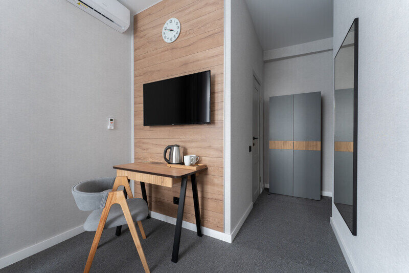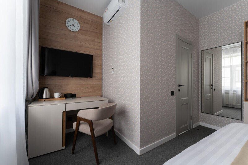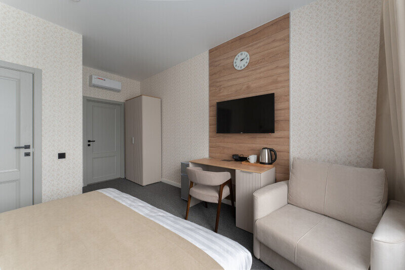Оснащен Яндекс станция Алиса с функцией инфоконсьерж, TV управляемое Алисой, wi-fi, кондиционер, сейф, холодильник, гардеробный шкаф, письменный стол, стул, душевая комната, приборы гигиенической косметики, фен, белье премиального качества.