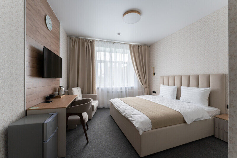 Люкс номер с одной большой кроватью размер 180/200. Оснащен Яндекс станция Алиса с функцией инфоконсьерж, TV и аудио, Wi-Fi, кондиционер, сейф, холодильник, гардеробный шкаф, письменный стол, стул, душевая комната, приборы гигиенической косметики, фен, белье премиального качества.