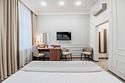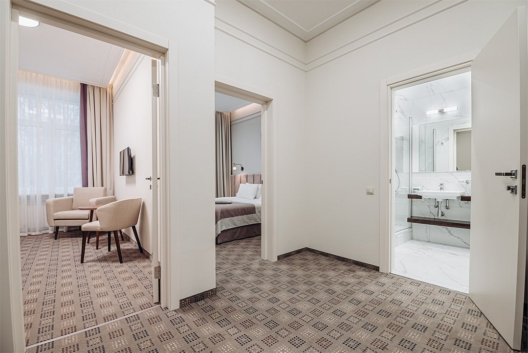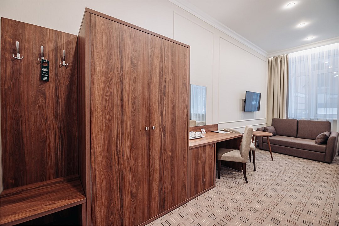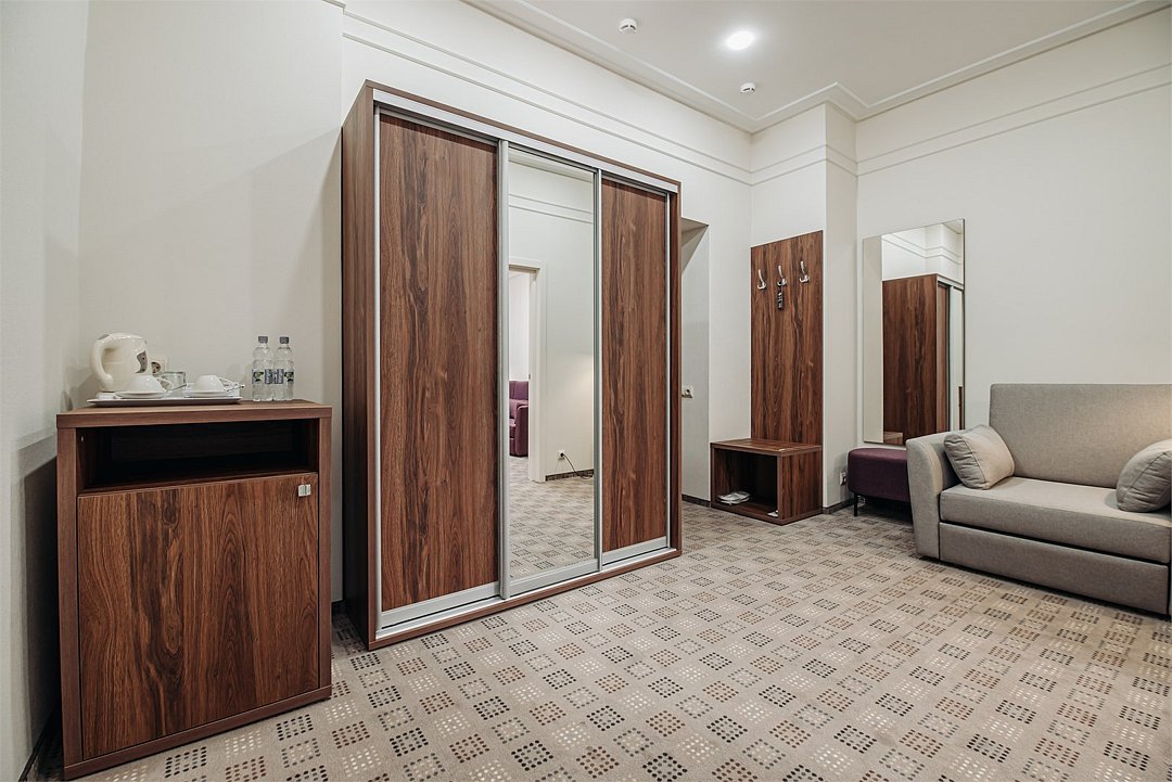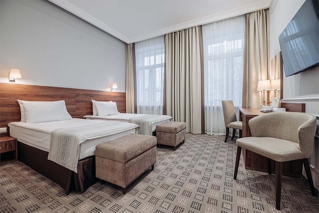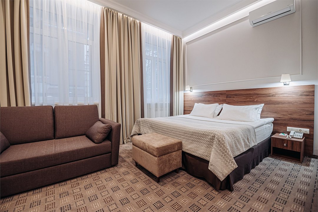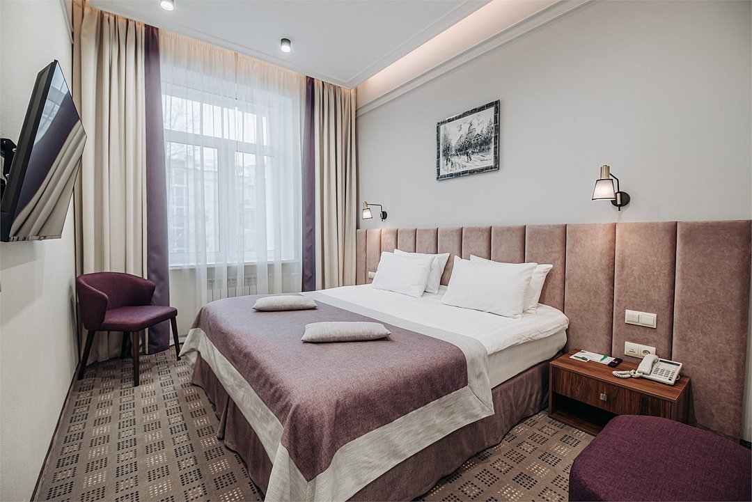 Трехэтажное здание отеля находится в тихом закрытом дворике, что позволяет гостям расслабиться и отдохнуть от шума столицы. Жилой фонд рассчитан на 95 мест и предлагает номера категории Стандарт, Полулюкс, Люкс и 2-х комнатные Апартаменты. Номера со стильным, как современным, так и классическим дизайном оснащены кондиционером, телевизором ЖК, мини-холодильником и собственной ванной комнатой.