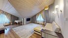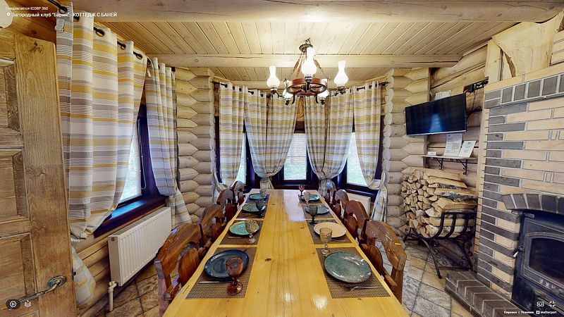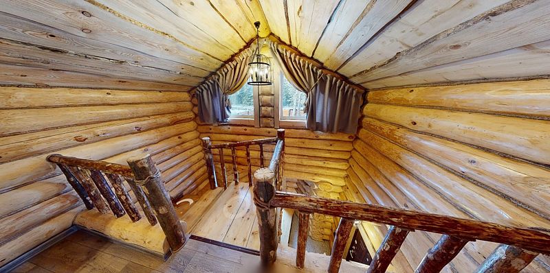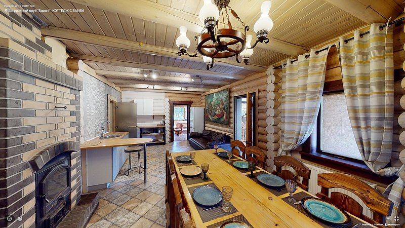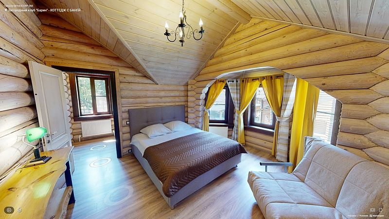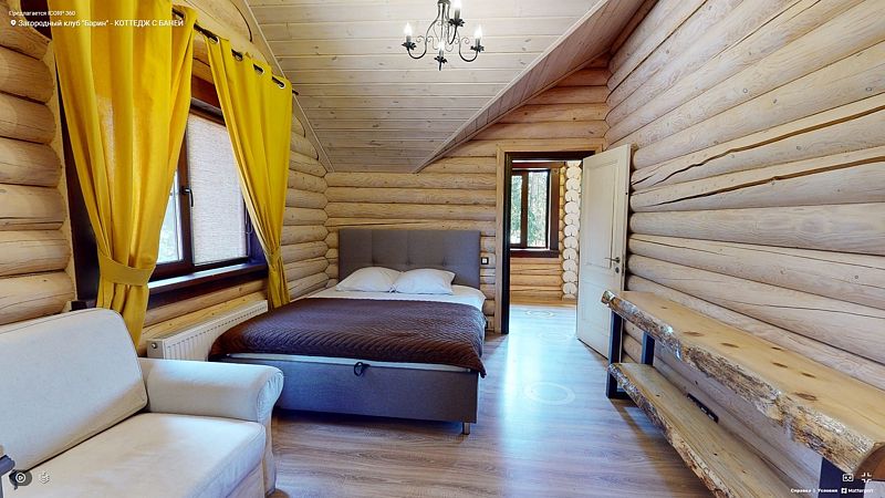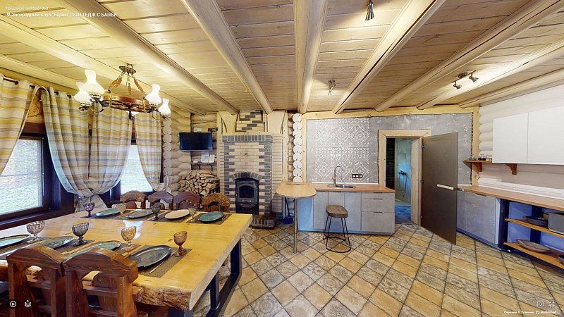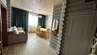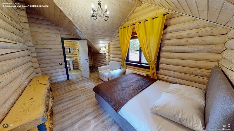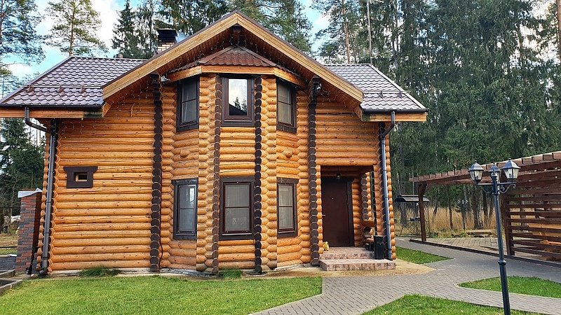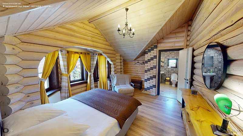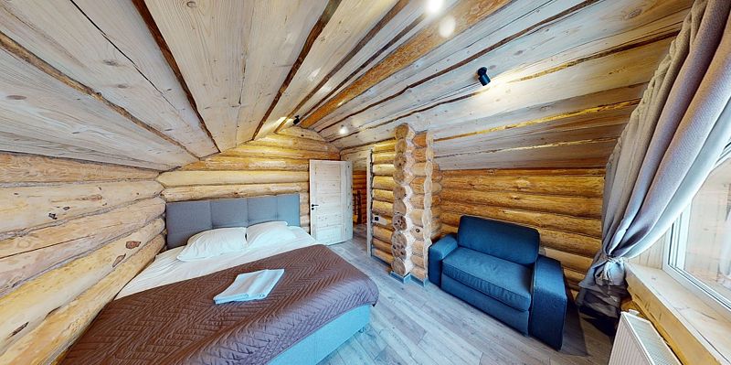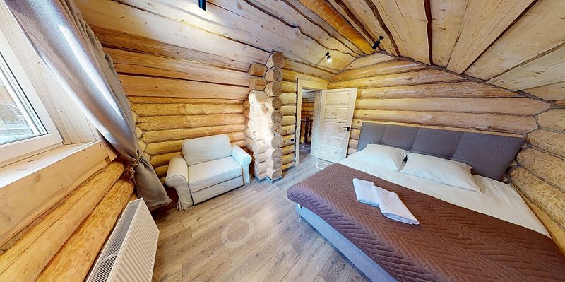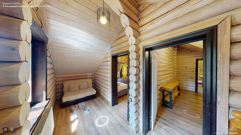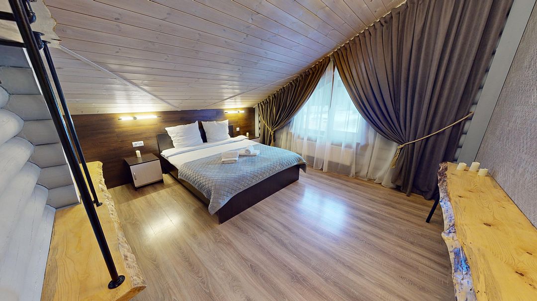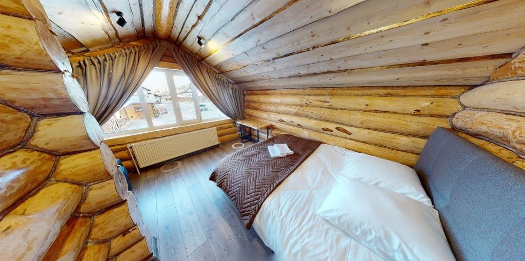 На первом этаже располагается гостиная с камином, мягкой мебелью и кухня, а также русская баня на дровах с бассейном. На втором — две спальни, оснащенные двуспальными кроватями и отдельными ванными комнатами, в каждой спальне кресло-кровать. Размещение 4 человека, возможно 5 дополнительных мест. На кухне холодильник, микроволновая печь, чайник, посуда, столовые приборы. Тапочки, полотенца для бани — входят в стоимость проживания. Бесплатный Wi-Fi, TV, теплые полы для дополнительного комфорта. В коттедже есть внутренний двор, где расположены мангальная зона и сибирский чан на костре.