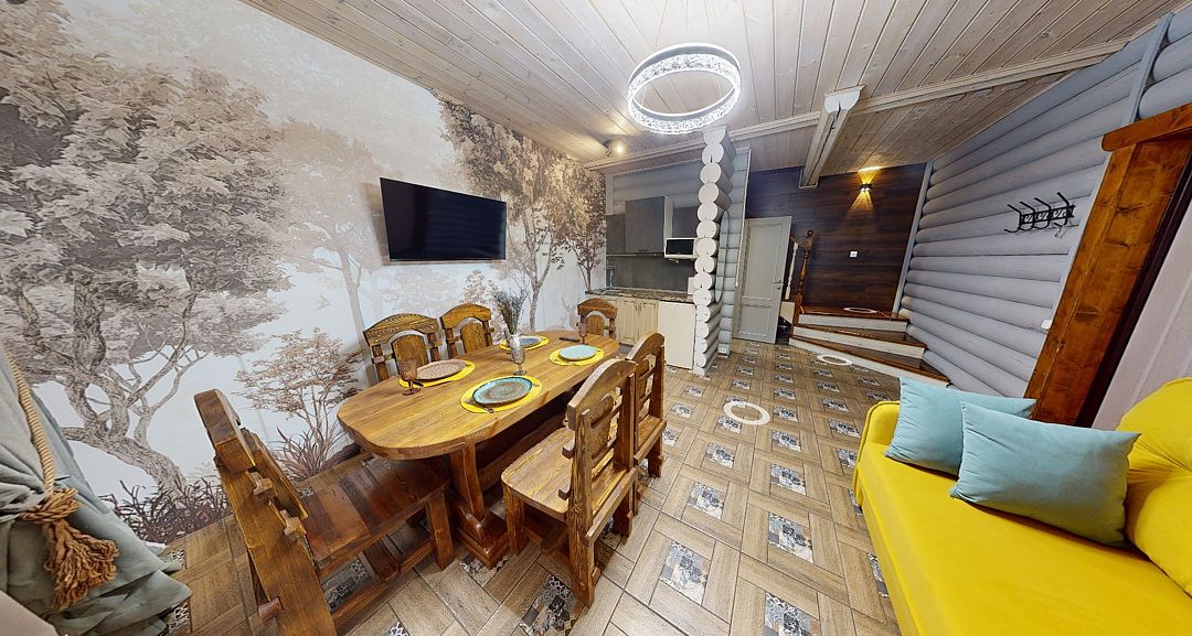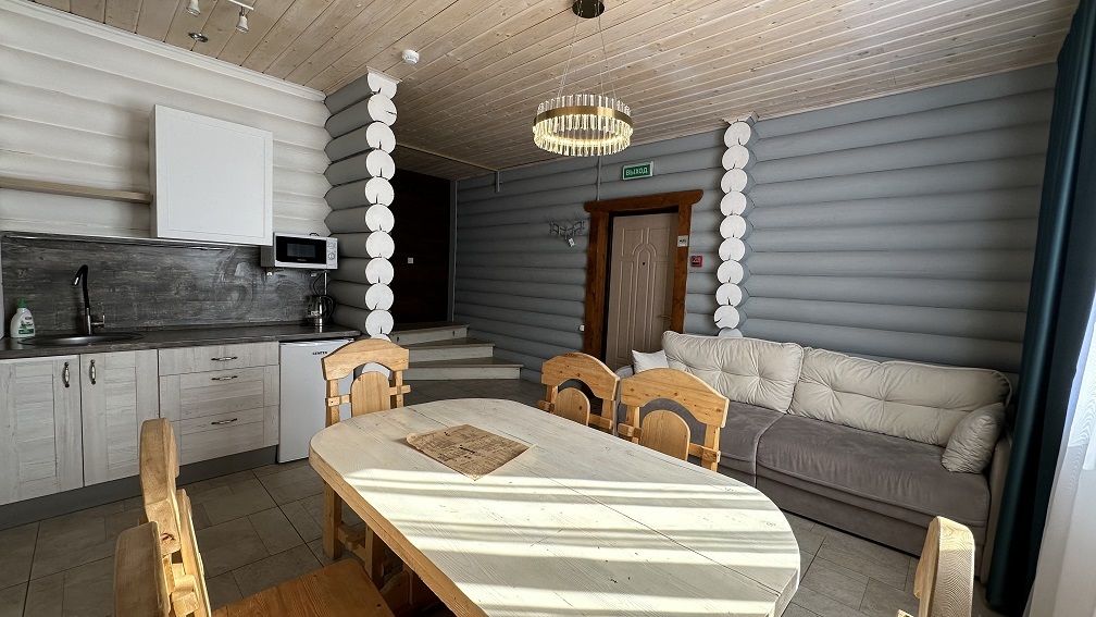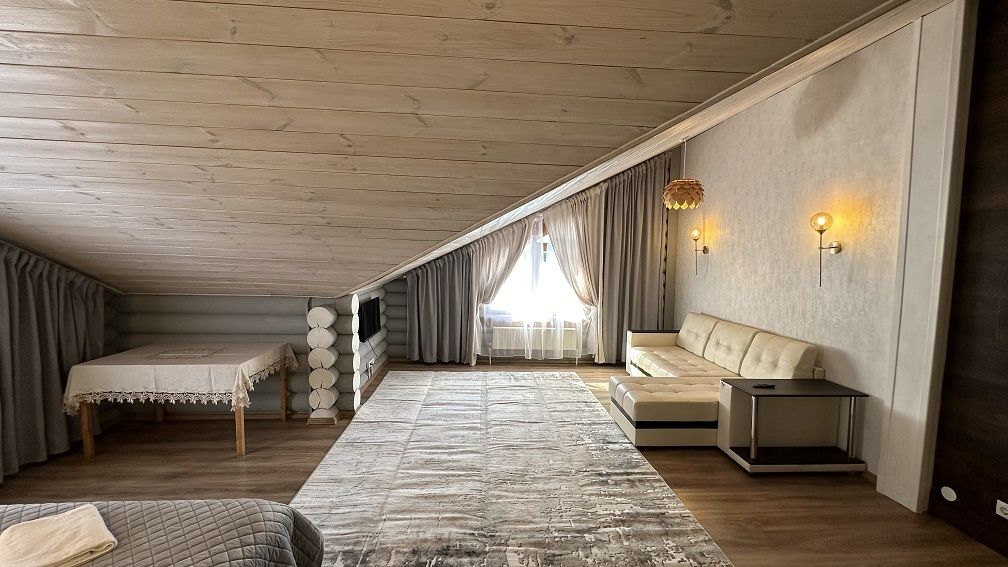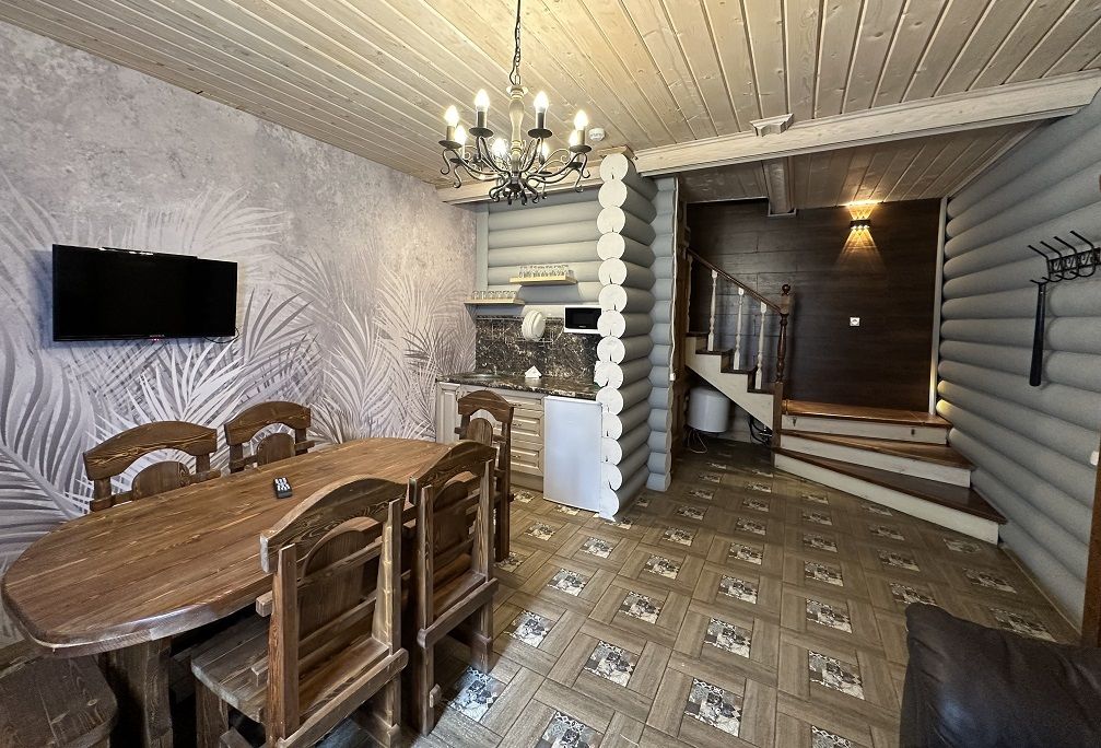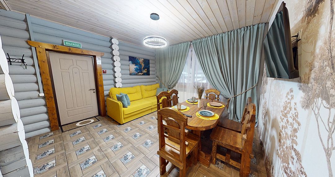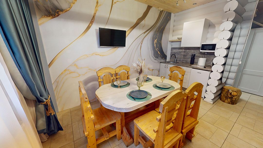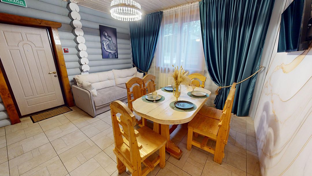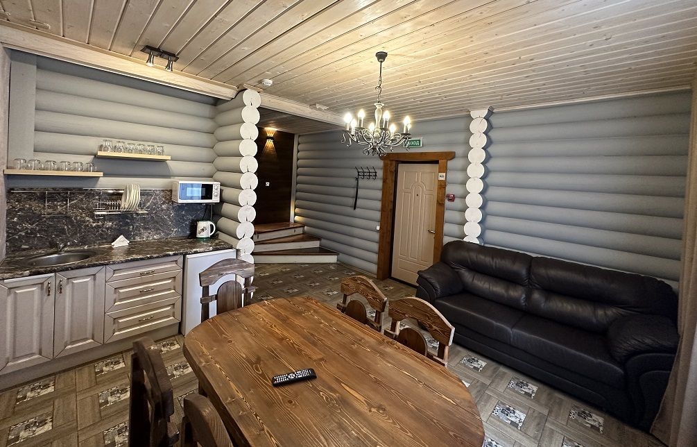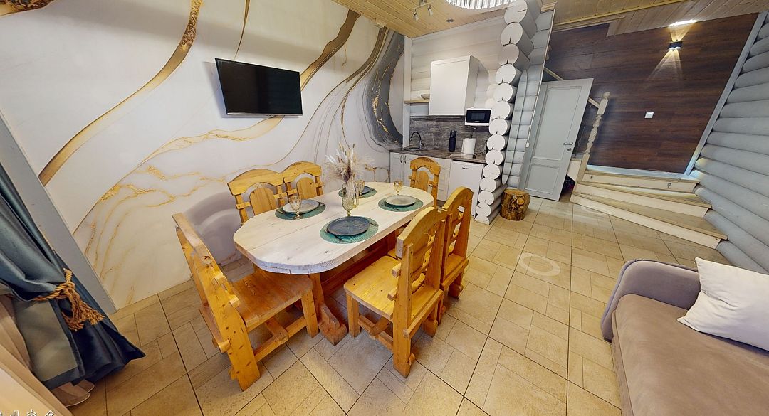 На первом этаже гостиная 48м2 с большим обеденным столом, мягкой мебелью и мини-кухней, где можно провести мероприятие до 20 гостей, а также русская баня на дровах. На втором — две спальни с двуспальными кроватями, в каждой спальне кресло-кровать. Размещение 4 человека, возможно 4 дополнительных места. На кухне холодильник, микроволновая печь, чайник, посуда и столовые приборы. Полотенца для бани, тапочки входят в стоимость проживания. Бесплатный Wi-Fi, smart TV, теплые полы для дополнительного комфорта. Есть собственный внутренний двор, где расположены ледяная купель, чан на костре и мангальная зона.