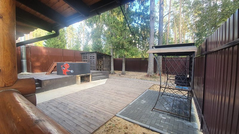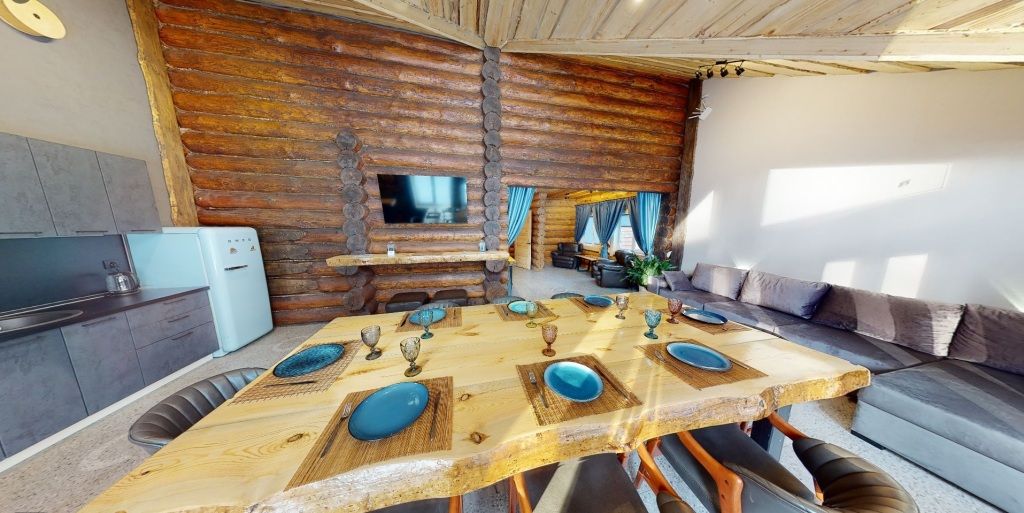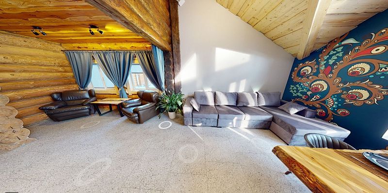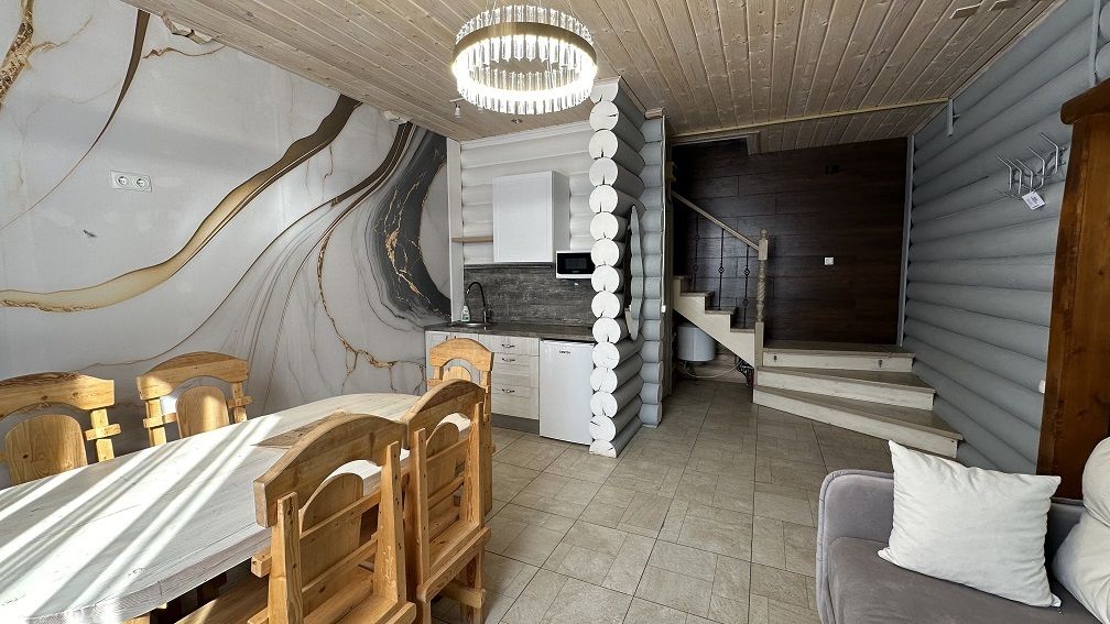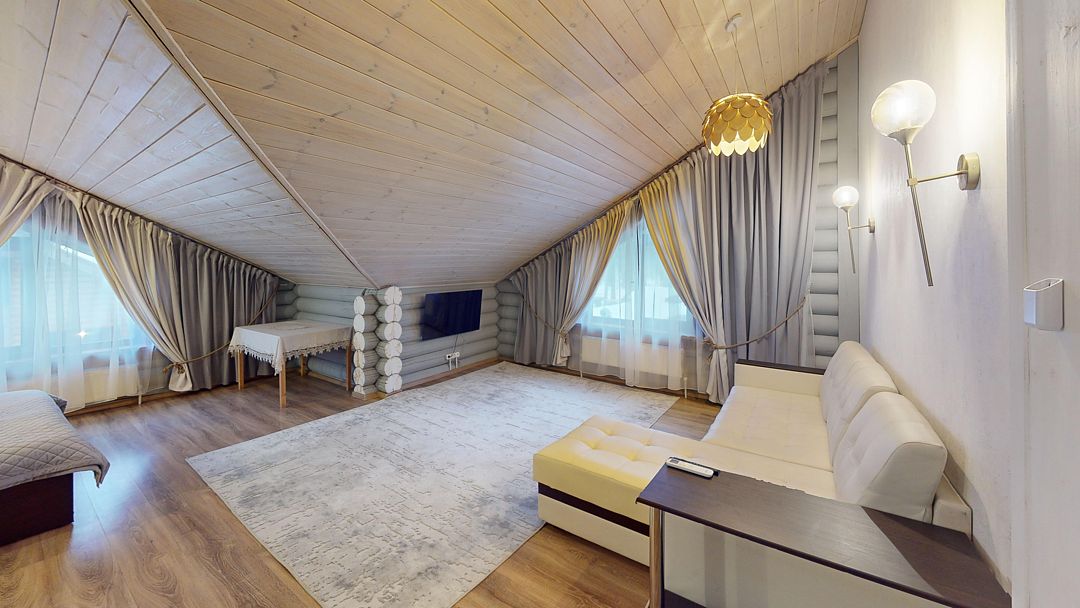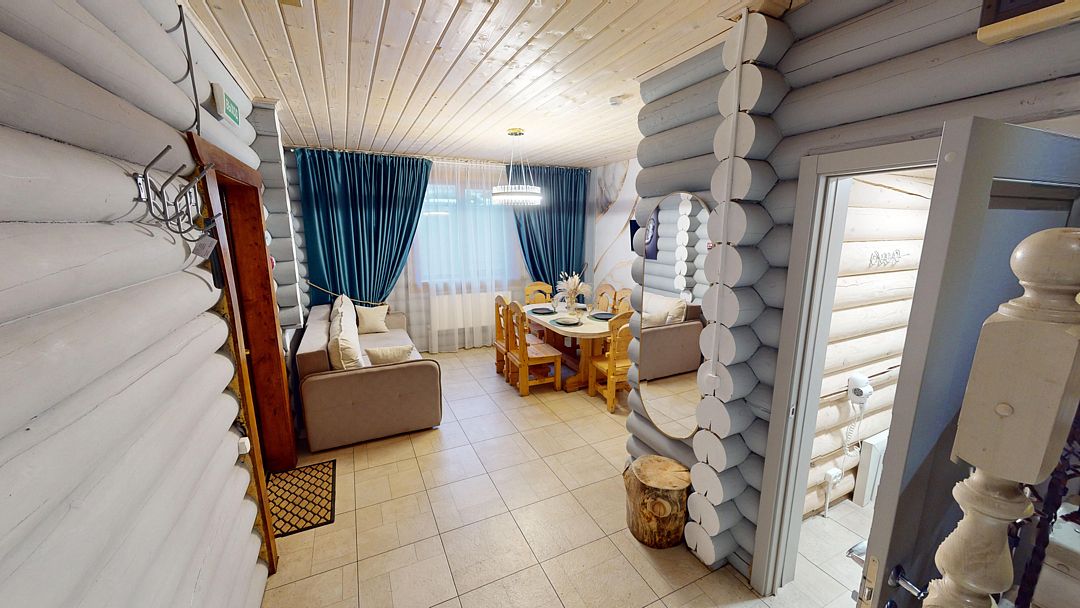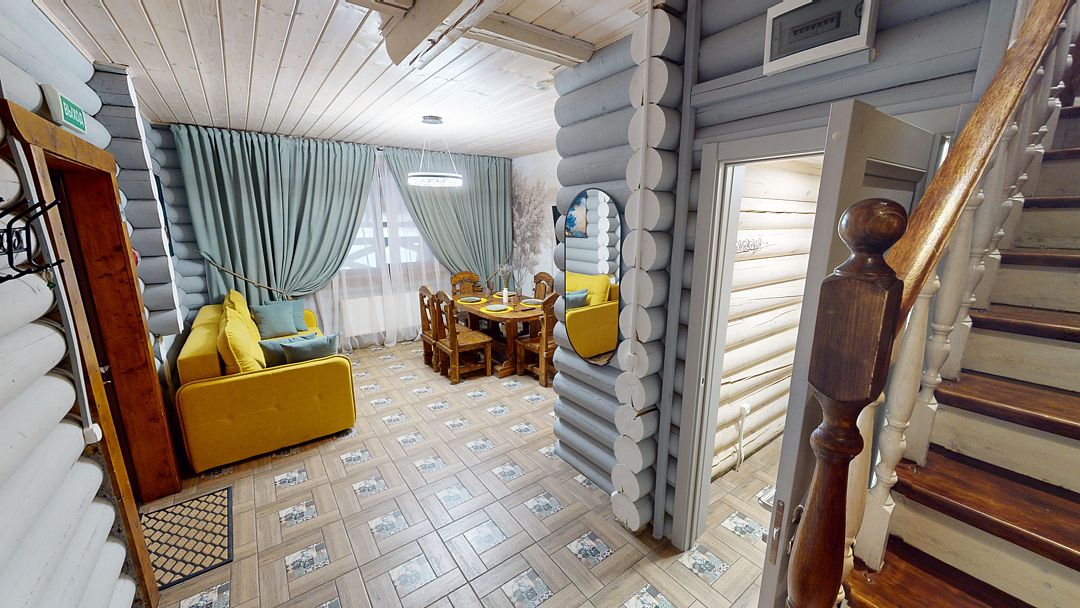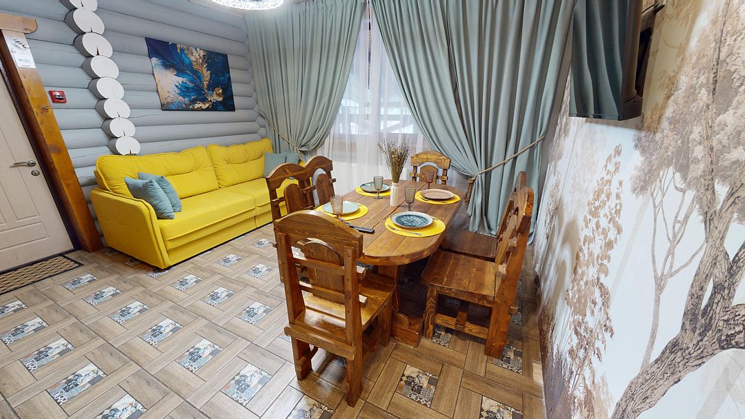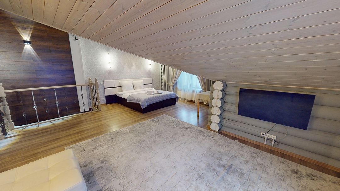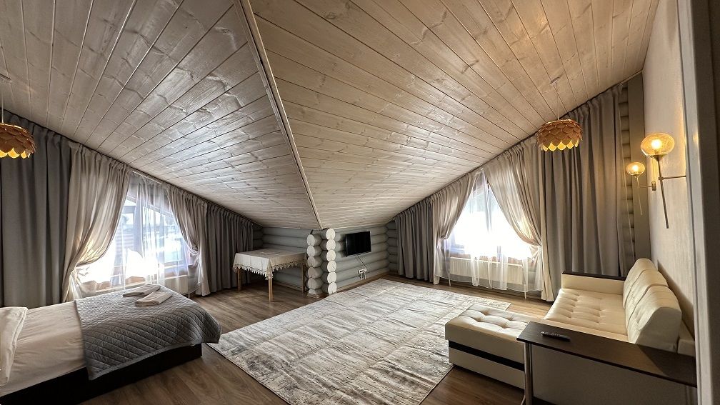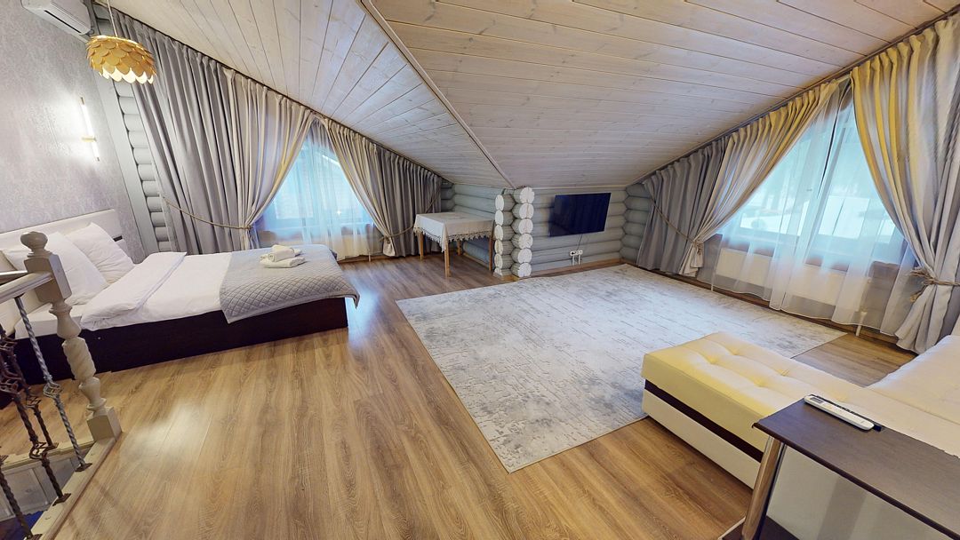 На первом этаже гостиная 48м2 с большим обеденным столом, мягкой мебелью и мини-кухней, где можно провести мероприятие до 20 гостей, а также русская баня на дровах. На втором — две спальни с двуспальными кроватями, в каждой спальне кресло-кровать. Размещение 4 человека, возможно 4 дополнительных места. На кухне холодильник, микроволновая печь, чайник, посуда и столовые приборы. Полотенца для бани, тапочки входят в стоимость проживания. Бесплатный Wi-Fi, smart TV, теплые полы для дополнительного комфорта. Есть собственный внутренний двор, где расположены ледяная купель, чан на костре и мангальная зона.