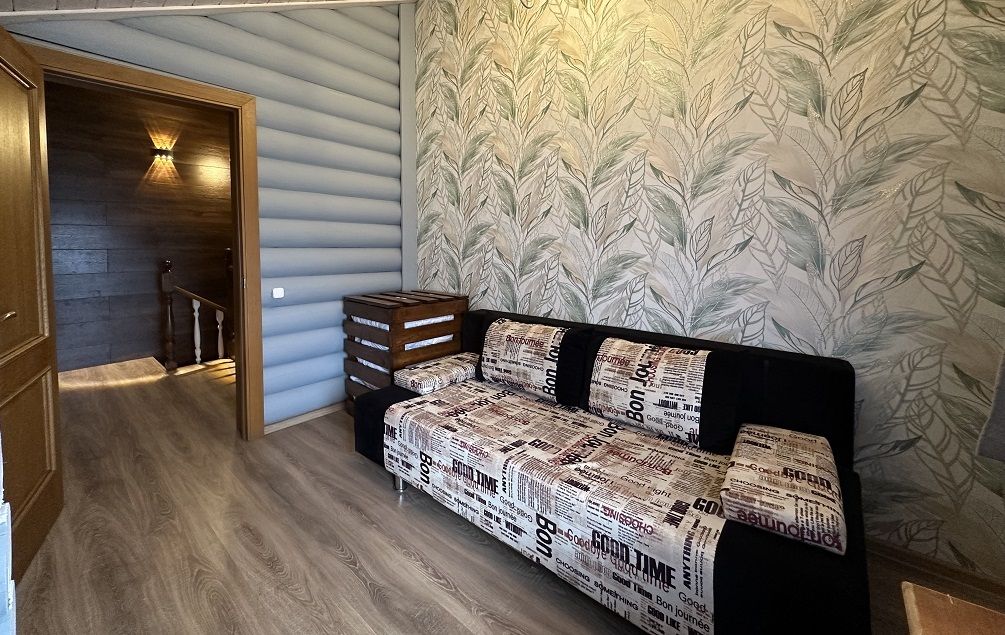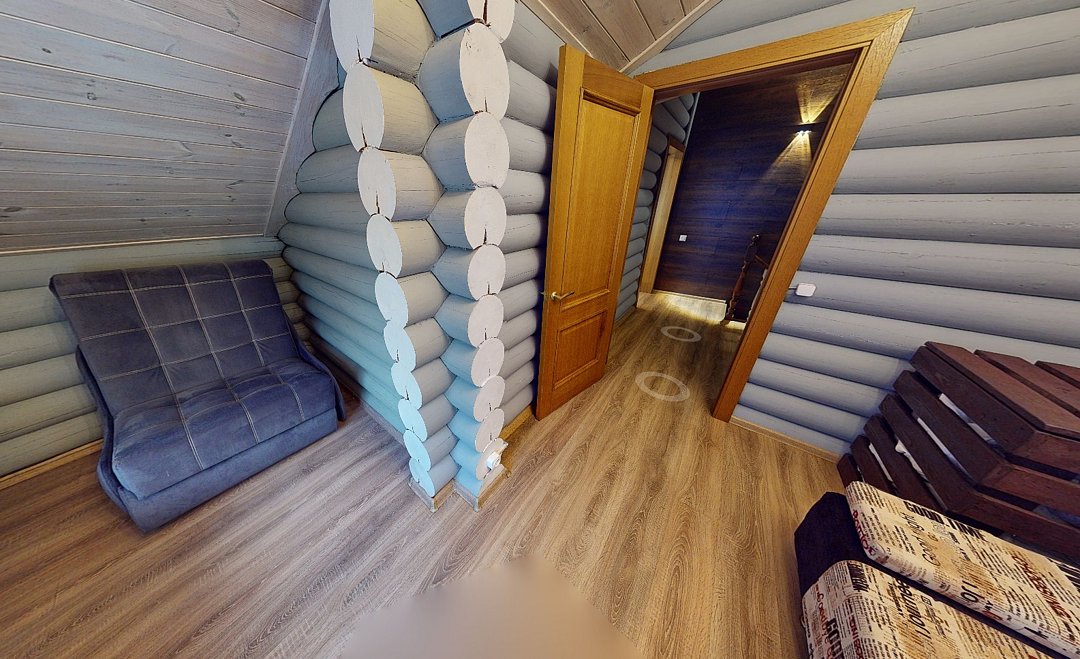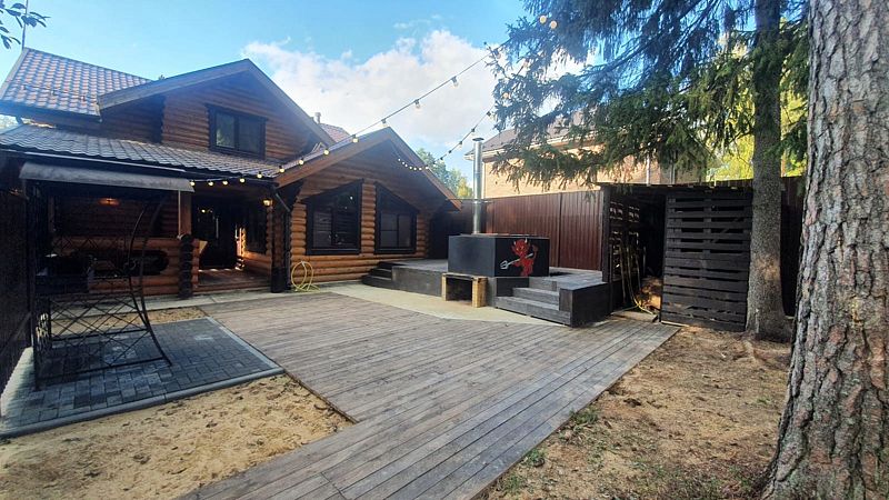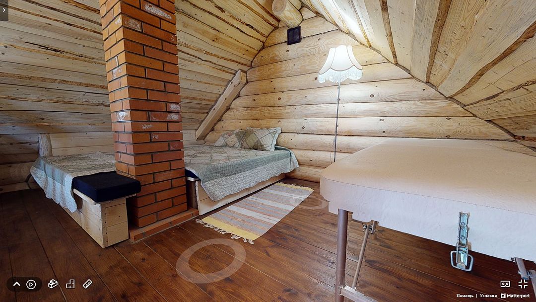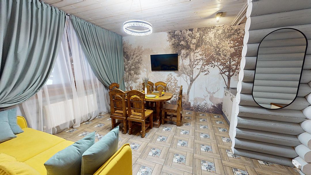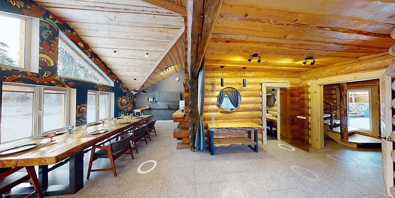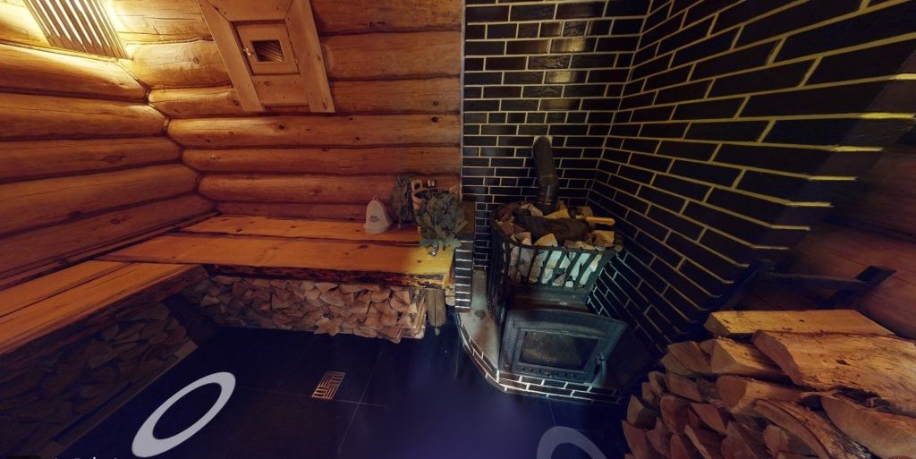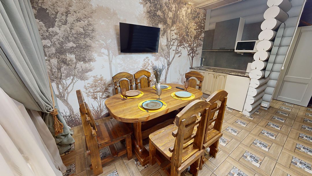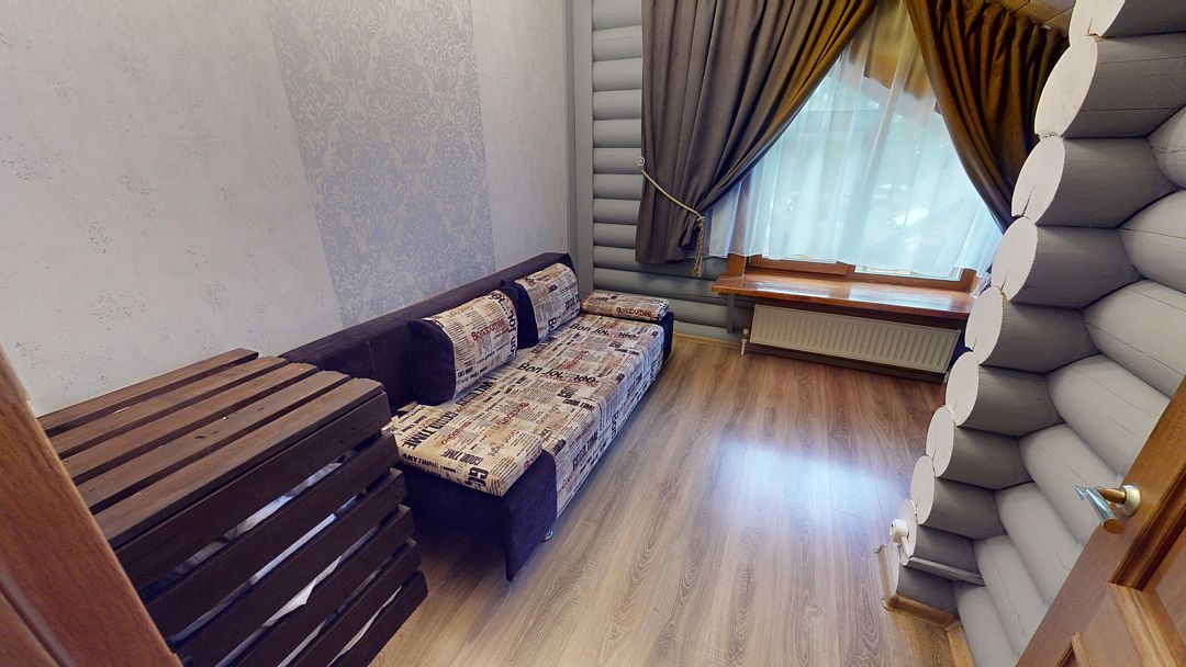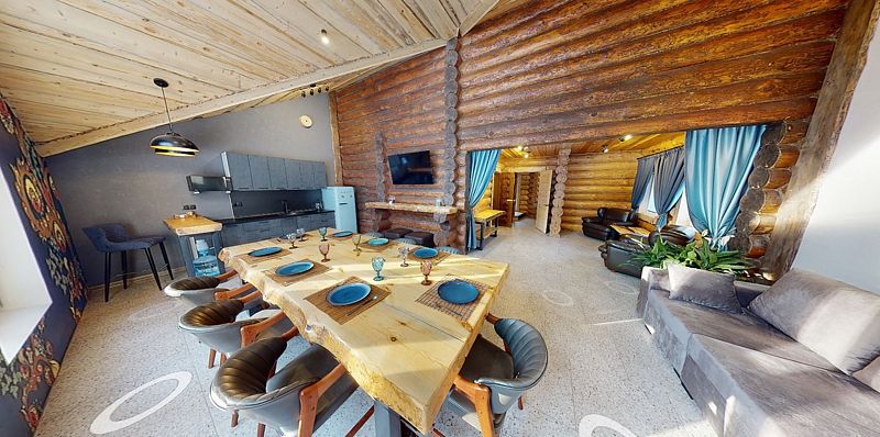 На первом этаже гостиная 48м2 с большим обеденным столом, мягкой мебелью и мини-кухней, где можно провести мероприятие до 20 гостей, а также русская баня на дровах. На втором — две спальни с двуспальными кроватями, в каждой спальне кресло-кровать. Размещение 4 человека, возможно 4 дополнительных места. На кухне холодильник, микроволновая печь, чайник, посуда и столовые приборы. Полотенца для бани, тапочки входят в стоимость проживания. Бесплатный Wi-Fi, smart TV, теплые полы для дополнительного комфорта. Есть собственный внутренний двор, где расположены ледяная купель, чан на костре и мангальная зона.