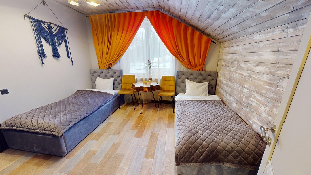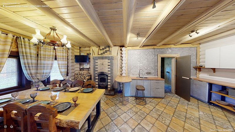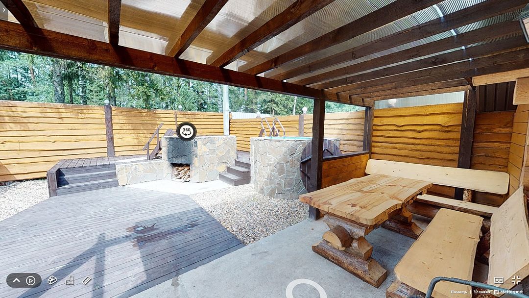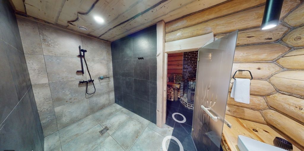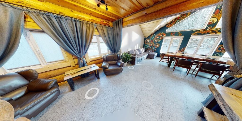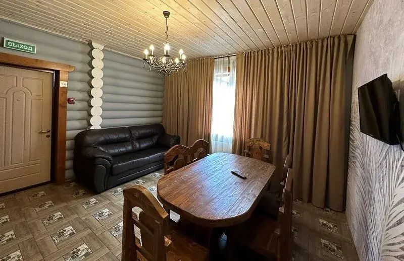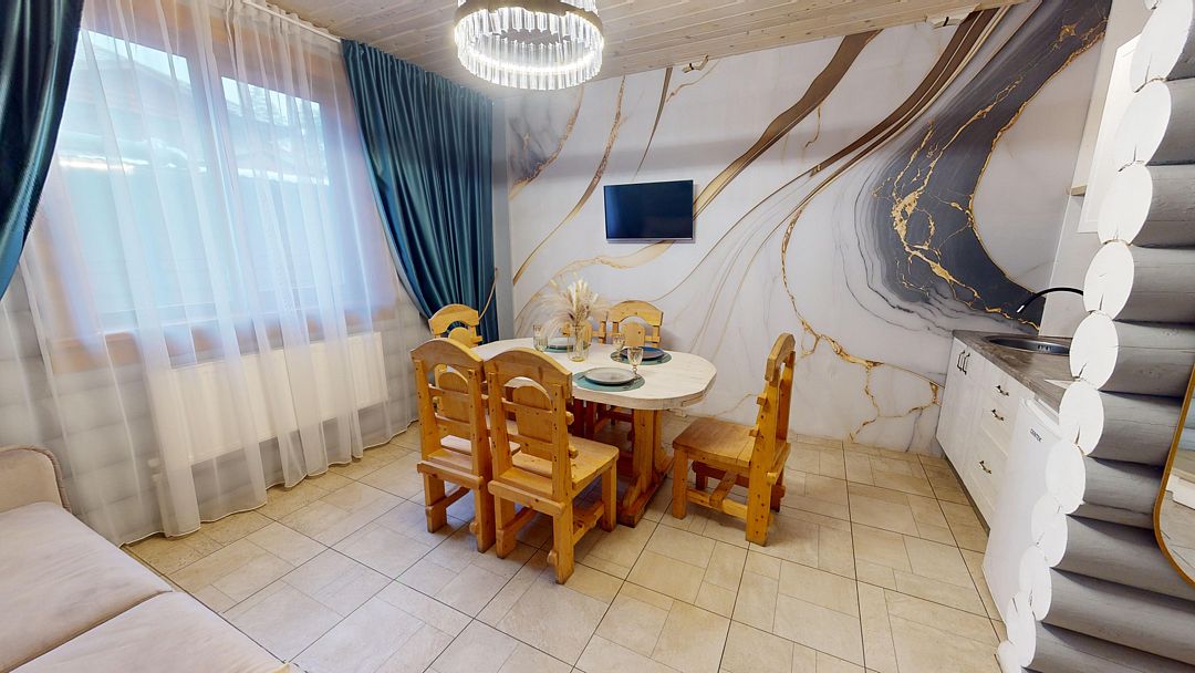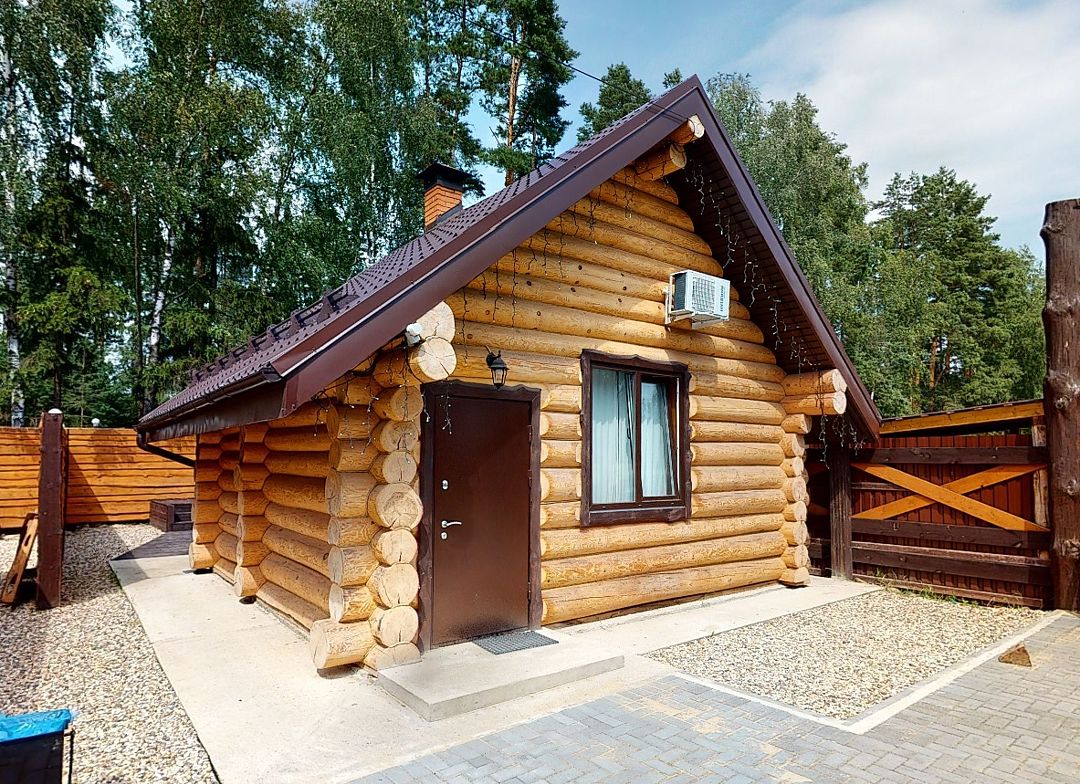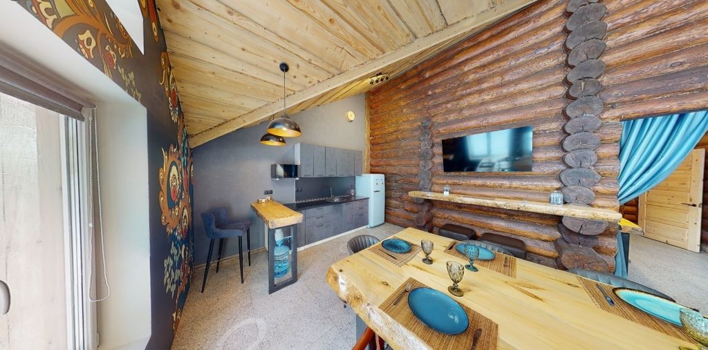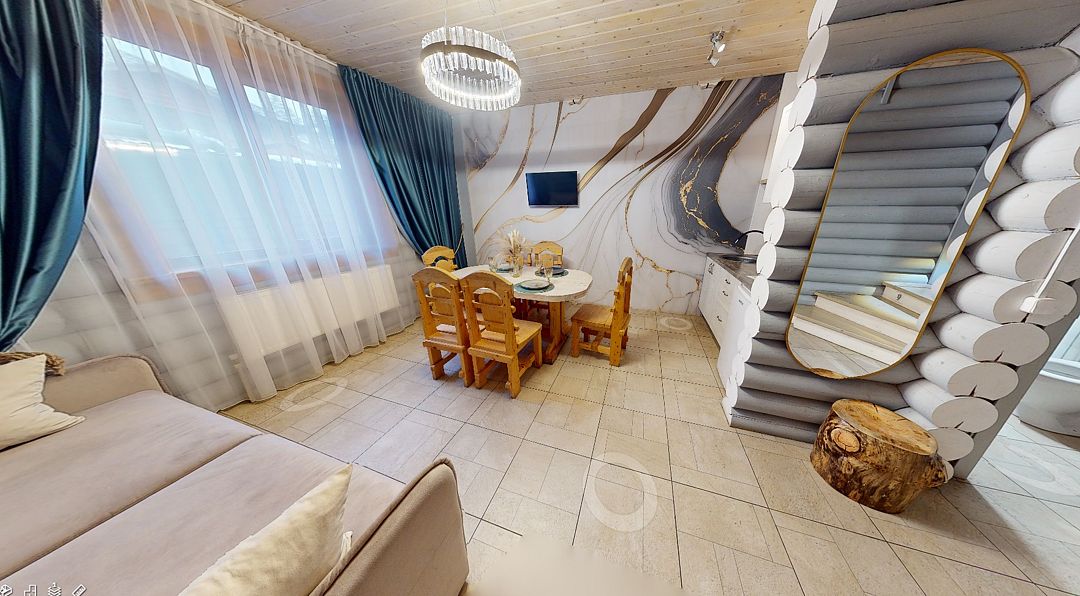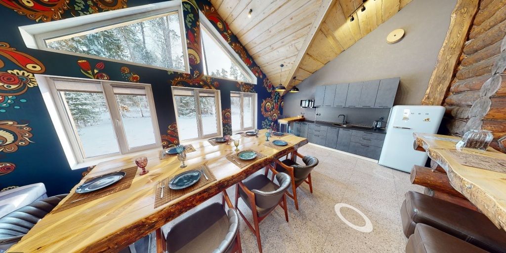 На первом этаже гостиная 48м2 с большим обеденным столом, мягкой мебелью и мини-кухней, где можно провести мероприятие до 20 гостей, а также русская баня на дровах. На втором — две спальни с двуспальными кроватями, в каждой спальне кресло-кровать. Размещение 4 человека, возможно 4 дополнительных места. На кухне холодильник, микроволновая печь, чайник, посуда и столовые приборы. Полотенца для бани, тапочки входят в стоимость проживания. Бесплатный Wi-Fi, smart TV, теплые полы для дополнительного комфорта. Есть собственный внутренний двор, где расположены ледяная купель, чан на костре и мангальная зона.