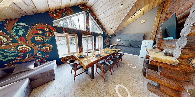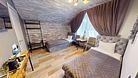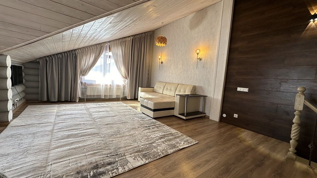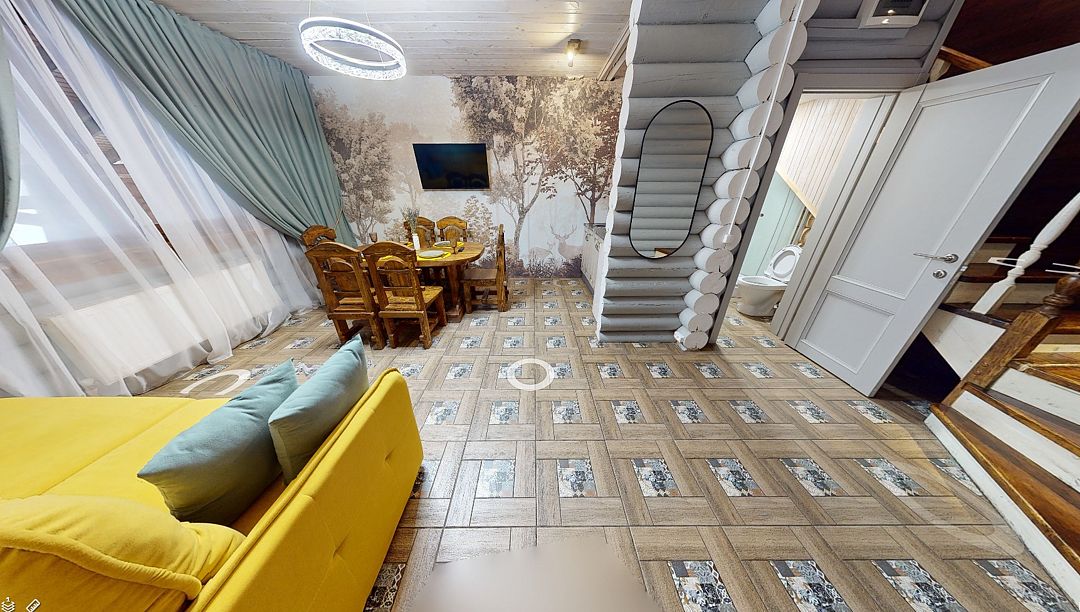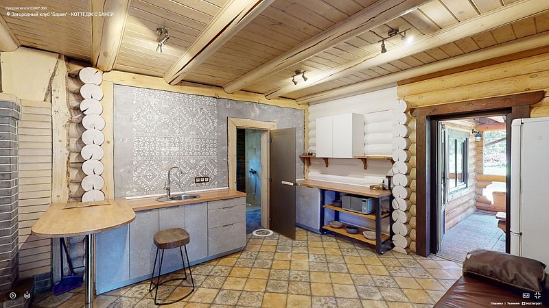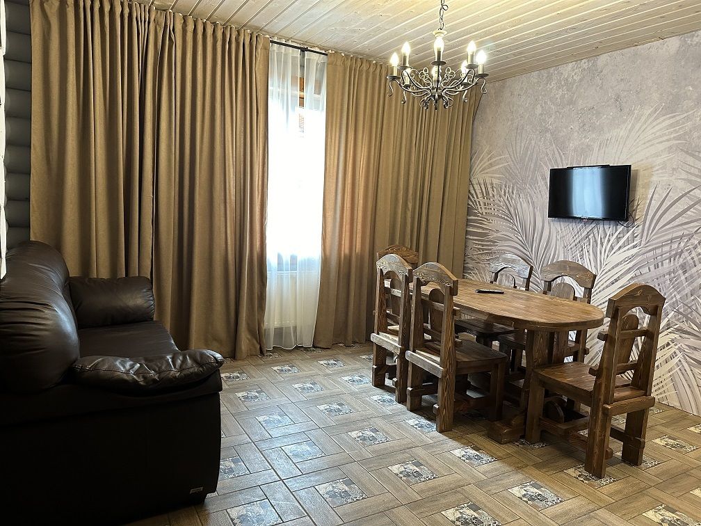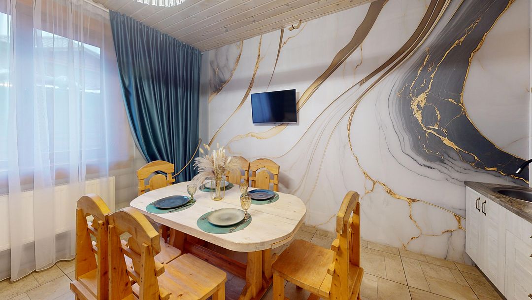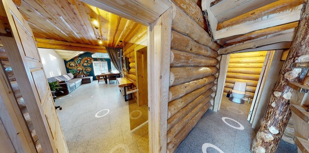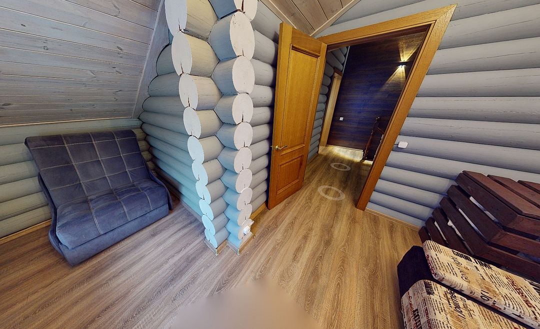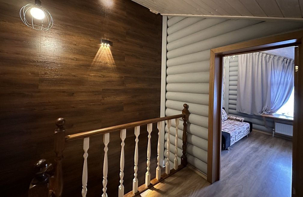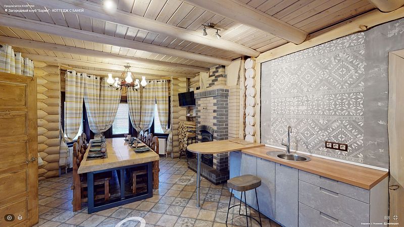 На первом этаже гостиная 48м2 с большим обеденным столом, мягкой мебелью и мини-кухней, где можно провести мероприятие до 20 гостей, а также русская баня на дровах. На втором — две спальни с двуспальными кроватями, в каждой спальне кресло-кровать. Размещение 4 человека, возможно 4 дополнительных места. На кухне холодильник, микроволновая печь, чайник, посуда и столовые приборы. Полотенца для бани, тапочки входят в стоимость проживания. Бесплатный Wi-Fi, smart TV, теплые полы для дополнительного комфорта. Есть собственный внутренний двор, где расположены ледяная купель, чан на костре и мангальная зона.