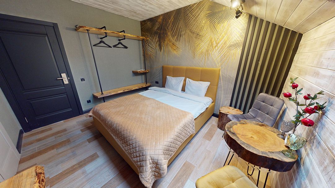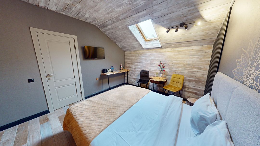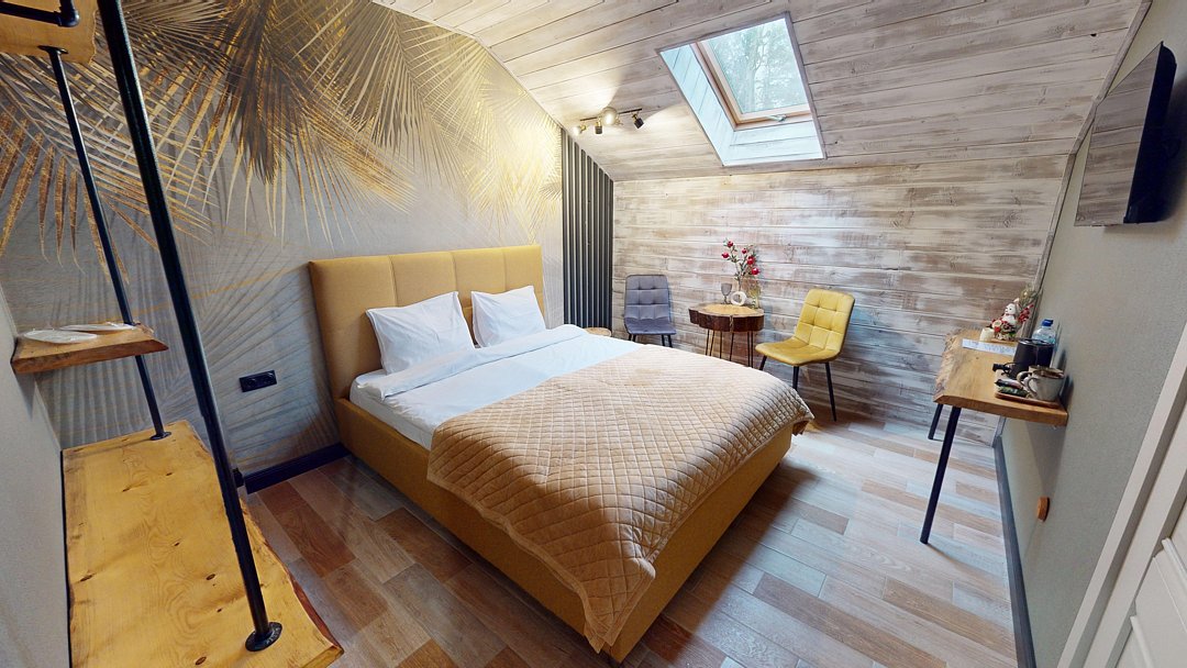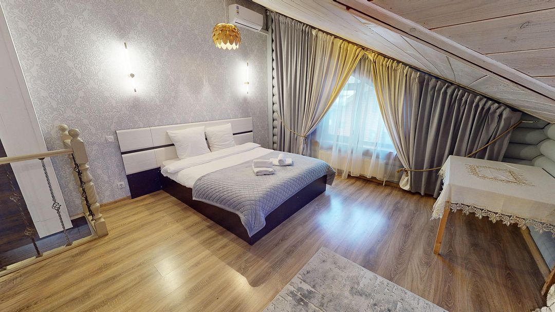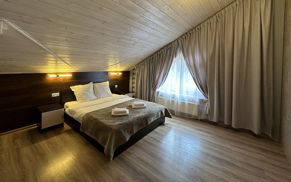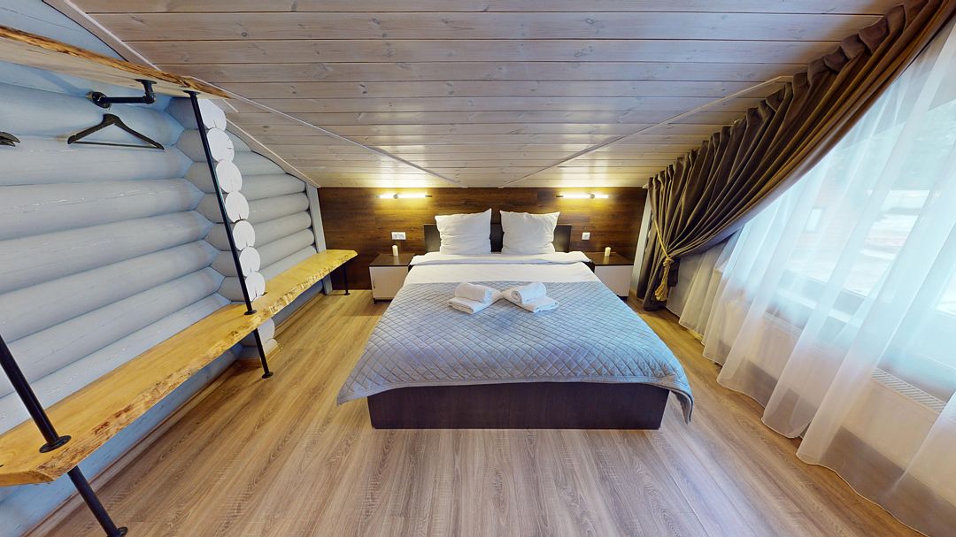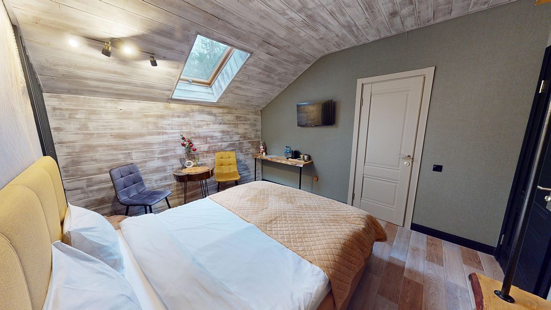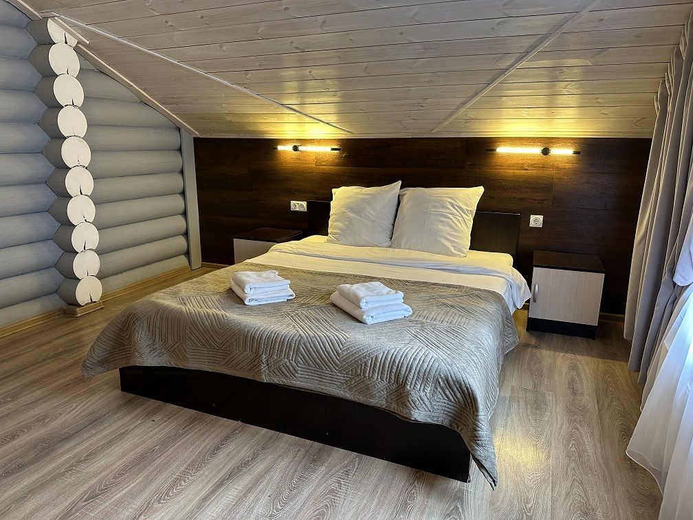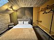 В коттедже Люкс роскошная спальня на втором этаже, на первом этаже гостиная с мини-кухней, санузел и просторная терраса. Размещение 2 человека, возможно 4 дополнительных места. На кухне холодильник, микроволновая печь, чайник, посуда, столовые приборы. Постельное белье входит в стоимость проживания. Бесплатный Wi-Fi, Smart TV, теплые полы для дополнительного комфорта.