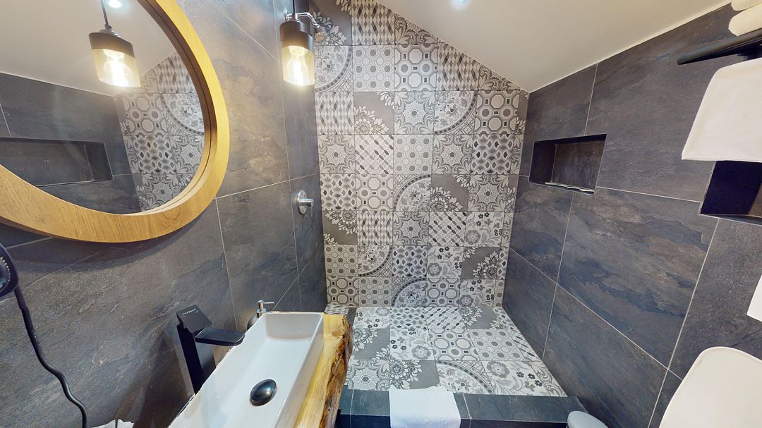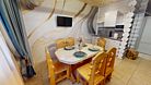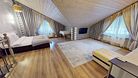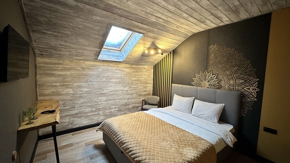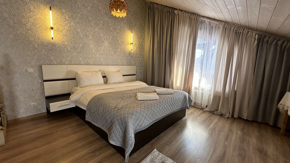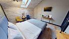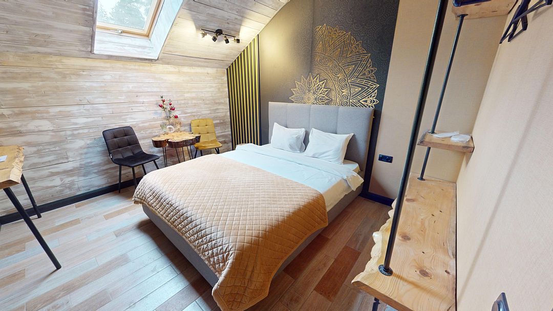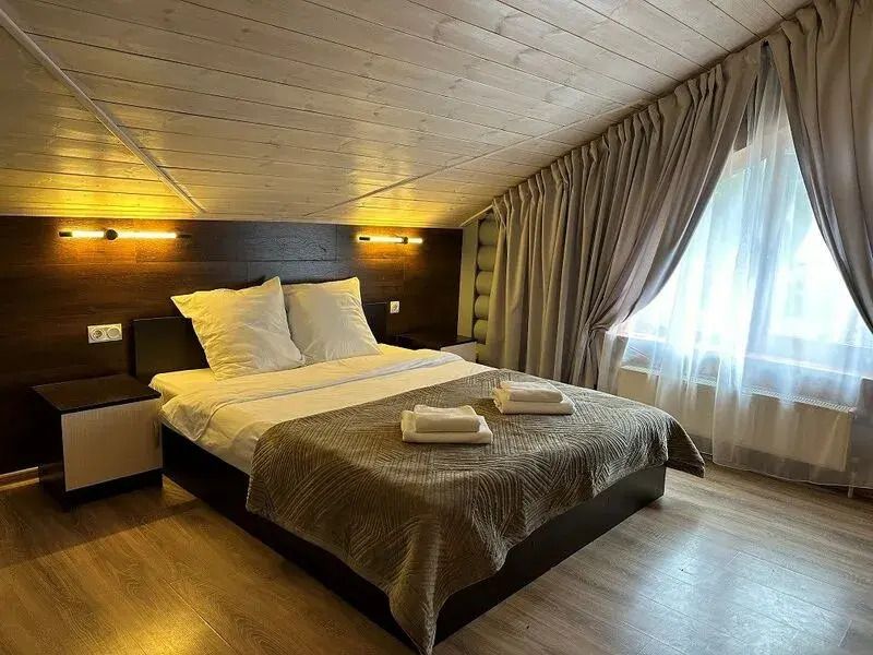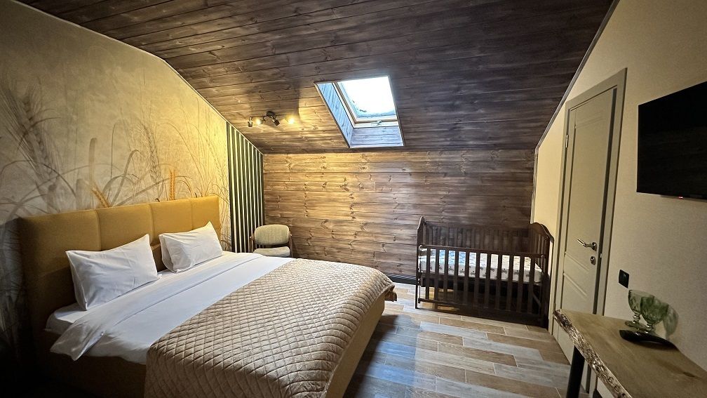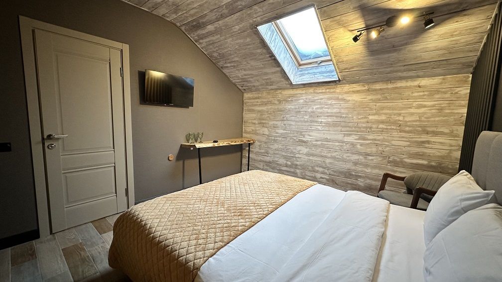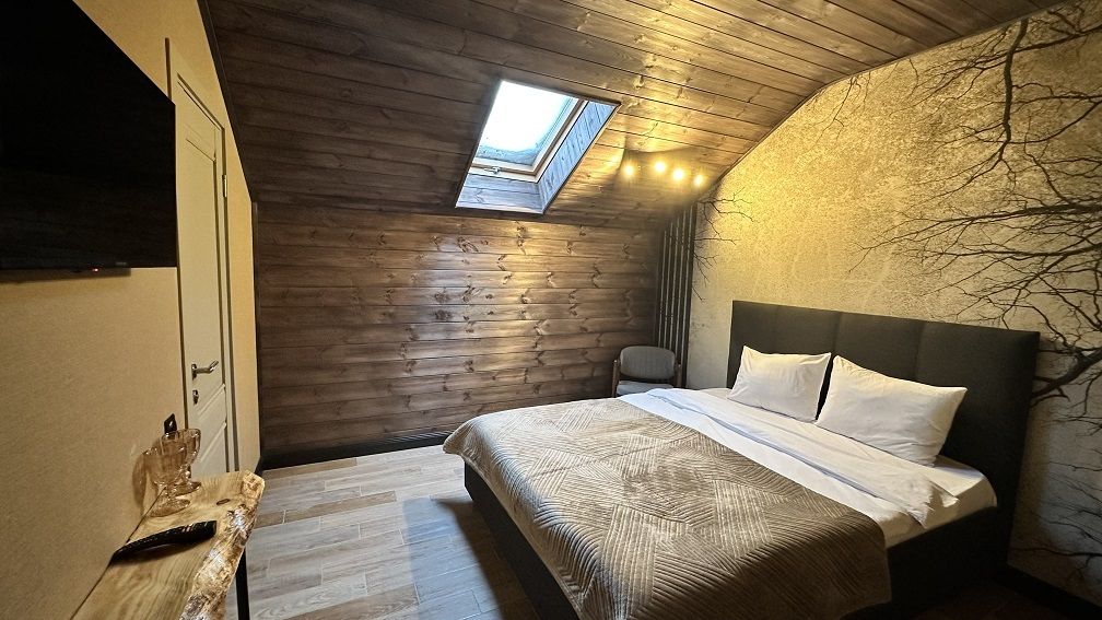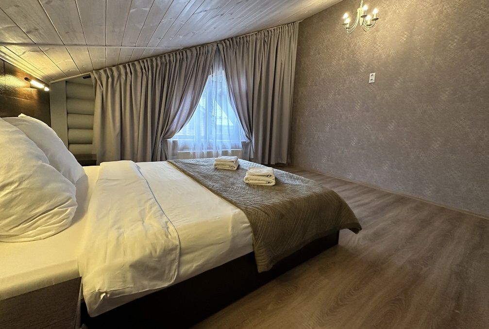 В коттедже Люкс роскошная спальня на втором этаже, на первом этаже гостиная с мини-кухней, санузел и просторная терраса. Размещение 2 человека, возможно 4 дополнительных места. На кухне холодильник, микроволновая печь, чайник, посуда, столовые приборы. Постельное белье входит в стоимость проживания. Бесплатный Wi-Fi, Smart TV, теплые полы для дополнительного комфорта.