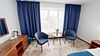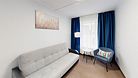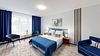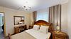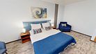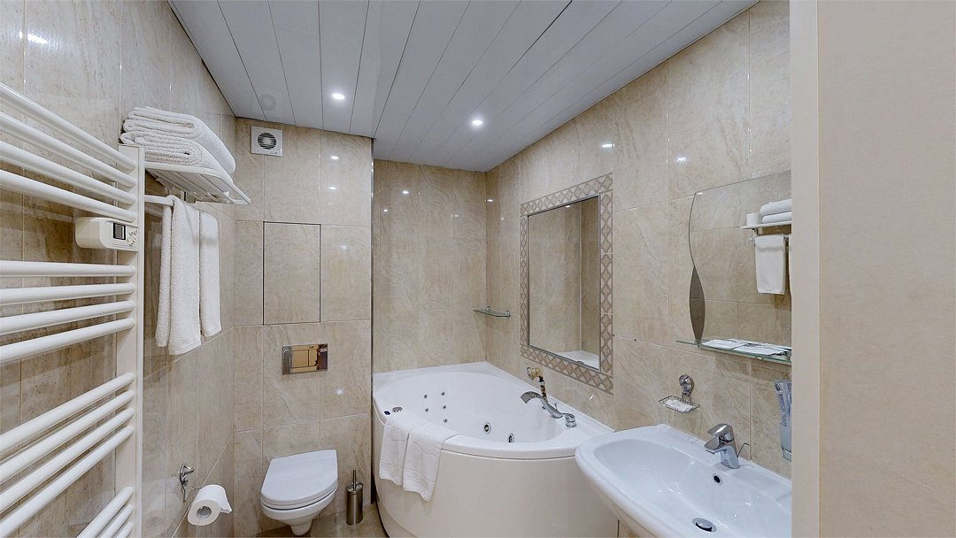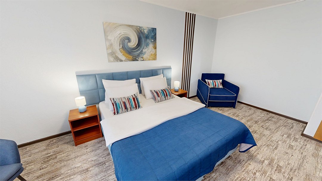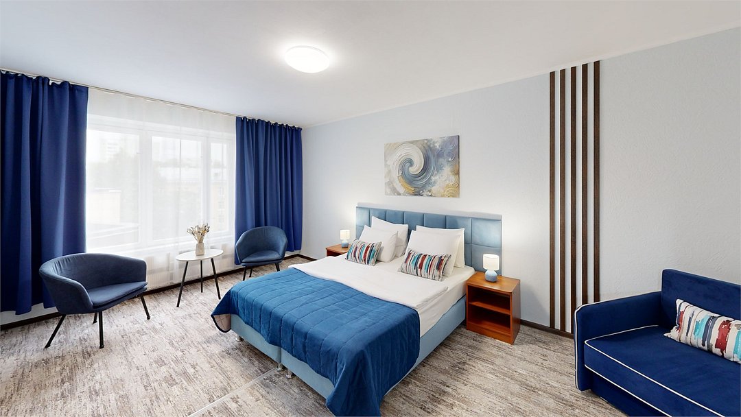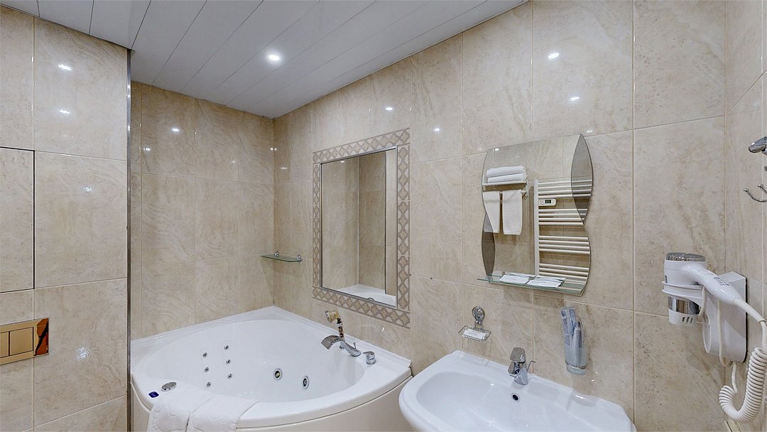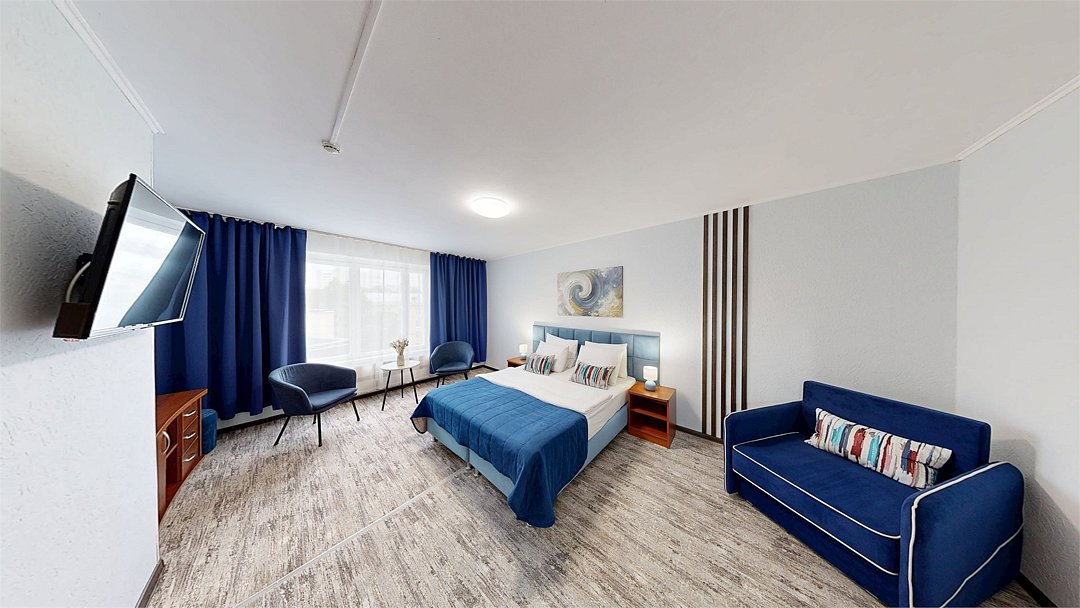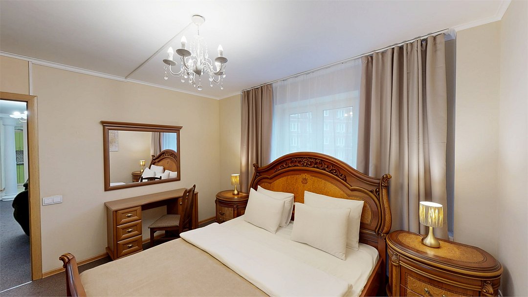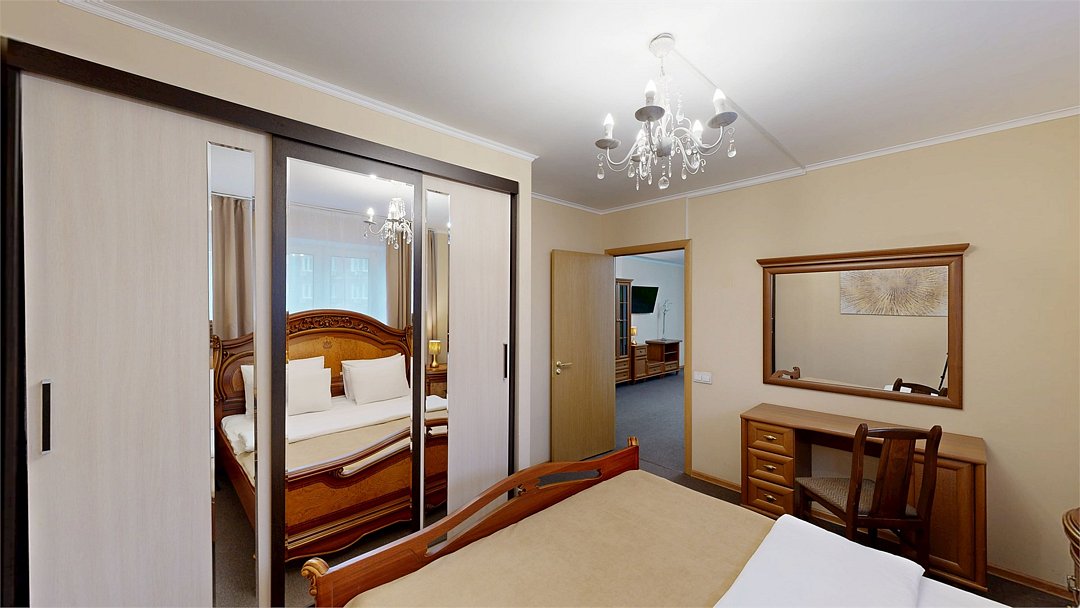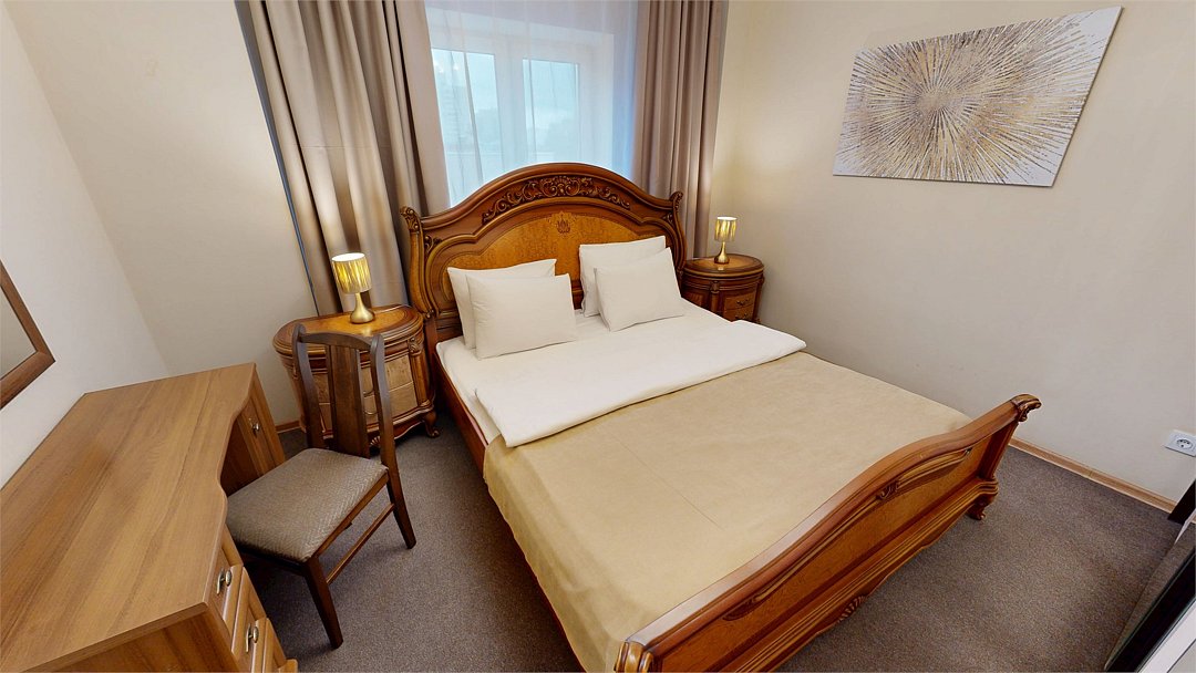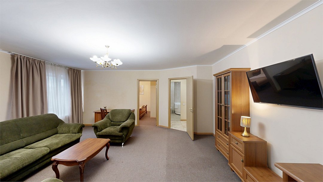 Двухкомнатный номер (спальня и гостиная), укомплектованный одной двуспальной кроватью, 2-мя тумбами, шкафами, столом, стулом, зеркалом, багажницей с вешалкой, телевизором, телефоном, мини-холодильником, чайником, WiFi. В гостиной – диван и два кресла, журнальный столик. В ванной комнате – современная сантехника, комплект полотенец, необходимые туалетные принадлежности.Услуги и удобства