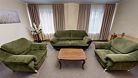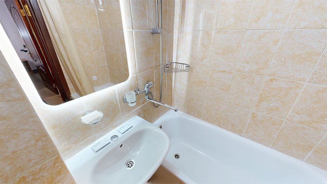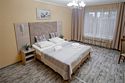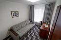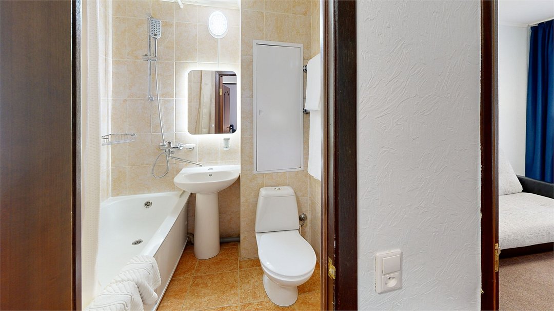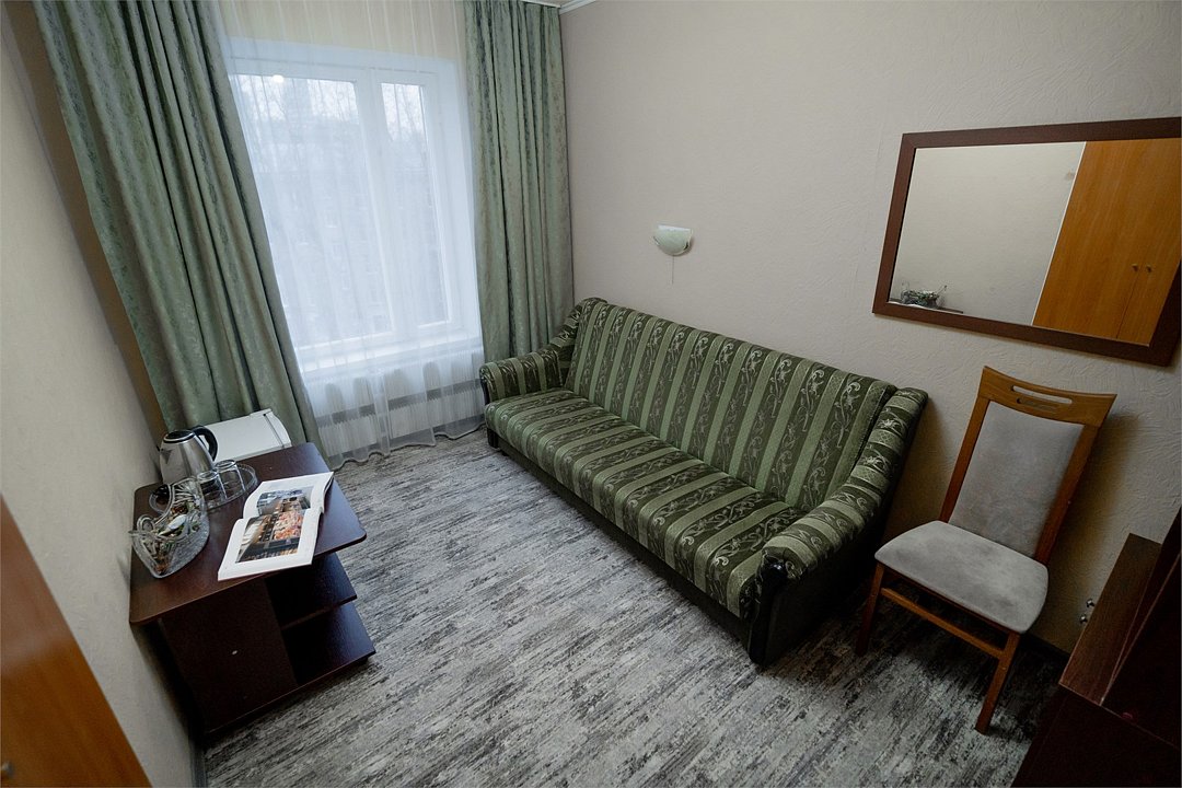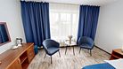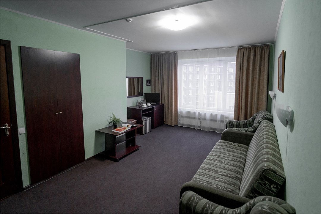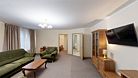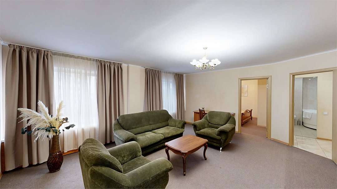 Двухкомнатный номер (спальня и гостиная), укомплектованный двумя удобными односпальными кроватями, 2-мя тумбами, шкафами, столом, стулом, зеркалом, багажницей с вешалкой, телевизором, мини-холодильником, чайником, WiFi. В гостиной – диван и два кресла, журнальный столик. В ванной комнате – современная сантехника, комплект полотенец, необходимые туалетные принадлежности.Услуги и удобства