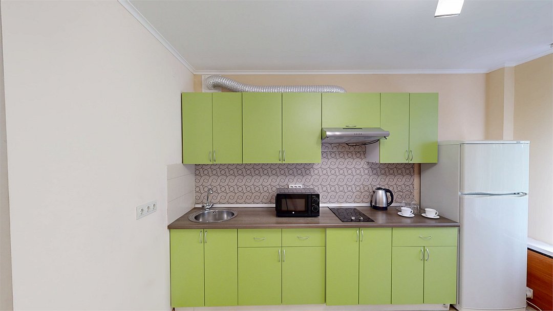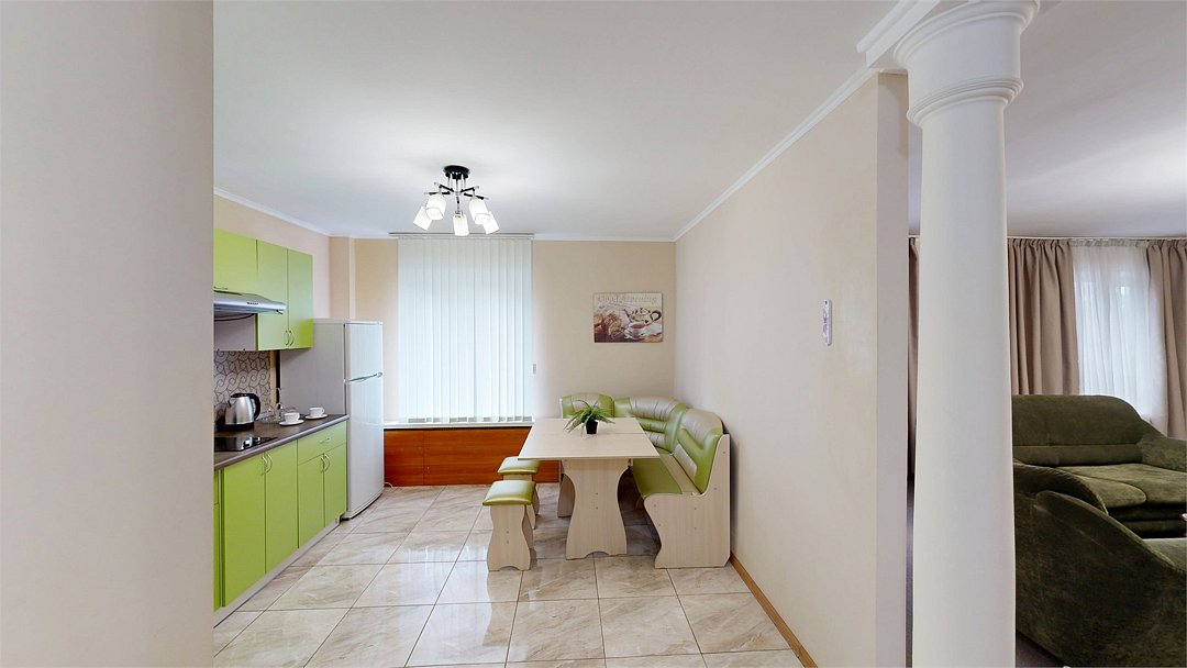 Двухкомнатный номер с кухней(спальня, гостиная и кухня), В этом номере есть все необходимое для комфортного отдыха. Просторная гостиная с большим диваном и журнальным столом , широкоформатным ЖК ТВ, мебельным гарнитуром. Если вы приехали по работе то просторный письменный стол в вашем распоряжении. В спальне двуспальная кровать с 2-мя прикроватными тумбами, косметическим столом с зеркалом и шкафом купе. Остановившись в этом номере Вам не надо думать где покушать. Кухня оснащена всем необходимым (варочная панель, холодильник, чайник, микроволновая печь, набор посуды). Санузел, ванна. В комплектацию номера входит гладильная доска, утюг и фен. WiFi.Услуги и удобства