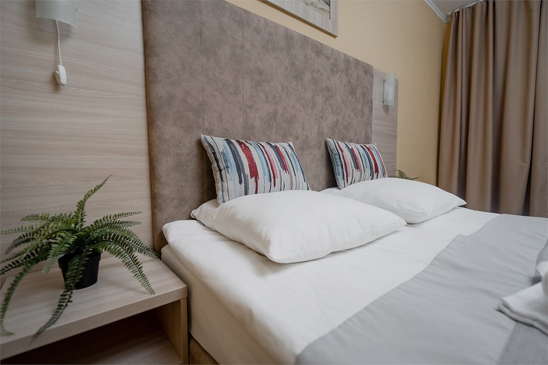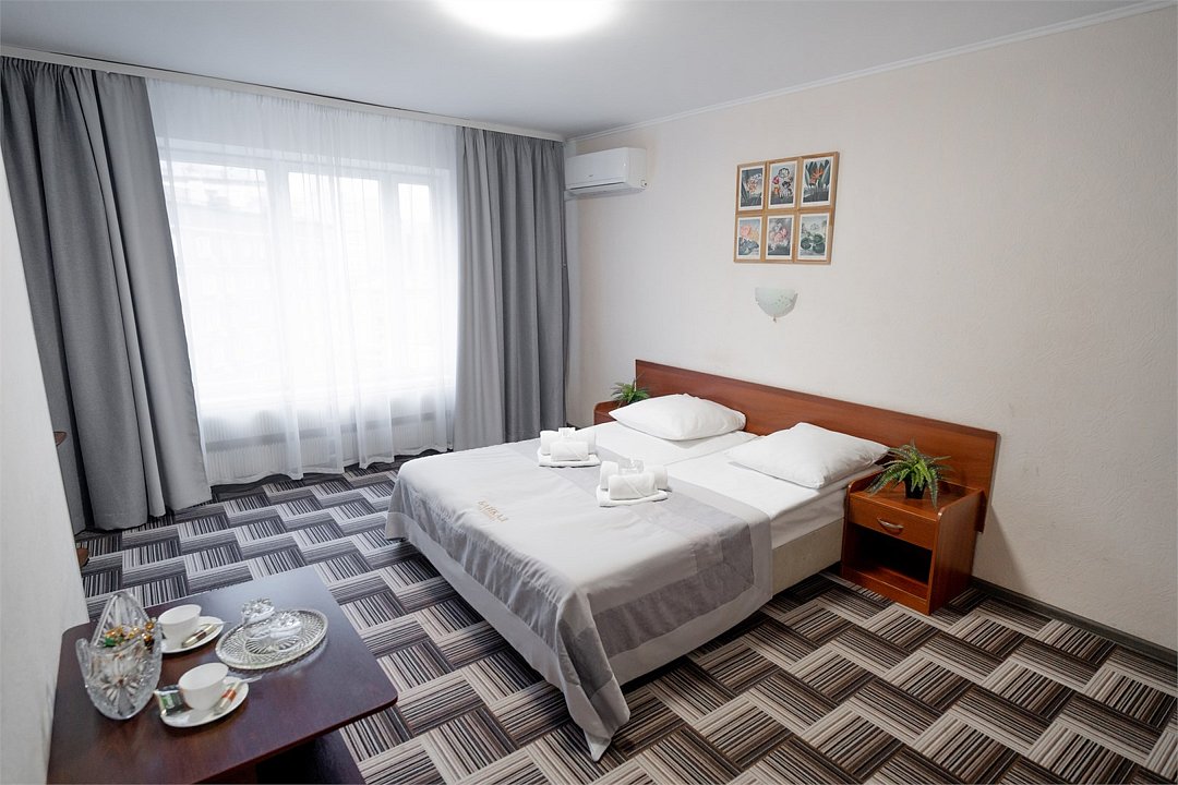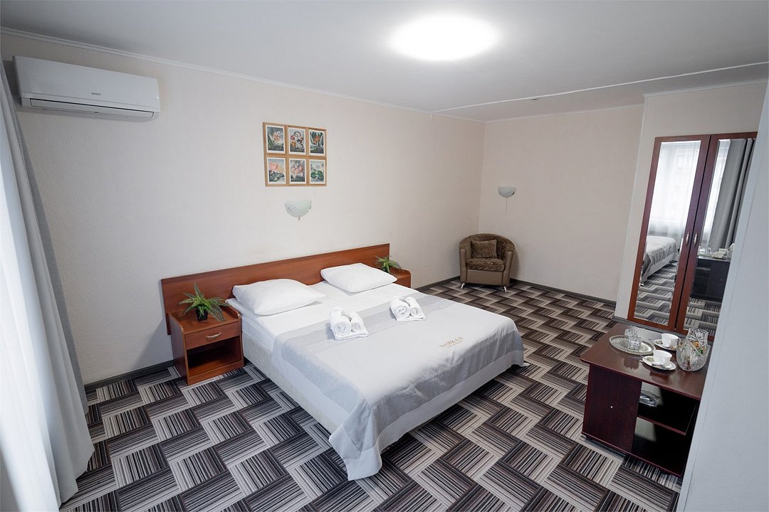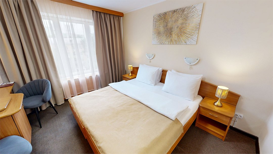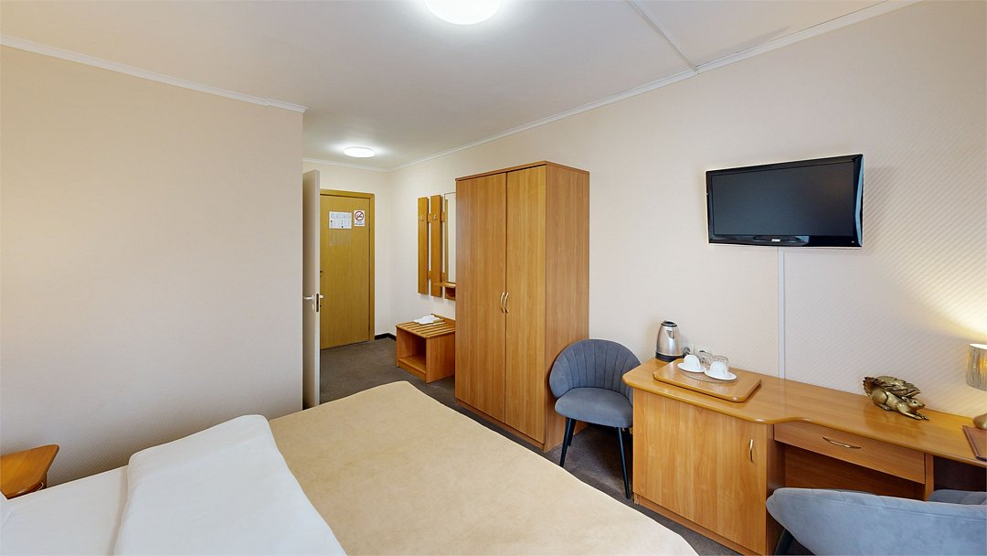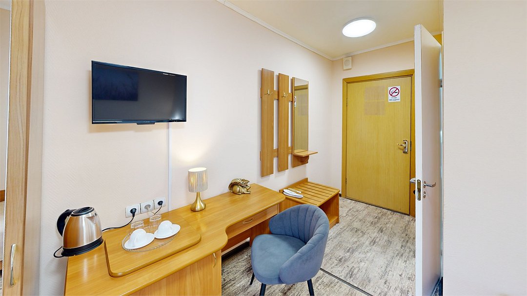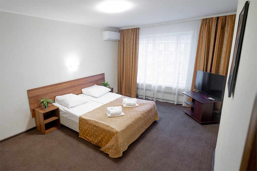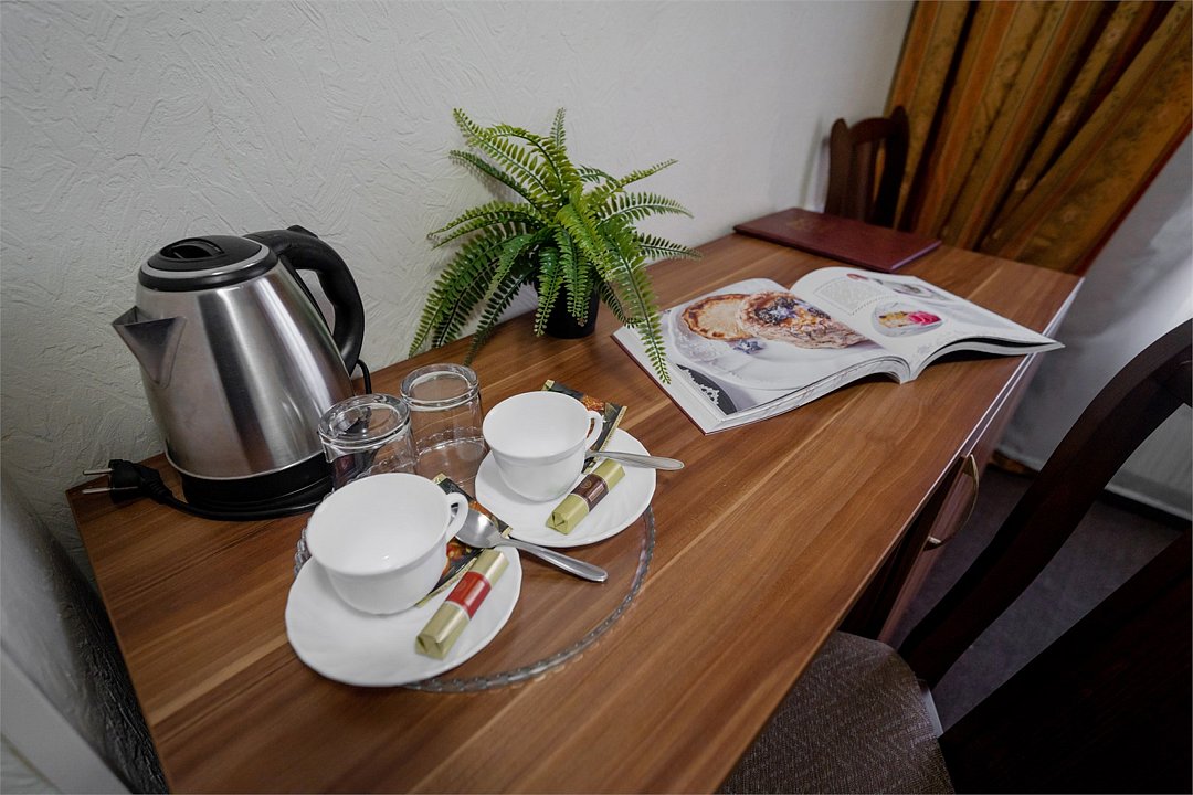 Однокомнатный номер, укомплектованный двумя удобными односпальными кроватями или одной двуспальной, 2-мя тумбами, шкафом, столом, стулом, зеркалом, багажницей с вешалкой, телевизором, мини-холодильником, чайником, WiFi.Услуги и удобства