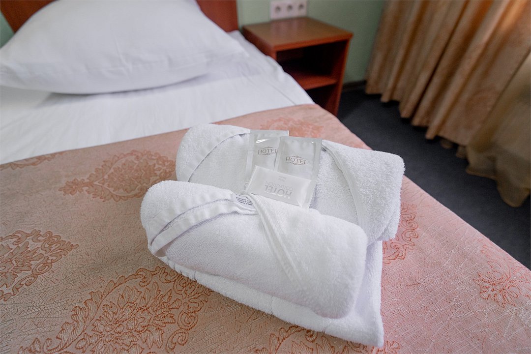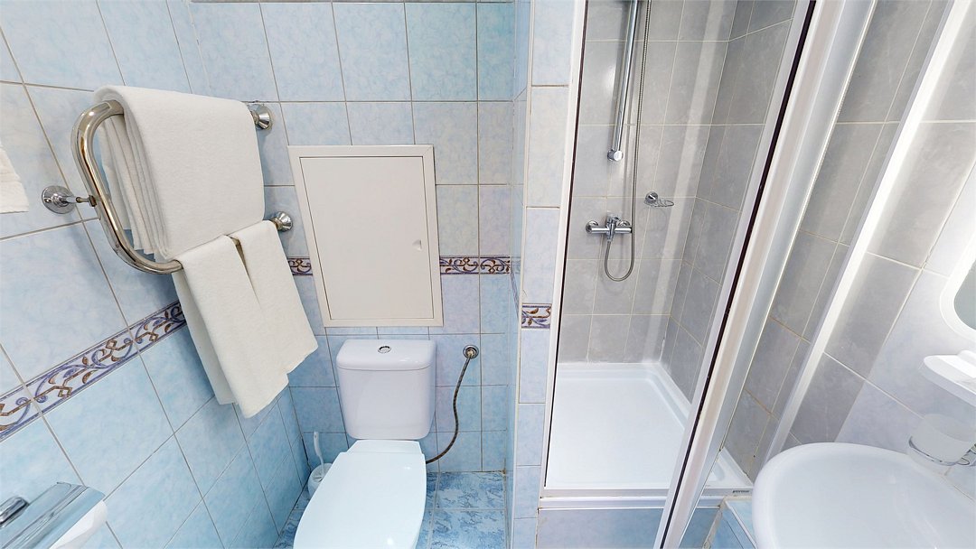 Комфортный номер укомплектован удобной односпальной кроватью, тумбой, шкафом, столом, стулом, зеркалом, телевизором, мини-холодильником, комплектом полотенец, необходимыми туалетными принадлежностями, WiFi. Номер находится в блоке с номерами категории "Эконом", санузел общий на два номера.Услуги и удобства